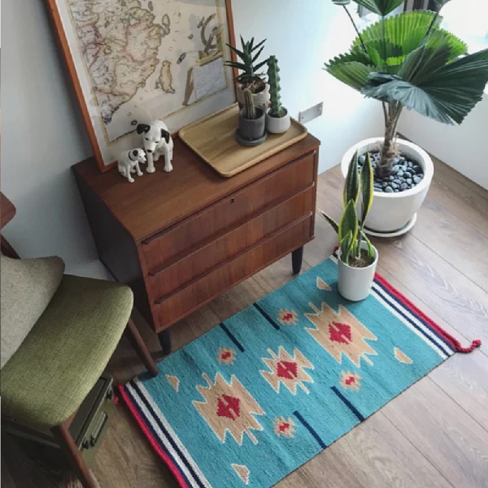 ↑ Mexican Woven Carpet 幾何墨西哥編織地毯 土耳其藍 / 滾紅邊 (商品連結)