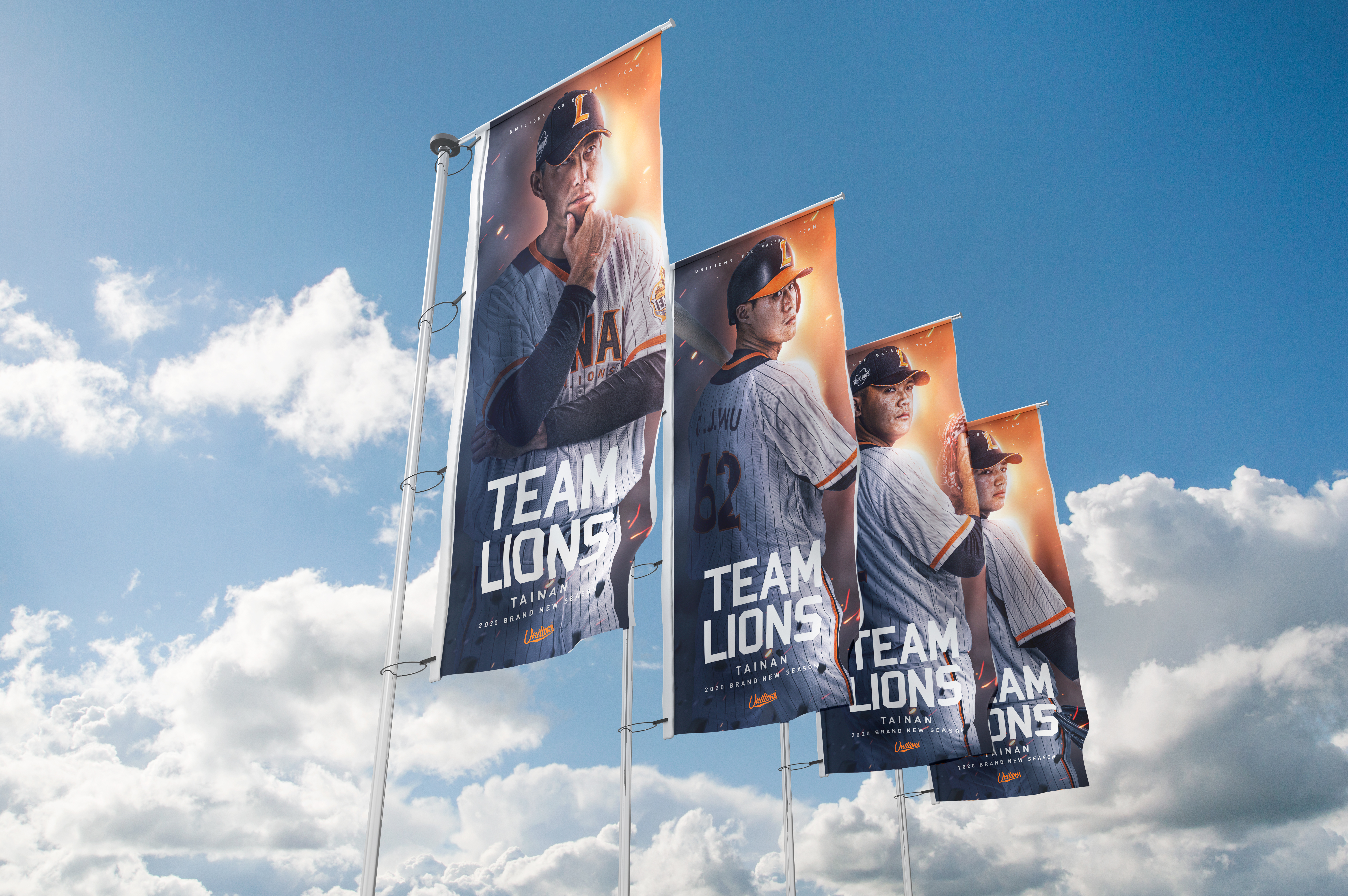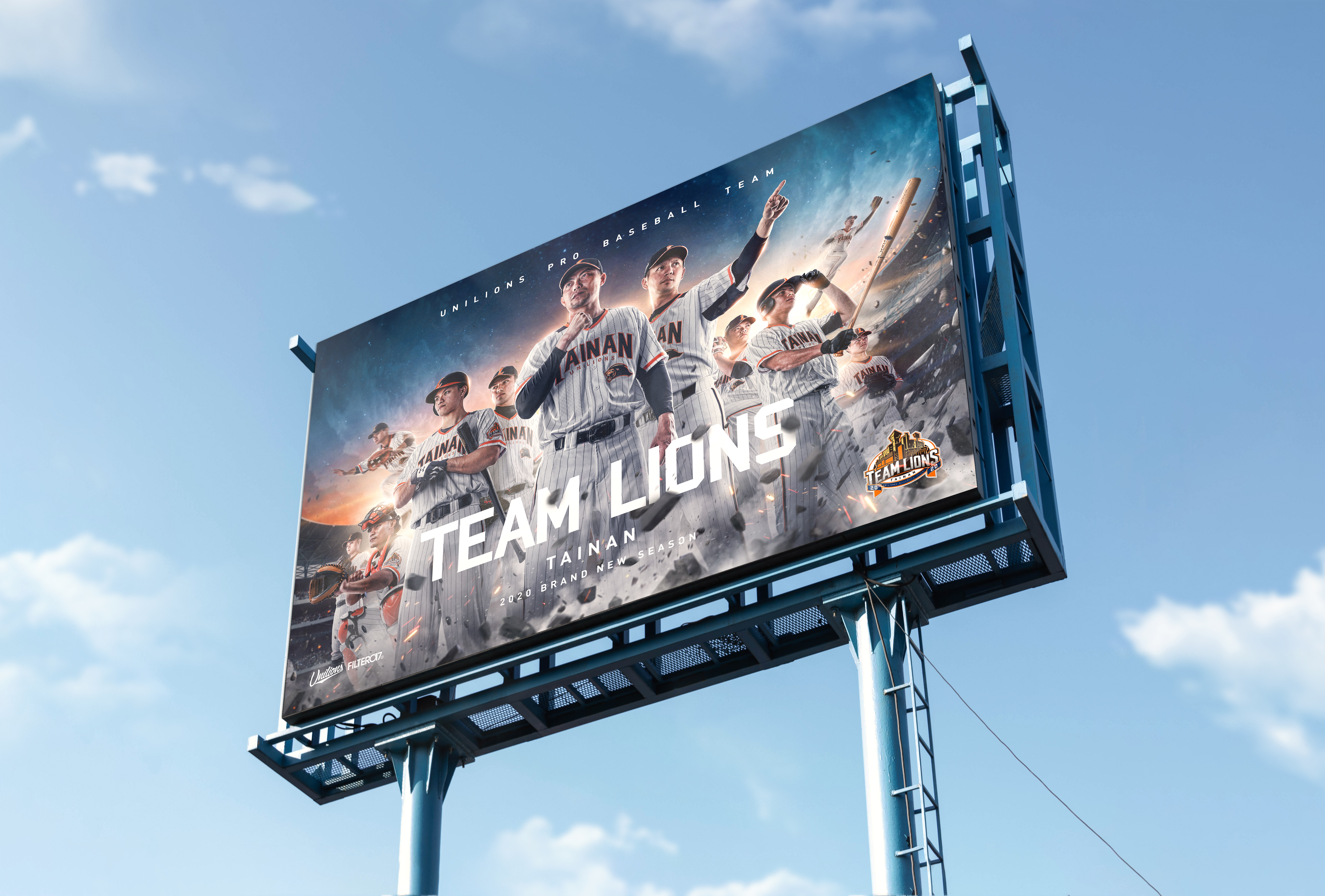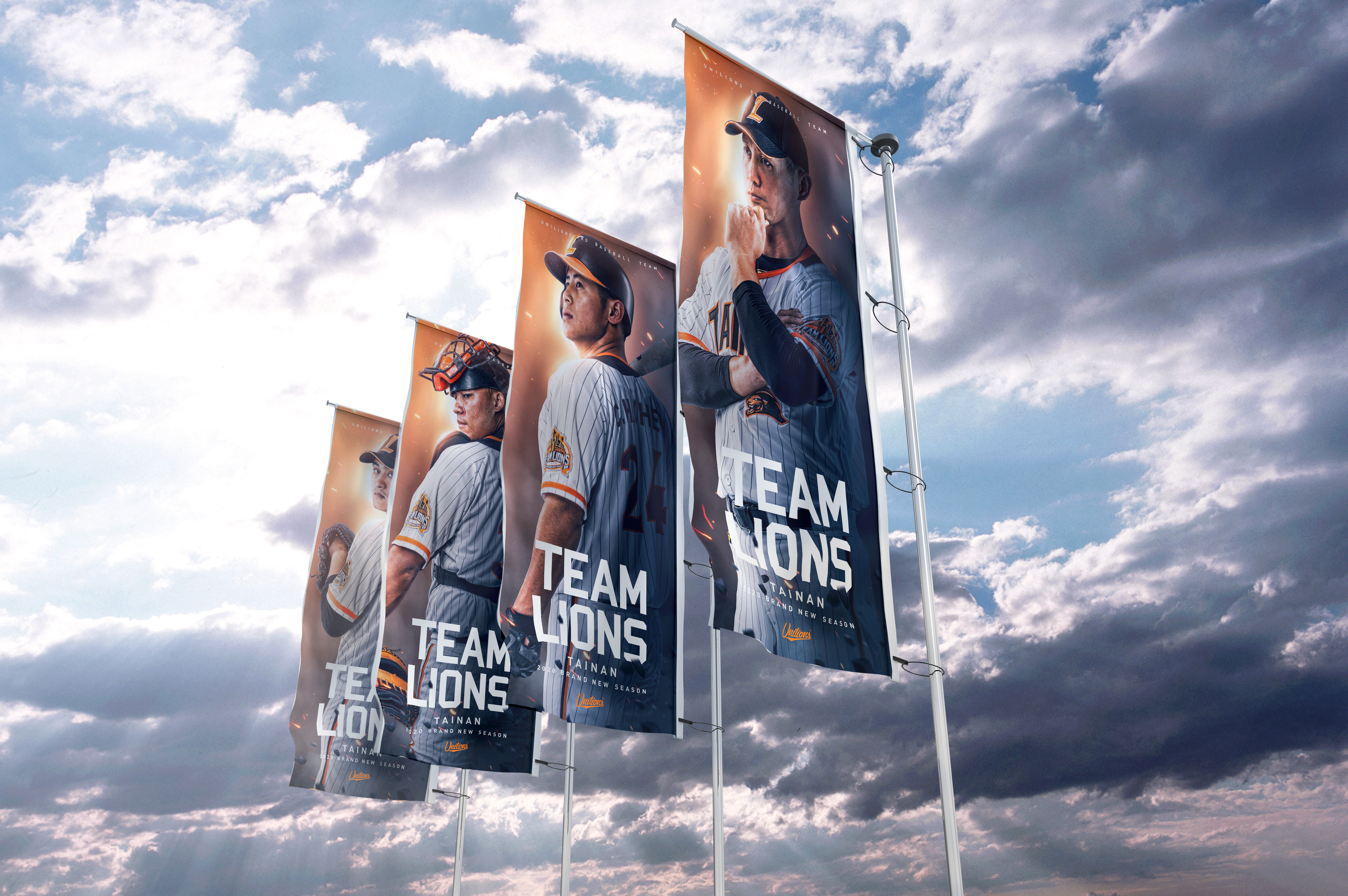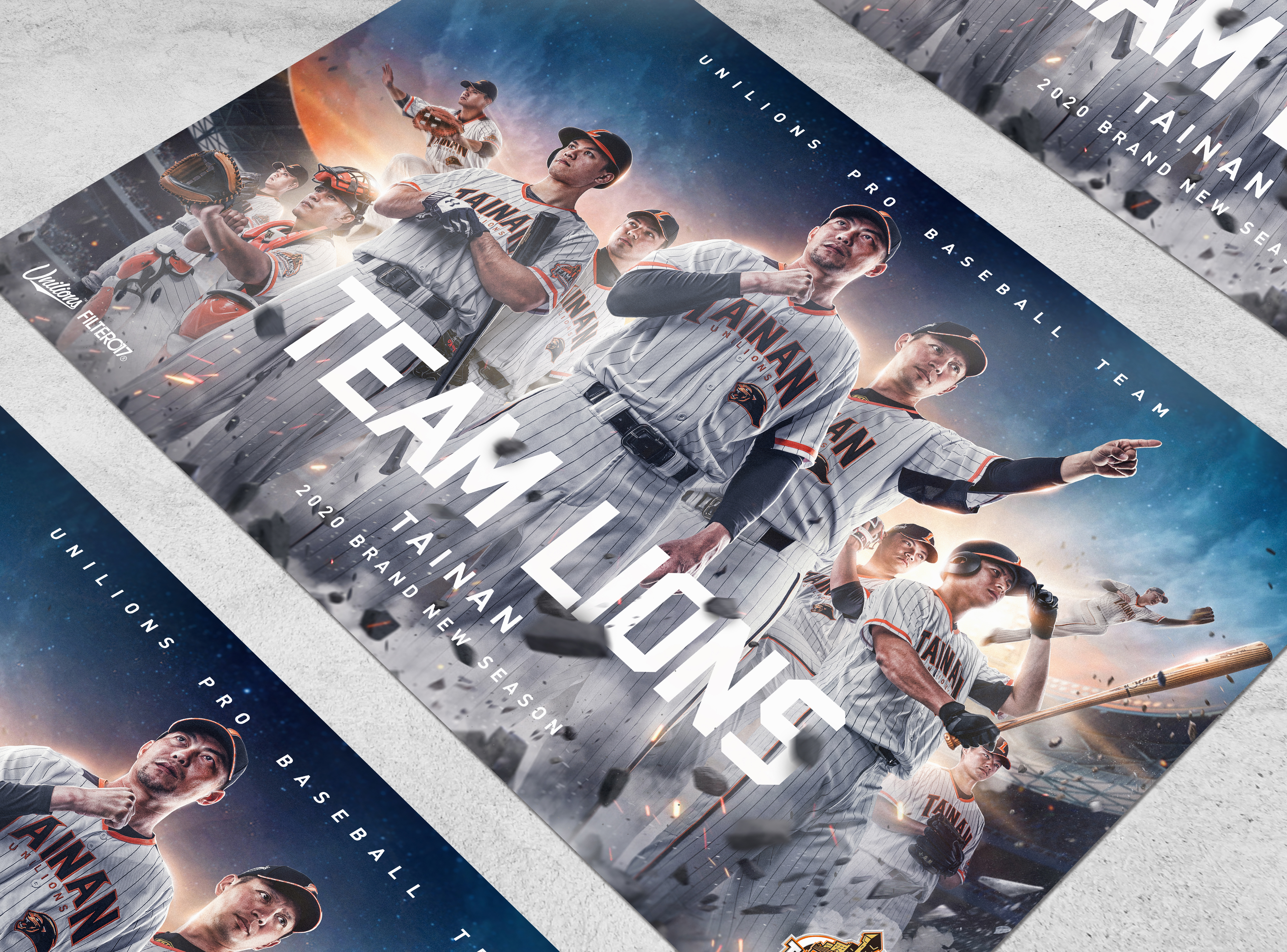 主視覺以台南TAINAN經典條紋球衣與年度主題口號 「TEAM LIONS」作為主題呈現與貫穿元素,以「超級英雄」電影視覺為概念,透過獨特的仰角拍攝手法,彰顯人物氣勢磅礡的意象,藉由浩大的藍色星空、碎石、火光點綴與光線對比之效果,強調榮耀歸來的經典時刻。