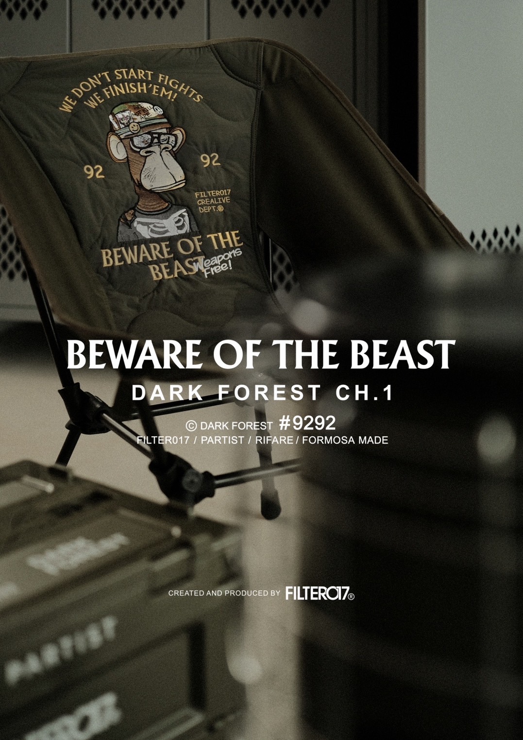 此次 Filter017® 特別將此作品視覺及概念延伸於多項帶有軍事風格的限量主題單品,其中包含「主題紀念TEE恤」、「刺繡衍縫戰術背心」、「刺繡衍縫戰術折疊椅」以及將改造後的(BAYC)#9292無聊猿立體化的「戰爭胸像/戰術摺疊箱 紀念套裝組」,將於 2022 OneOffs NFT 國際藝術博覽會 正式亮相發表展出。(以上商品正式發售日期及販售方式尚未公布,敬請持續關注 Filter017 官方訊息)