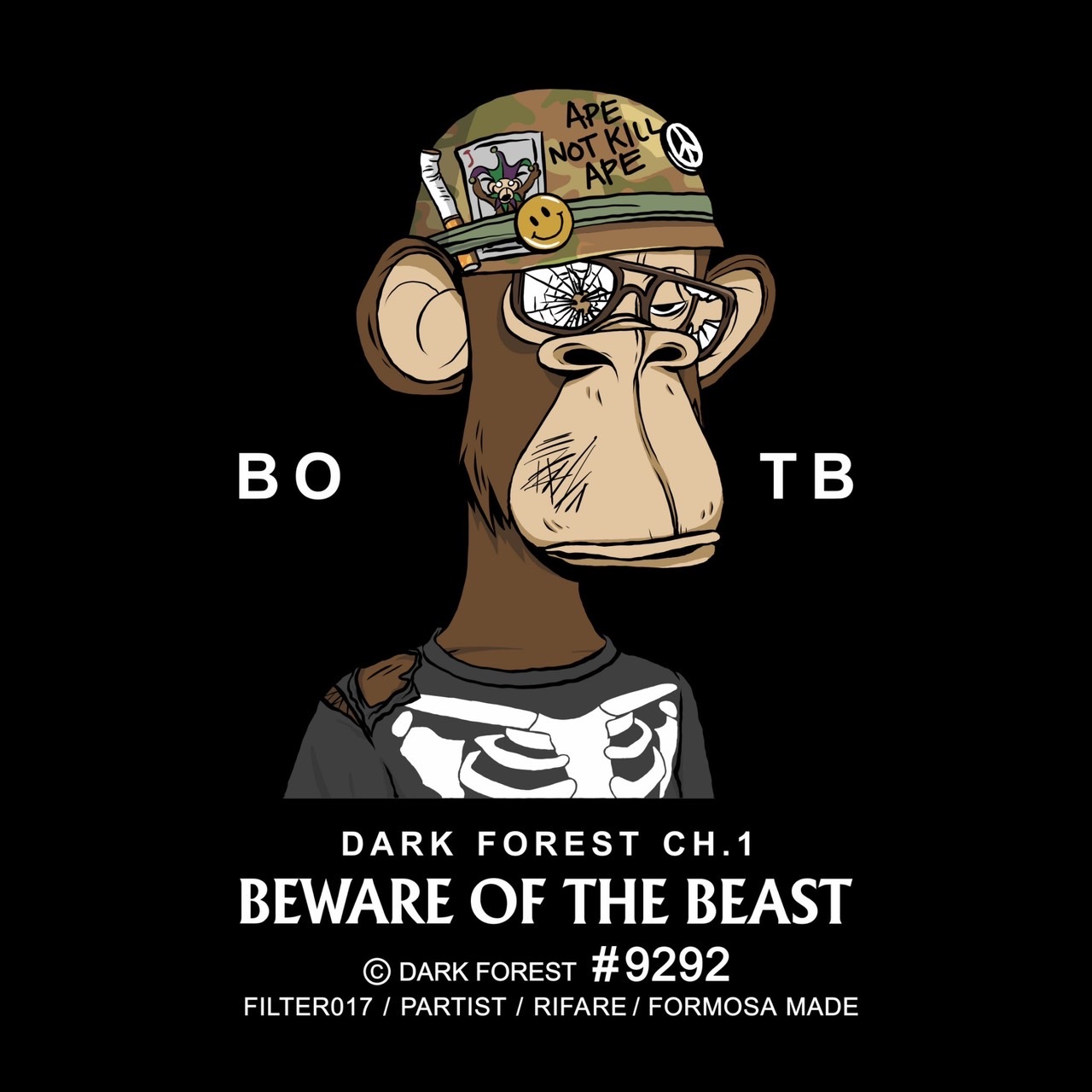 BAYC#9292 這隻「無聊猿」透過 Filter017® 擅長的元素混合語彙,保留原作特色為前提下進行重繪創作。以「黑暗森林法則」與反戰議題為核心靈感,重新演繹出這隻沒有武器(非主動侵略攻擊),暗喻正當防衛、小心掩護躲藏確仍然受到攻擊而鼻青臉腫的無聊猿型態。
