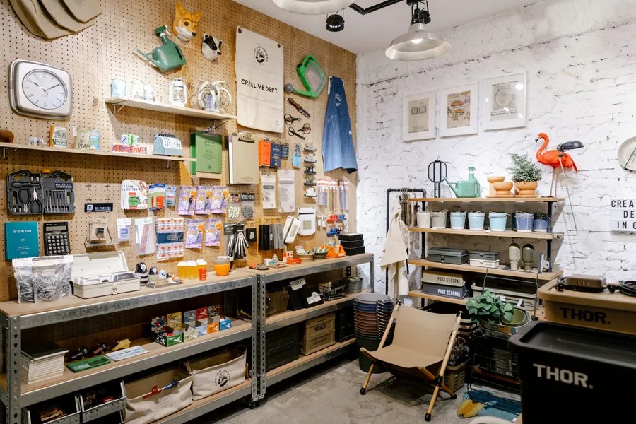 採訪當天正好遇上 Crealive Dept. 大清倉活動,在 6 月即將進行室內局部整修以迎接新面貌和品牌。踏入一樓店面,映入眼簾的是充滿生活感的休閒工裝、墨鏡和小件杯具等;地下室是日本的五金雜貨、大型道具;二樓則是 5 年前才規劃的「In/Out」生活戶外選品,除了自有品牌以外,也引進許多日本、美國、韓國等知名戶外露營品牌,提供喜歡露營的人更有質感、風格的選物,同時希望傳達「在生活中也能保有戶外感」的精神。