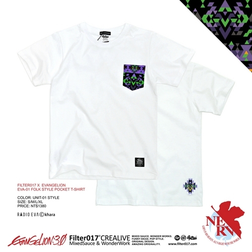 「PATTERN」(圖像底紋)一直以來都是Filter017視覺表現上的拿手戲法,因此本次EVANGELION的聯名企劃,一開始就鎖定以視覺PATTERN做為創意發想的基礎,我們由「EVANGELION」造型及色彩上解構、演化出獨一無二原創的「EVA印第安民族風格圖騰」,並以「使徒」造型簡化設計而成潮流元素「玉點底紋」,最終以這兩大視覺之設計基礎進行延伸一系列商品。