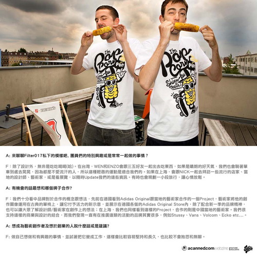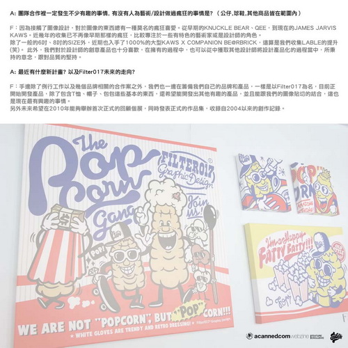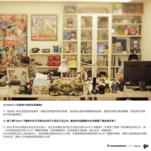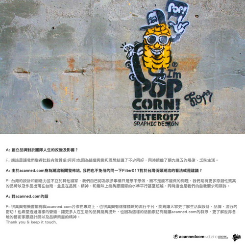 非常感謝華人流行文化網路媒體 acanned.com 的專訪邀請,Filter017團隊經過了長久以來的努力,始終希望能夠在路線上不只得到設計以及圖象創作同好的認同,更希望能夠結合流行這個區塊,得到流行文化這個區塊的肯定。