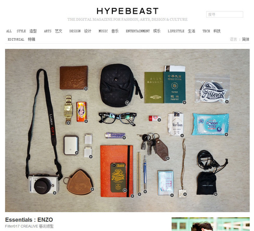 ENZO 是臺灣的創作團隊Filter017 的現任藝術總監,也是創辦人之一。Filter017 于2004年成立,現在的全名為「Filter017 CREALIVE」,「CREALIVE」是Creative 跟Live的合成字,可見品牌銳意要將設計與生活連結,從身邊的不同事物中擱取設計靈感,並再以不同範疇的設計去回饋生活。ENZO領軍的Filter017 成立雖然不足十年,但已經是現在於臺灣最有影響力的設計單位之一,曾與多個世界級品牌合作,並沖出臺灣,走向國際性的地位。今次我們就讓大家一覽設ENZO 平日的隨行配備,當中沒有以品牌掛帥,反以實際需要為依歸,但概這種在創意設計以外的務實,也是設計界中成功的重要條件之一。
