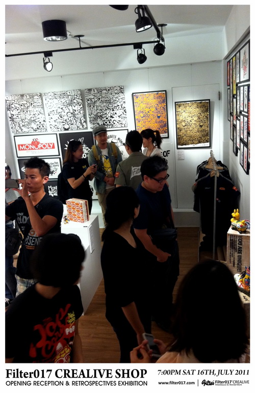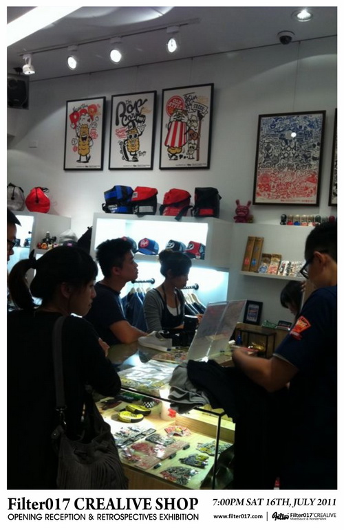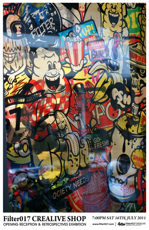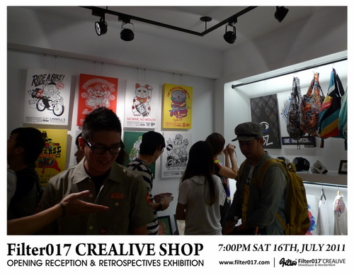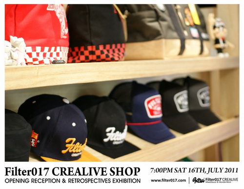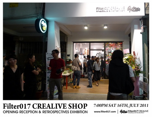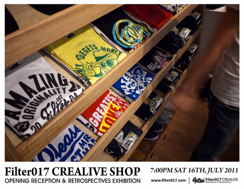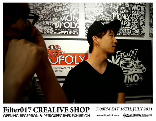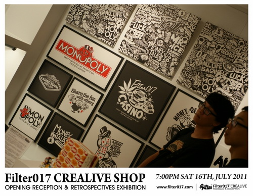 藉由首間台中概念店正式開幕,舉辦了Filter017這6年多來團隊創作錦集的回顧展,這次展覽的內容包括了Filter017經典以及聯名合作的作品集選,以及國內外設計及藝術同好所致賀的聯名作品,也包含了2011年品牌年度主題”CASINO LIFE”的概念完整呈現,並且推出在開幕當天將近銷售一空的CASINO LIFE限量手工網版海報。 ”CASINO LIFE”主題主要反映的是有關於生活、人生、賭博、虛榮、金錢、慾望、暴力以及資本主義... 等等話題,Filter017希望透過圖像與經典的標語字體,將這些話題連結,以反諷、幽默以及輕鬆的方式加以詮釋,也不難發現有許多值得細細玩味的圖像演繹,並且值得在幽默與反諷的圖像下思考。