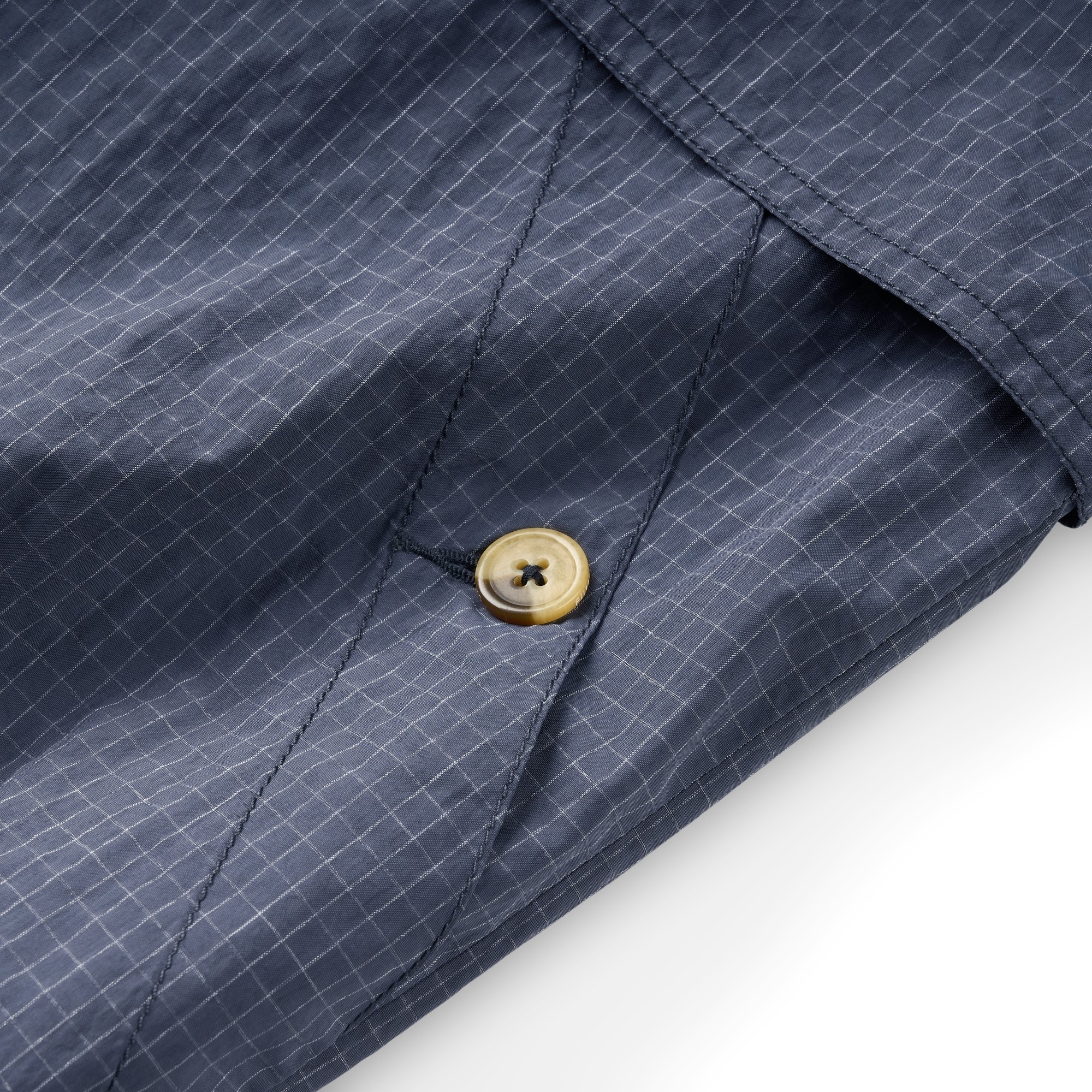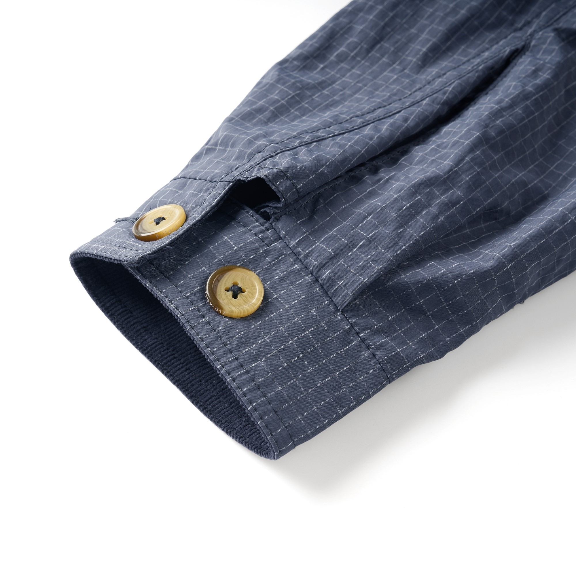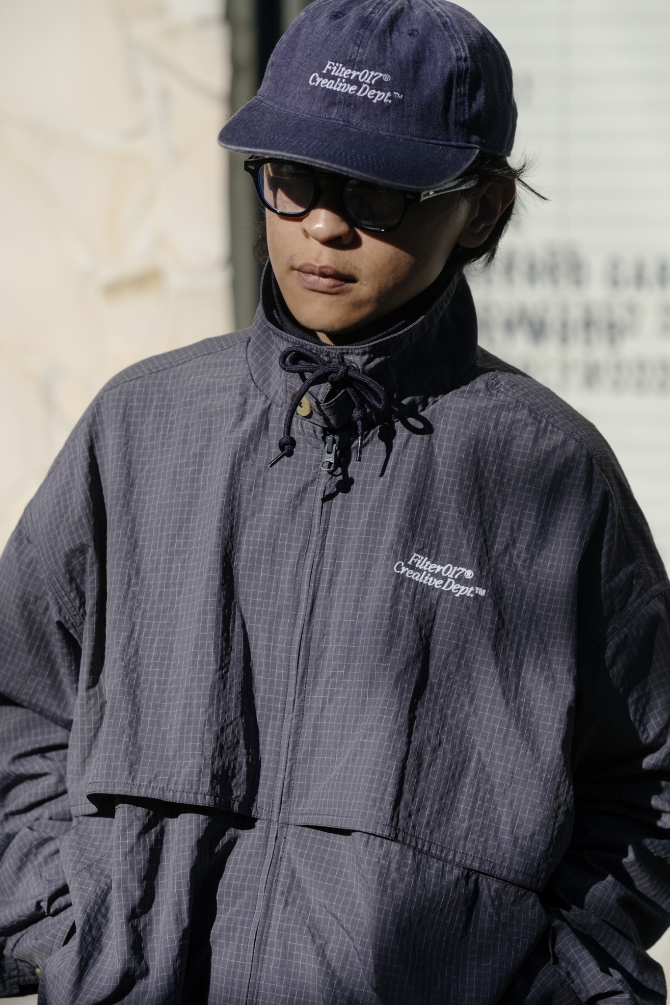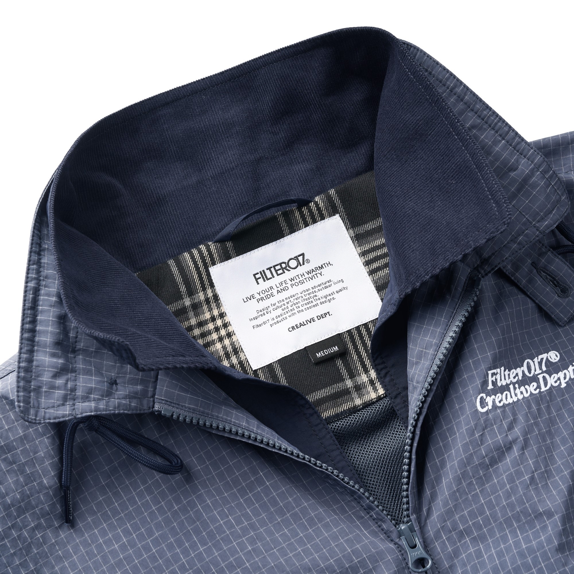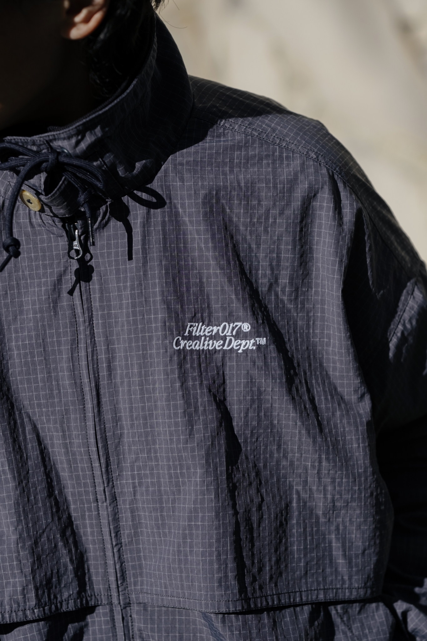 面料使用上則充分銜接流行性與區域氣候,因應亞洲地區多功適用機能,以輕量、防風、防潑水的平織格紋抗撕裂尼龍材質為主體,大面積細目透氣網布內裡及前後蓋片式透氣剪裁設計,穿著搭配與情境轉換實用度上更為靈活便利,滿足防風與搭配層次需求且四季皆宜。背後立領及胸前以精緻工藝刺繡,領口調節裝飾綁繩以品牌字樣包頭設計,更是展現滿載質感與誠意。