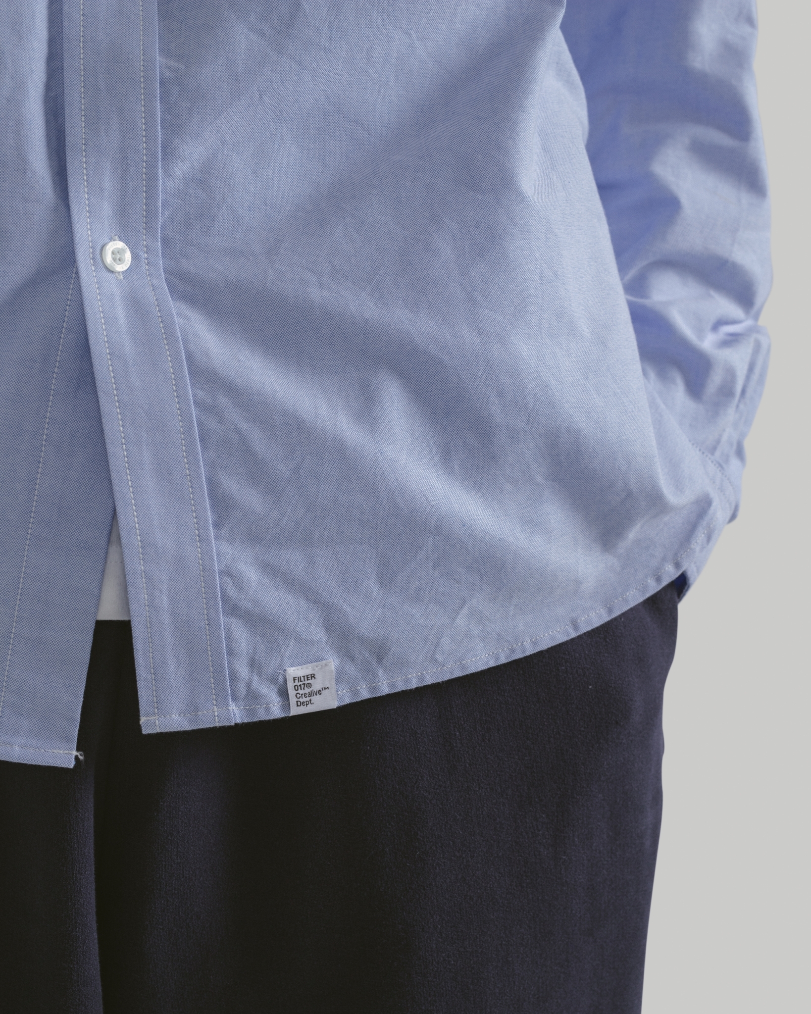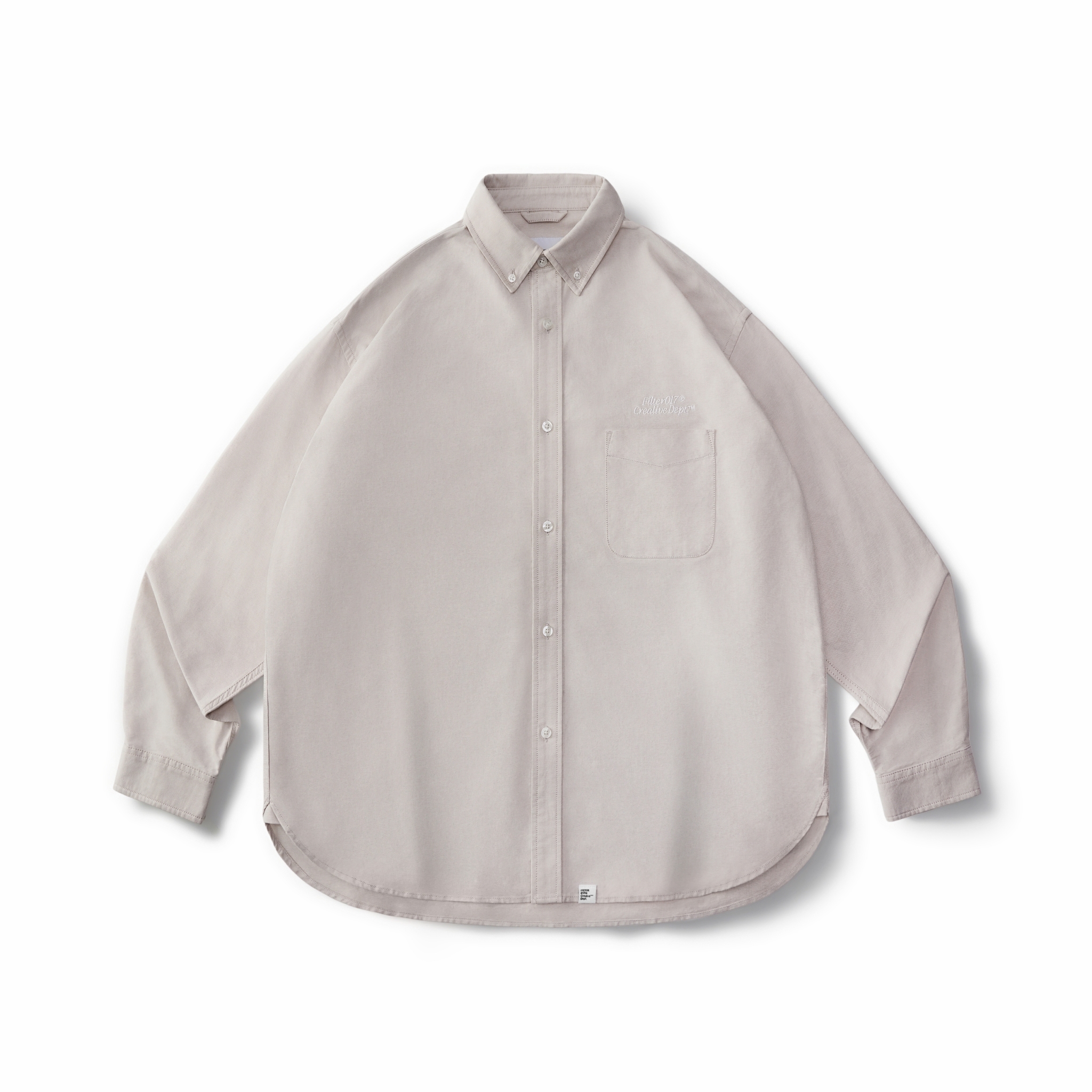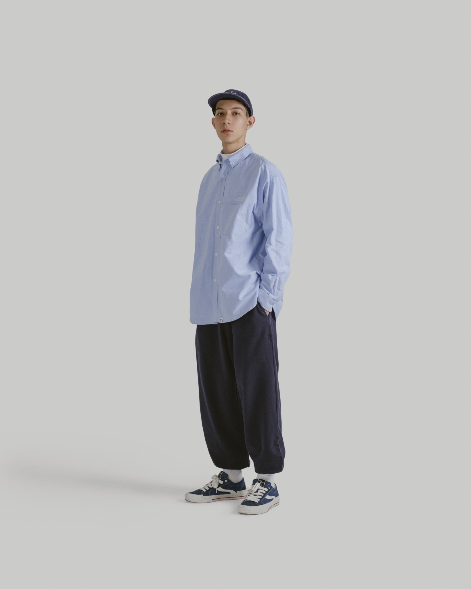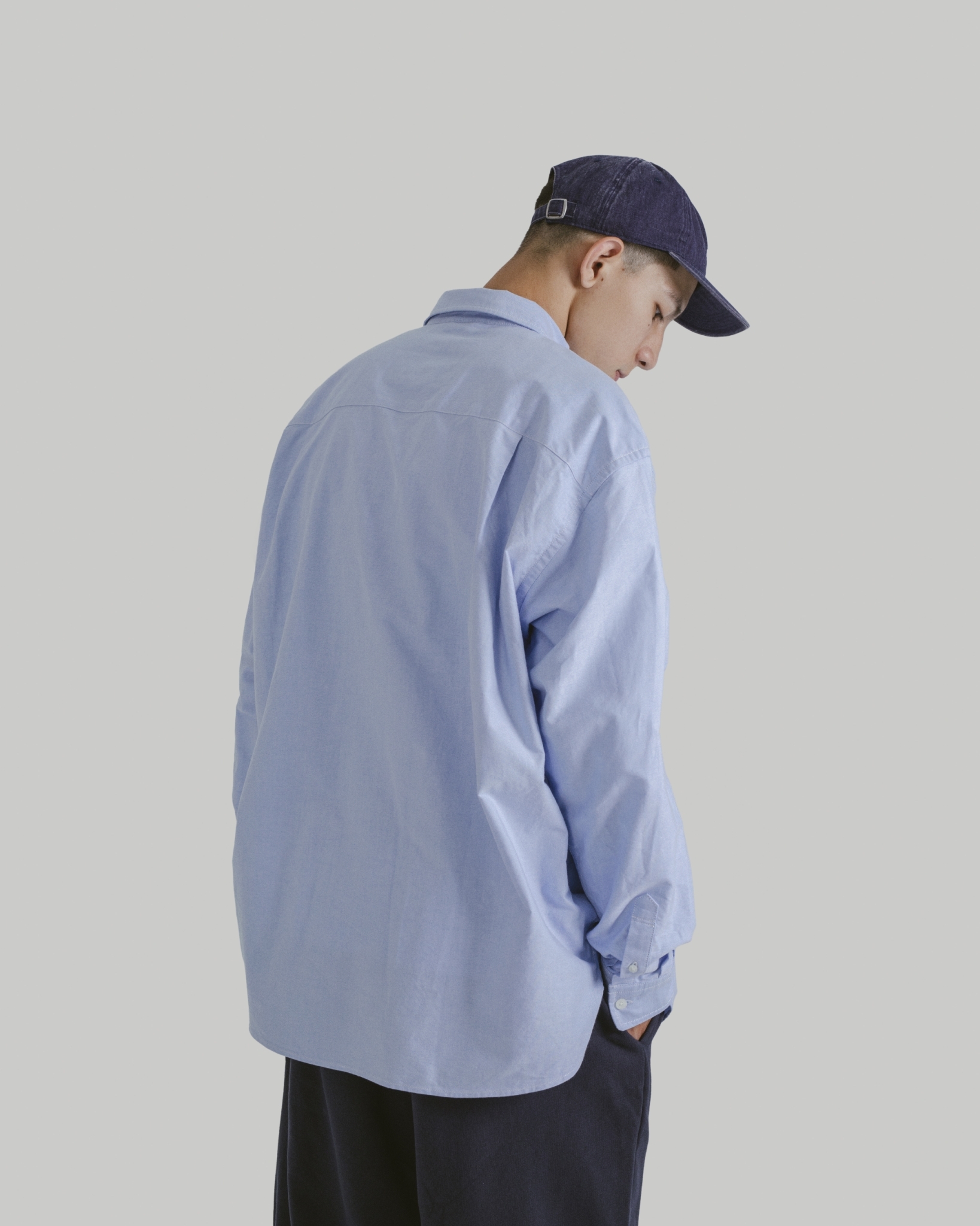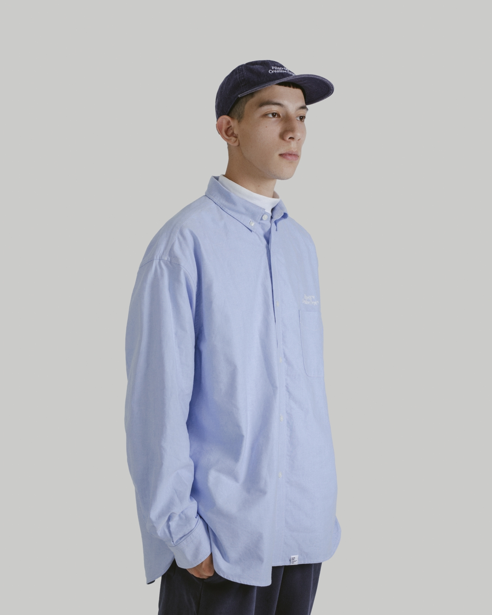 以寬版輪廓版型為基礎,加上前短後長的下擺於兩側開衩以三角裁片加固,並在左右肩胛處以活折剪裁,增添行動時的延展空間使之更加舒適。特選質感極佳的純棉牛津面料與訂製鈕扣,結合本季品牌經典標語設計字樣刺繡作為視覺點題,為日常穿搭輕鬆營造豐富層次感。