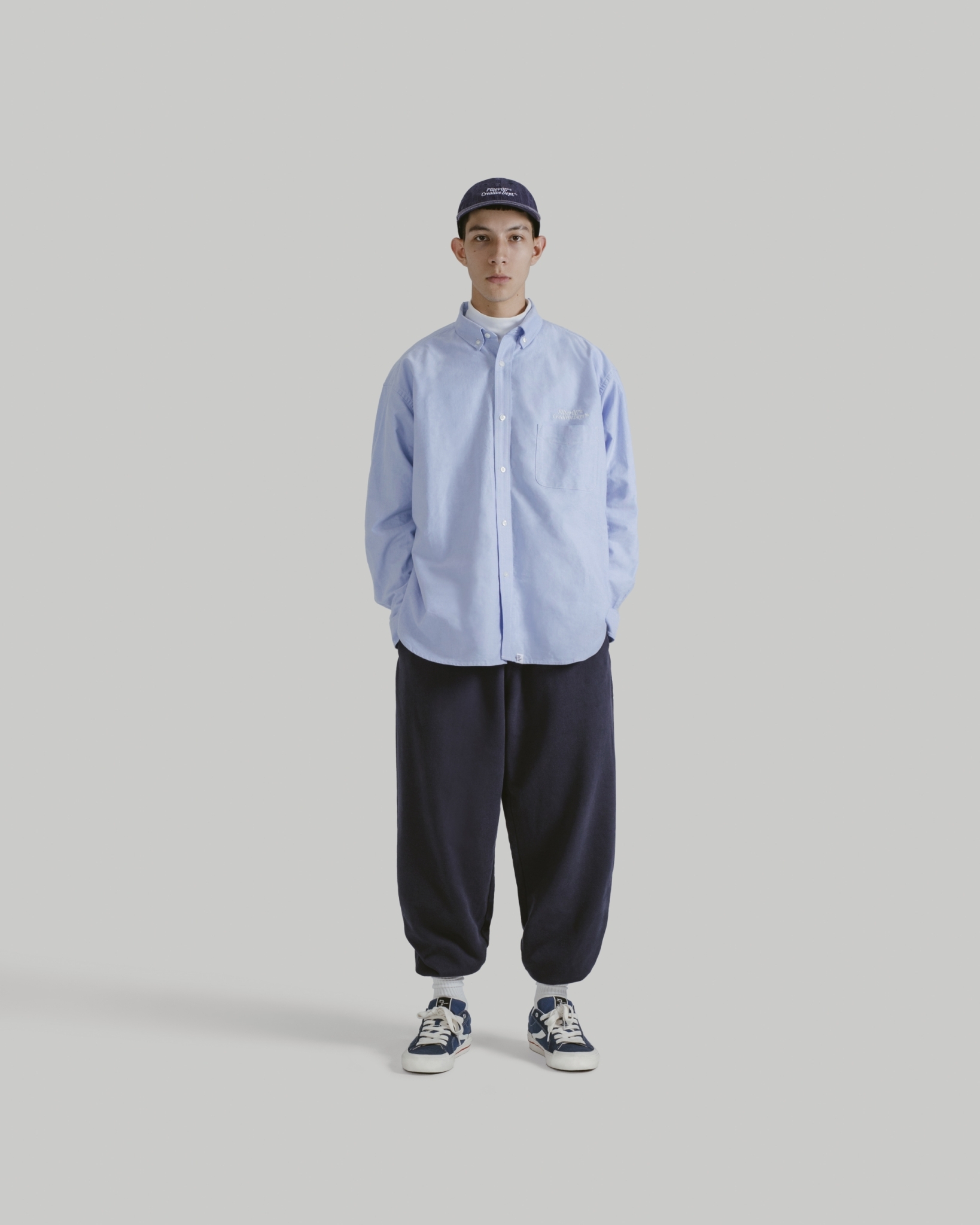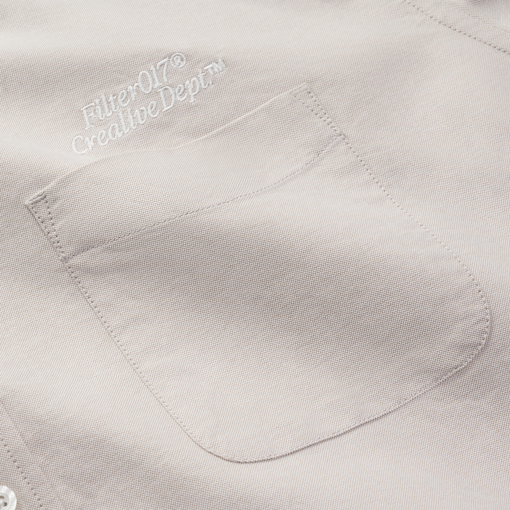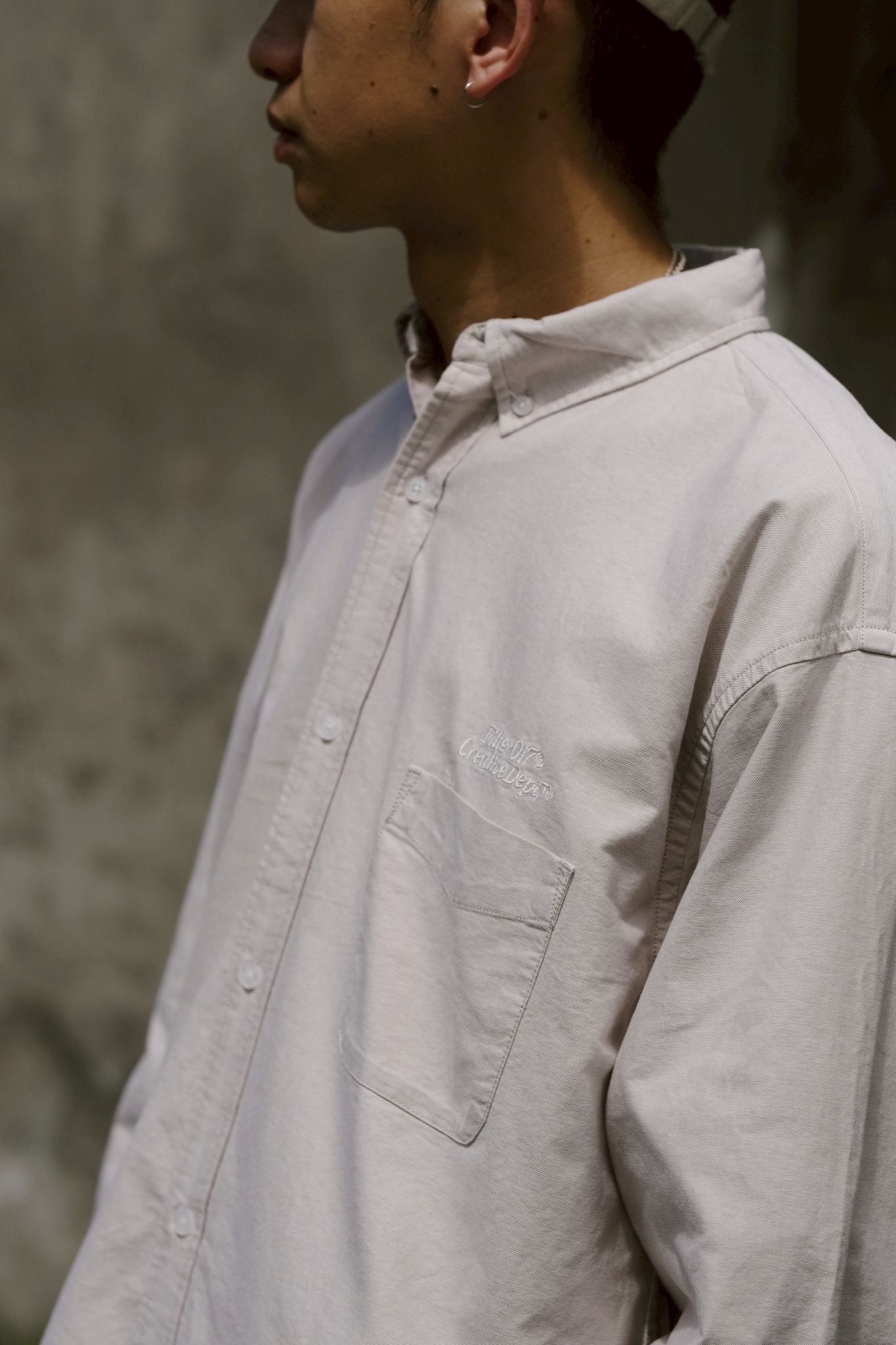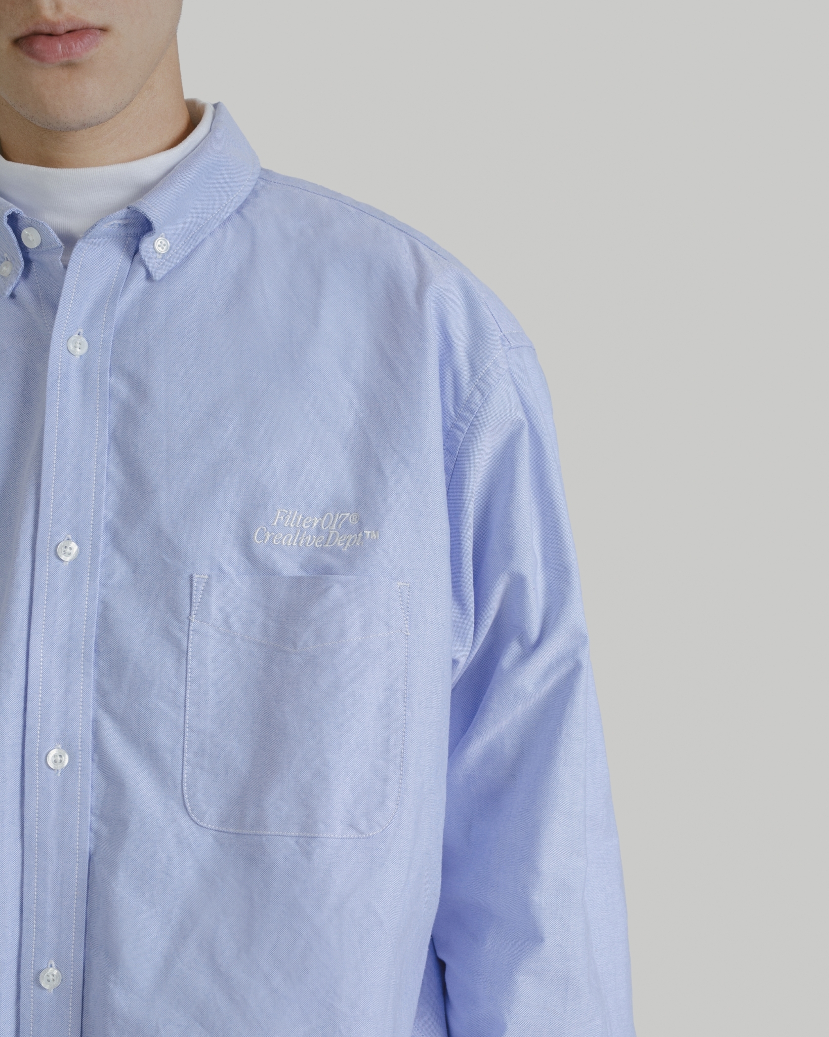 以寬版輪廓版型為基礎,加上前短後長的下擺於兩側開衩以三角裁片加固,並在左右肩胛處以活折剪裁,增添行動時的延展空間使之更加舒適。特選質感極佳的純棉牛津面料與訂製鈕扣,結合本季品牌經典標語設計字樣刺繡作為視覺點題,為日常穿搭輕鬆營造豐富層次感。