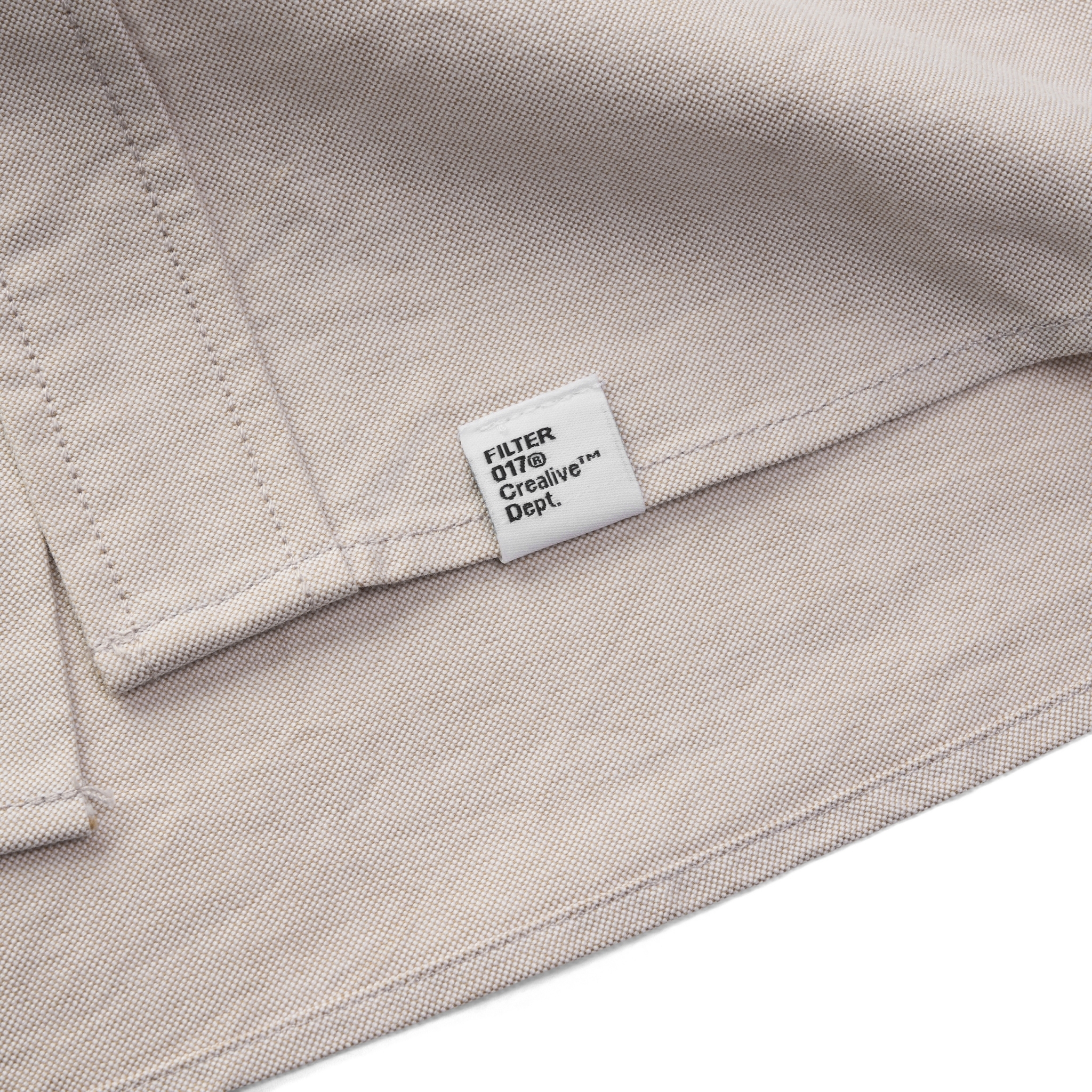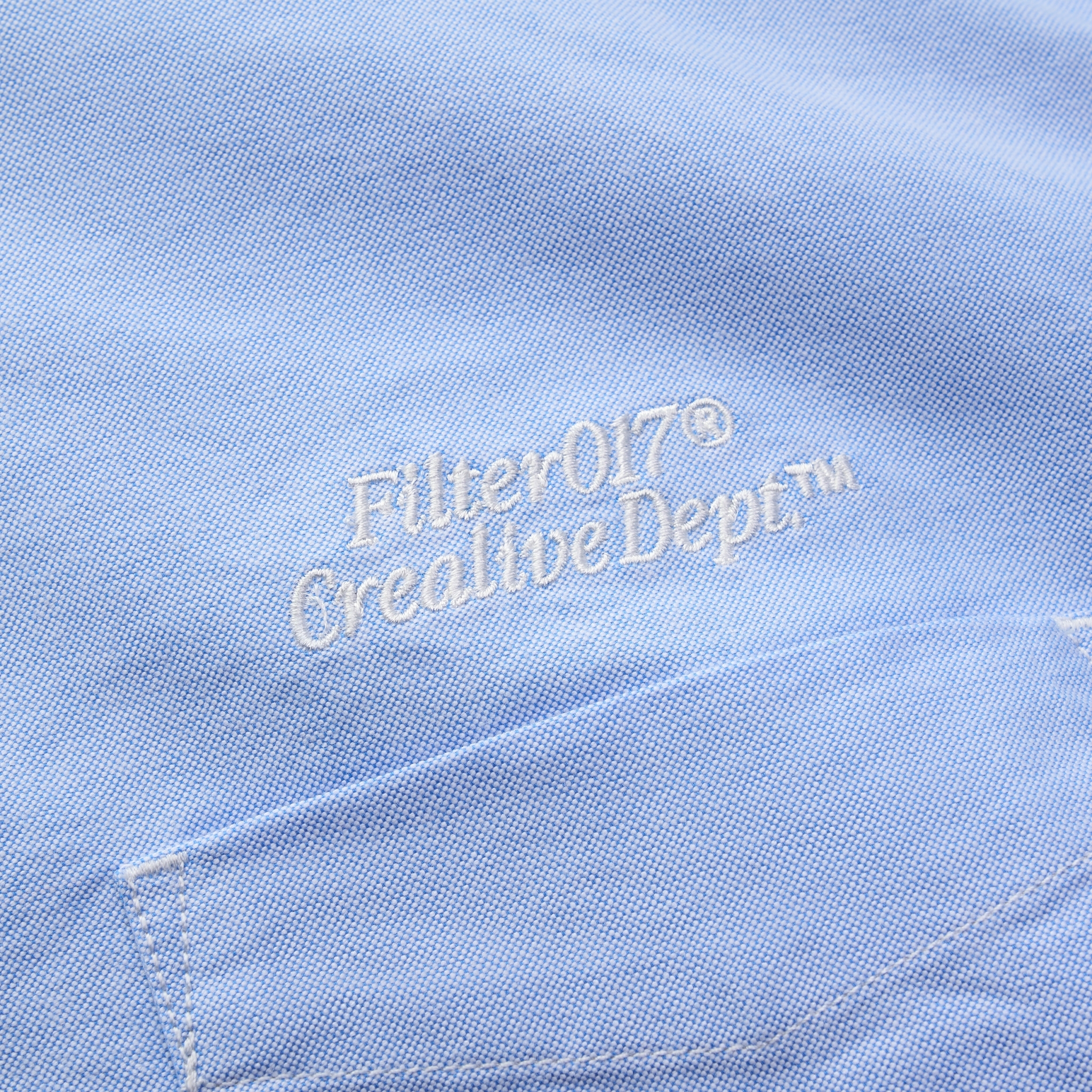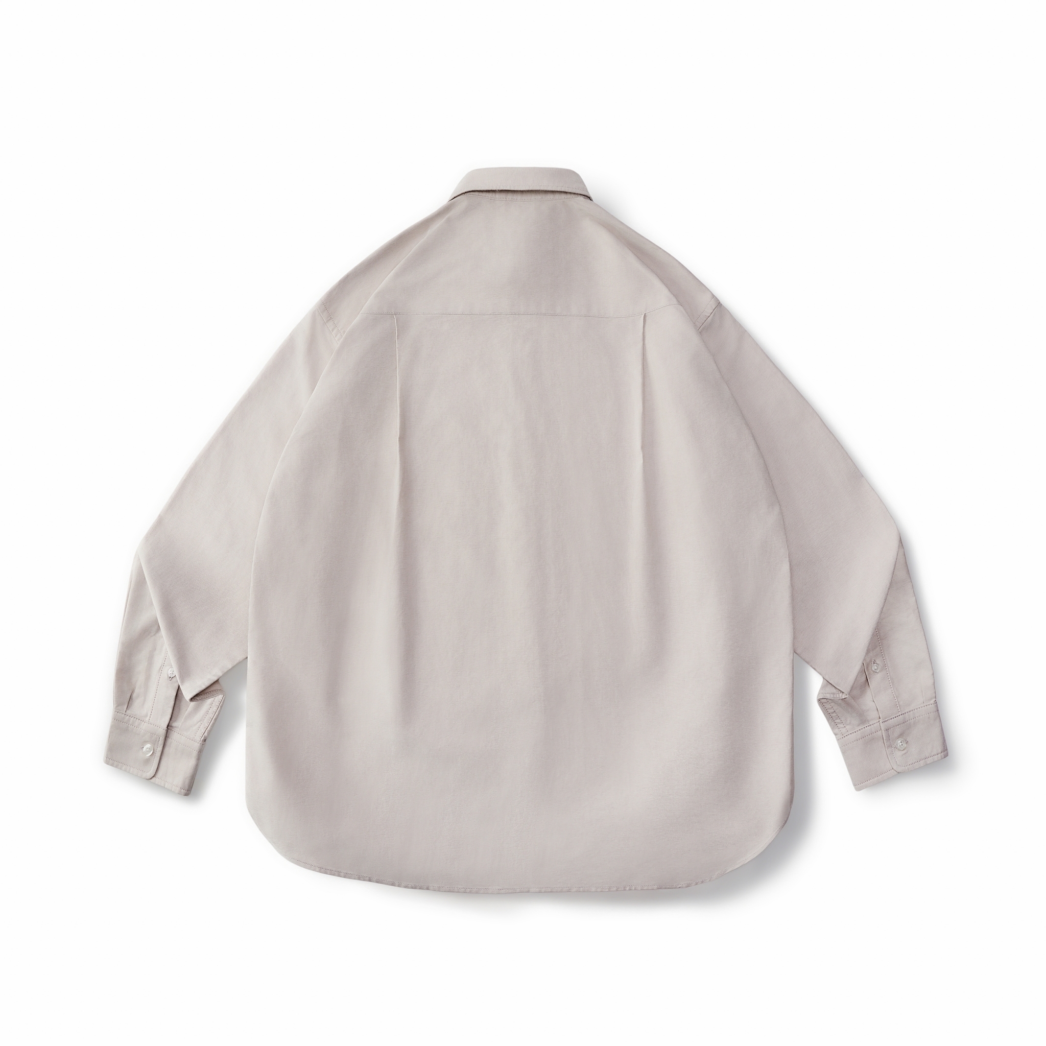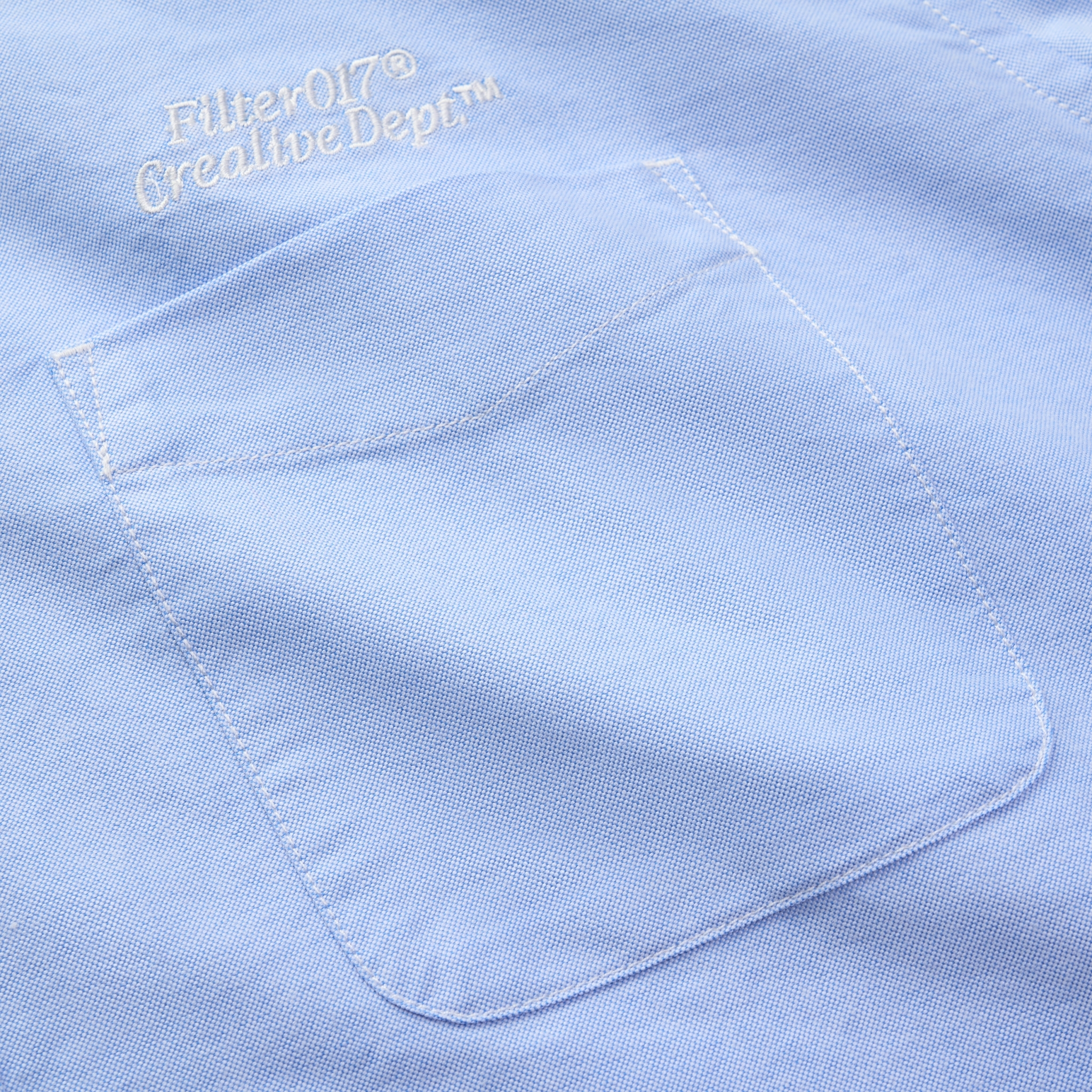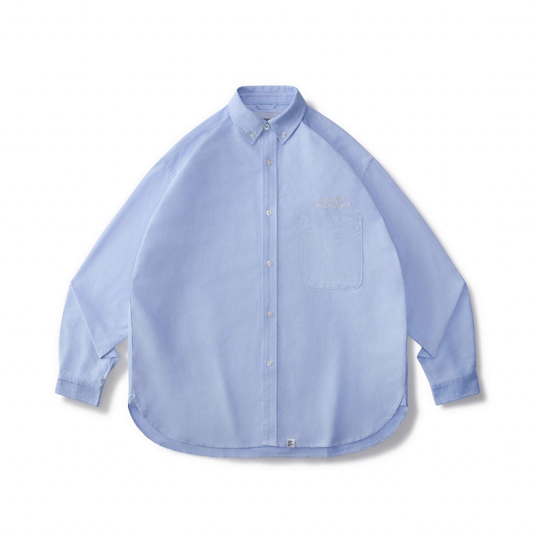 以寬版輪廓版型為基礎,加上前短後長的下擺於兩側開衩以三角裁片加固,並在左右肩胛處以活折剪裁,增添行動時的延展空間使之更加舒適。特選質感極佳的純棉牛津面料與訂製鈕扣,結合本季品牌經典標語設計字樣刺繡作為視覺點題,為日常穿搭輕鬆營造豐富層次感。