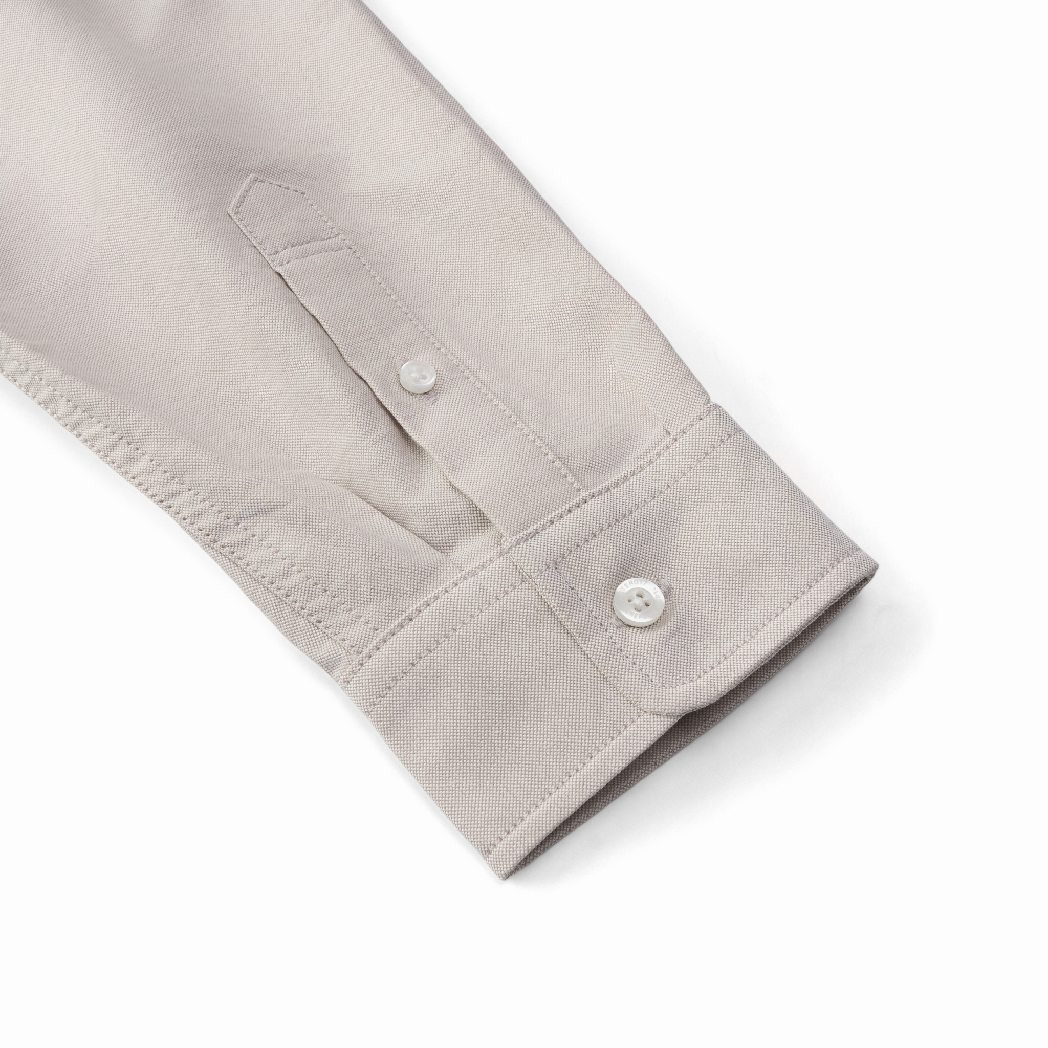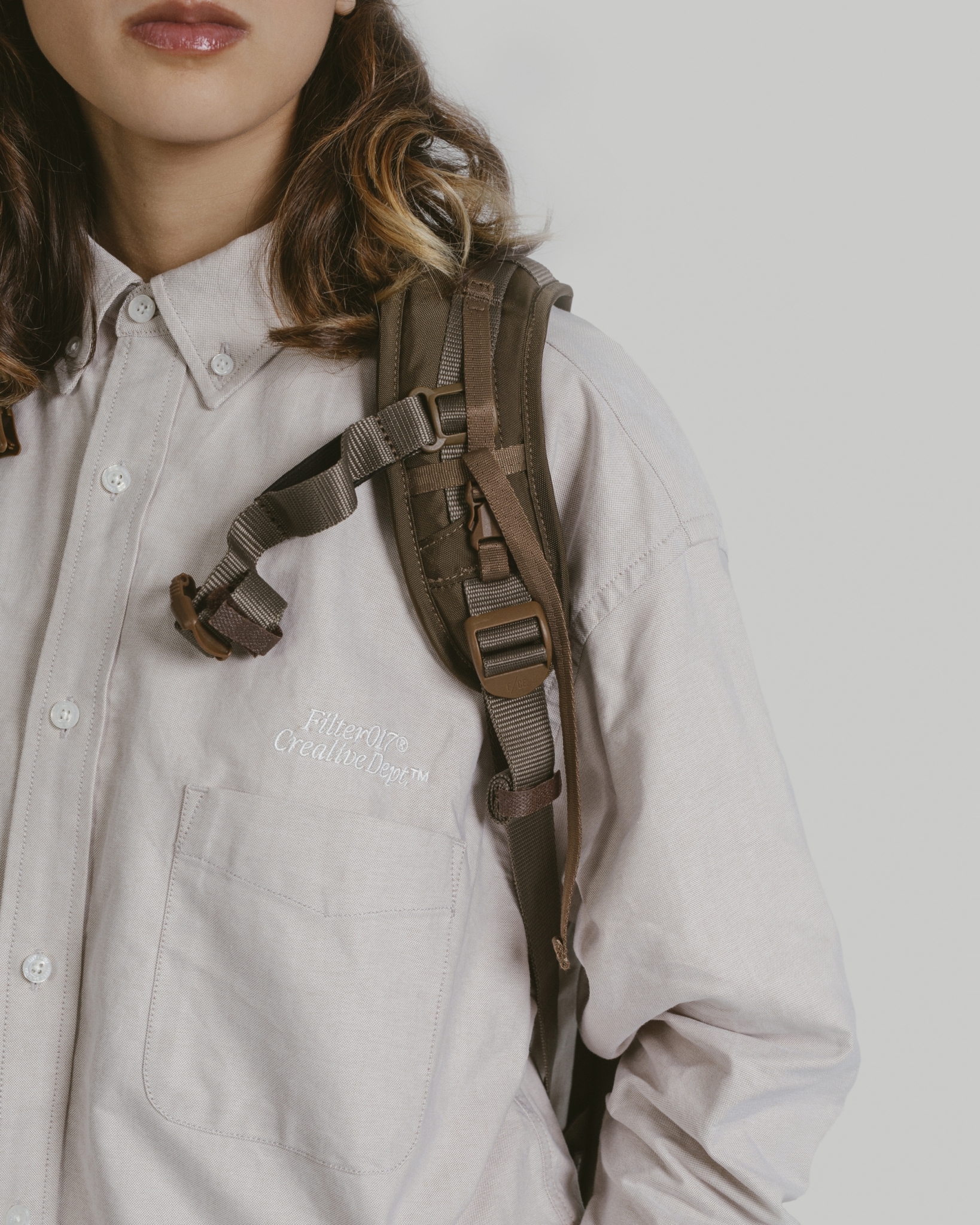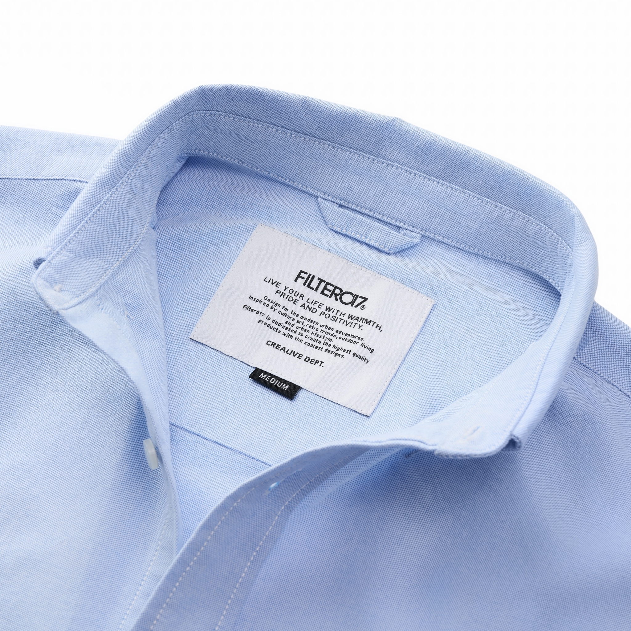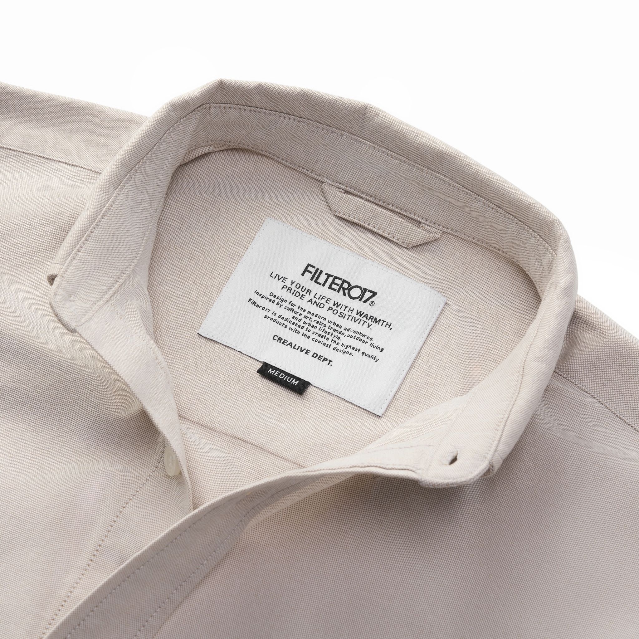 以寬版輪廓版型為基礎,加上前短後長的下擺於兩側開衩以三角裁片加固,並在左右肩胛處以活折剪裁,增添行動時的延展空間使之更加舒適。特選質感極佳的純棉牛津面料與訂製鈕扣,結合本季品牌經典標語設計字樣刺繡作為視覺點題,為日常穿搭輕鬆營造豐富層次感。