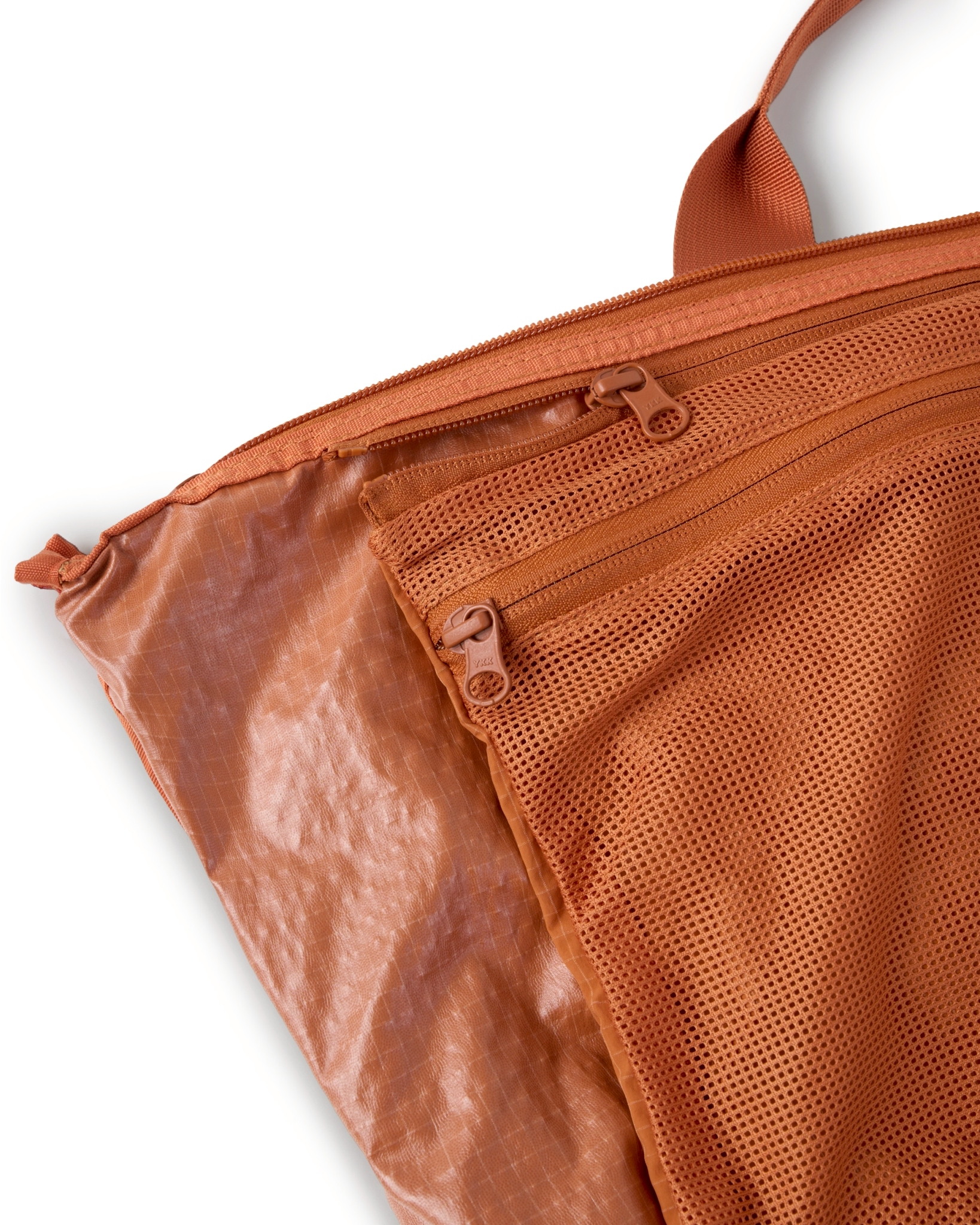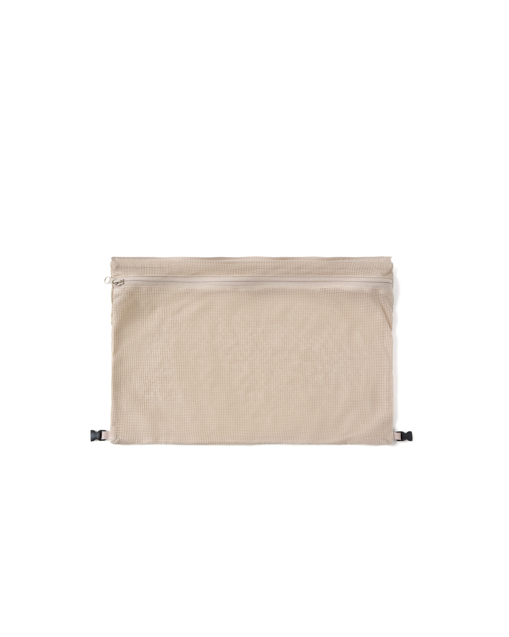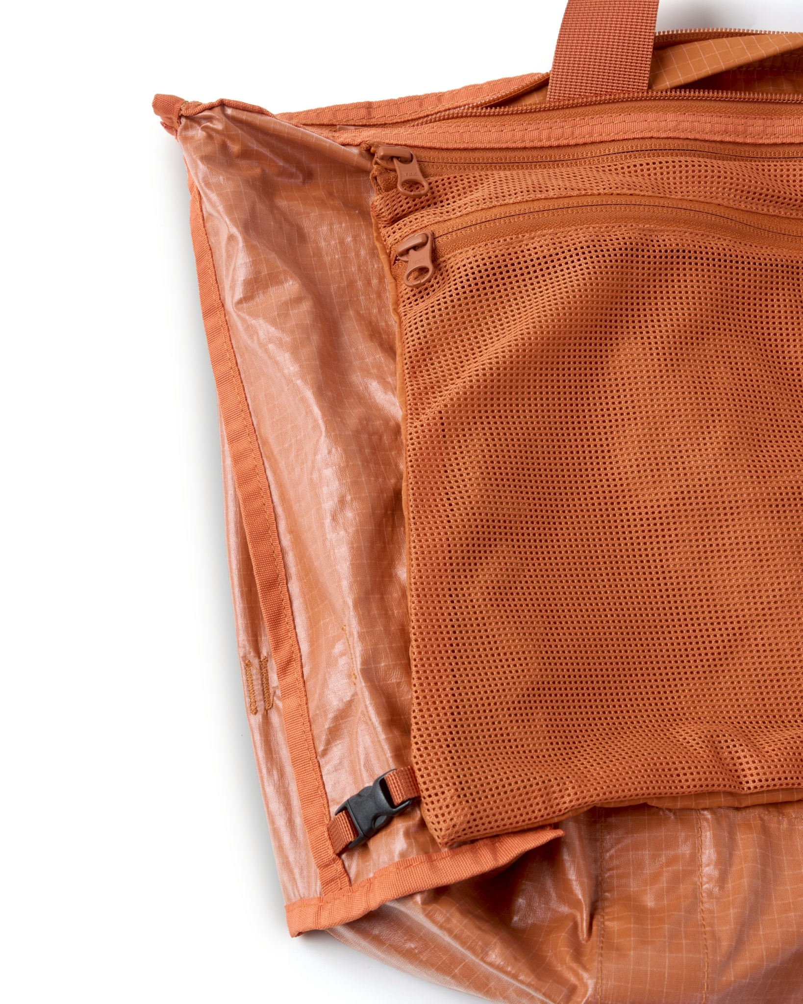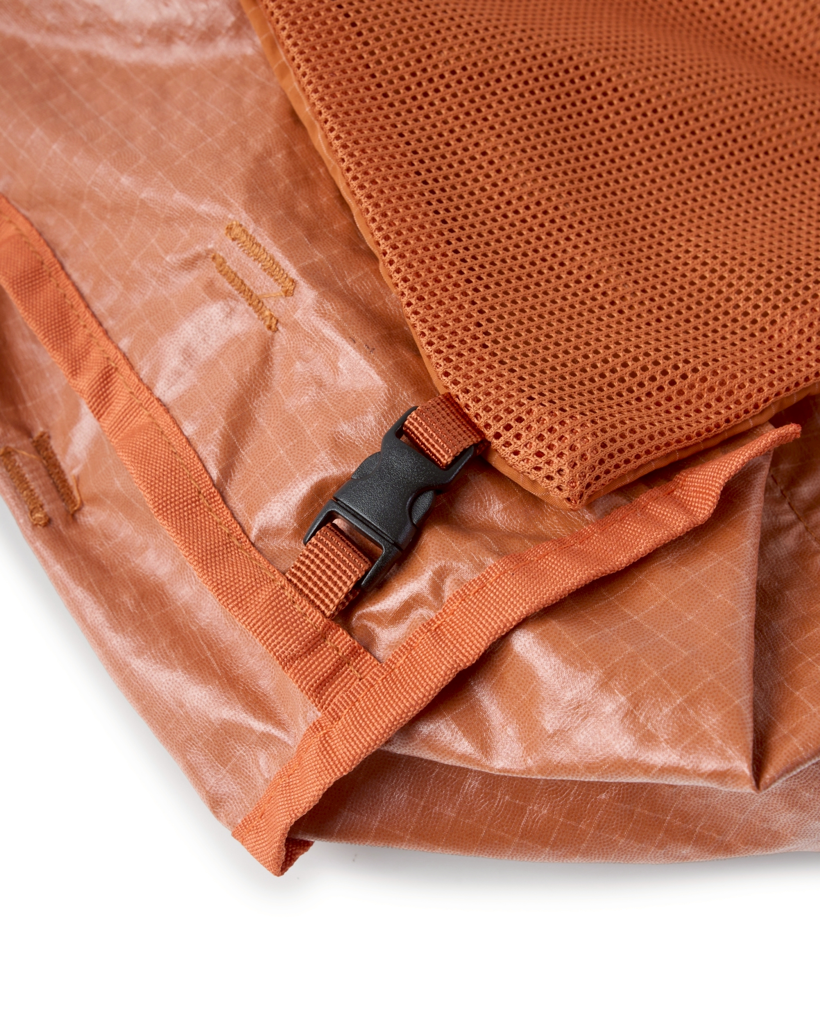主體採高密度防潑水尼龍面料,內貼合防水膜製成,可運用兩側插扣調節包體型態。內扣小包以快速拆卸的滑扣做結合,依需求可當內袋亦或搭配背繩單獨使用。網布收納袋平時作為內裡袋層,以拉鍊與插扣固定,增添收納的多樣化與便利性。整體多面向的結構設定,提供靈活與最大限度滿足於各情境。