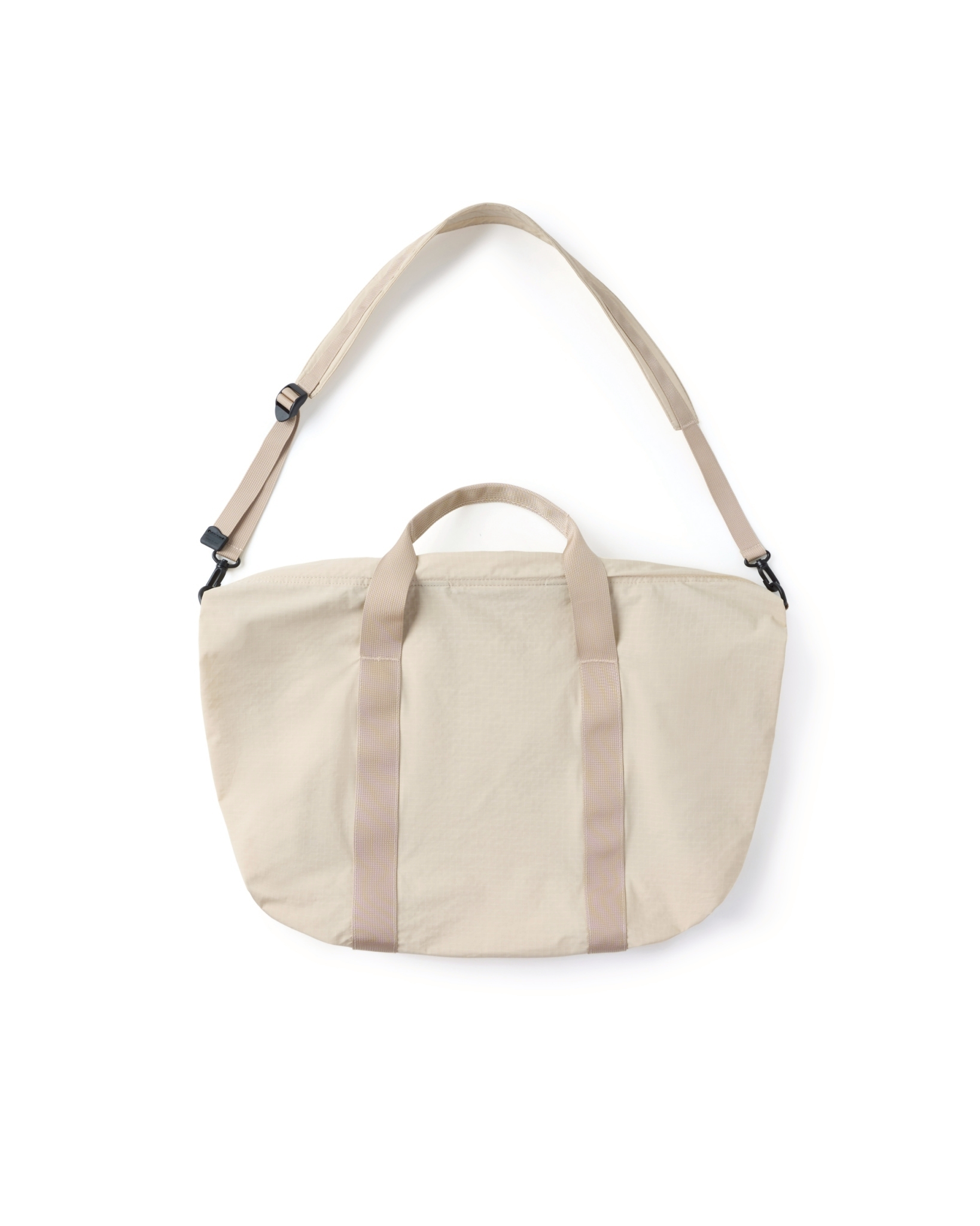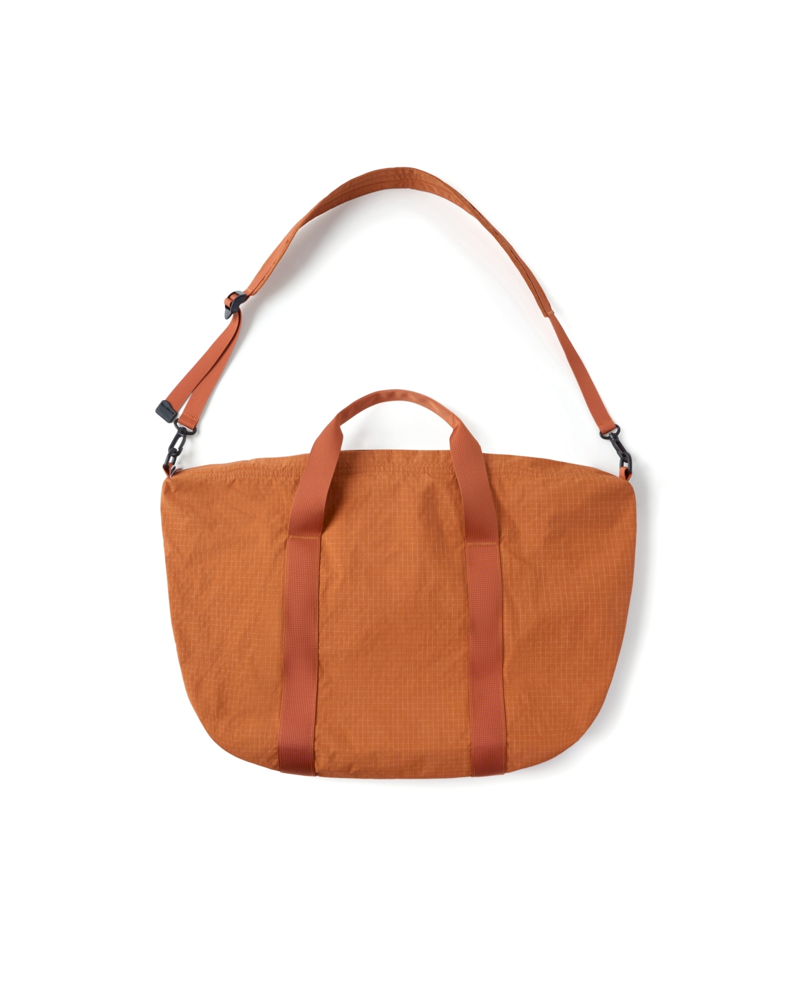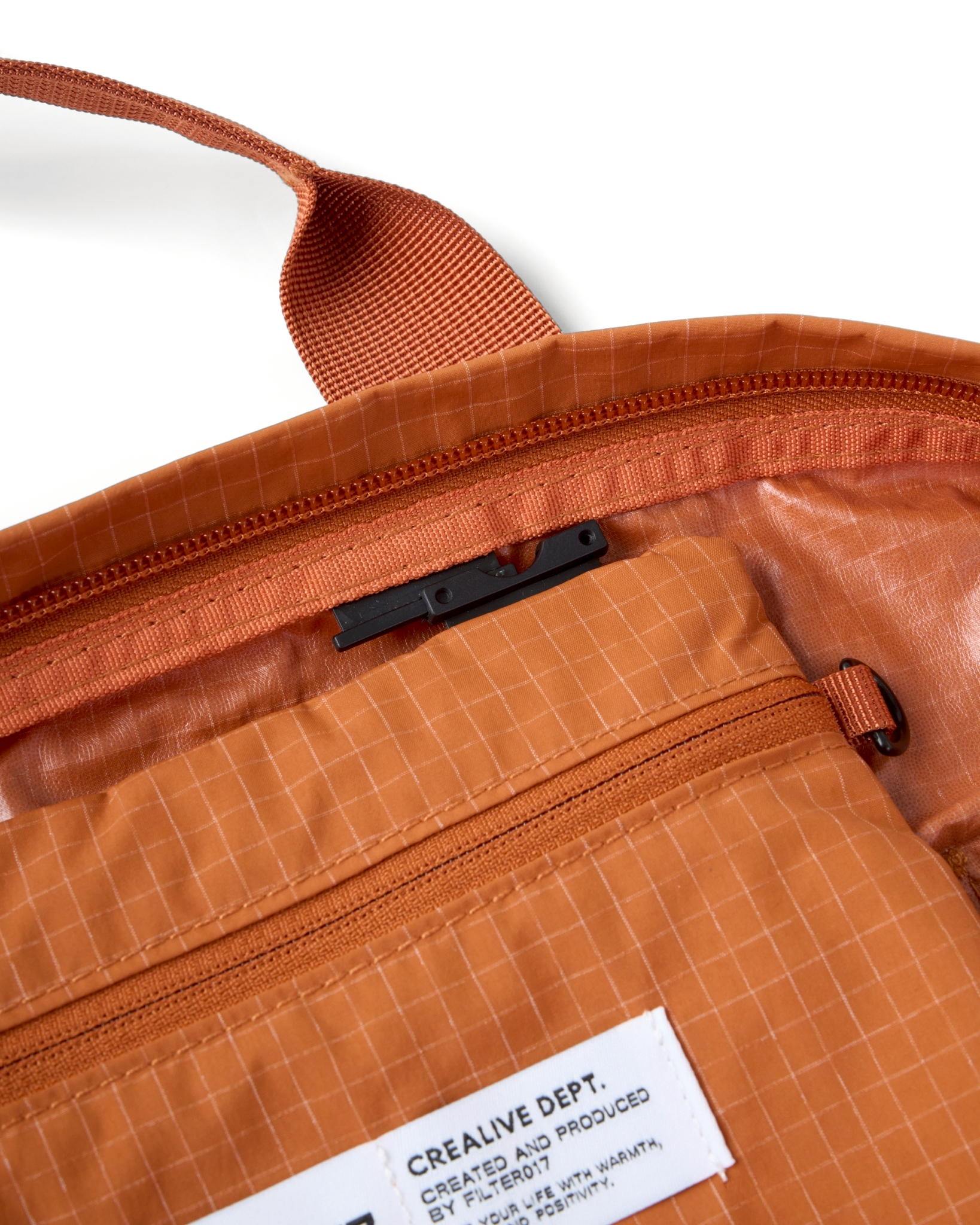 主體採高密度防潑水尼龍面料,內貼合防水膜製成,可運用兩側插扣調節包體型態。內扣小包以快速拆卸的滑扣做結合,依需求可當內袋亦或搭配背繩單獨使用。網布收納袋平時作為內裡袋層,以拉鍊與插扣固定,增添收納的多樣化與便利性。整體多面向的結構設定,提供靈活與最大限度滿足於各情境。