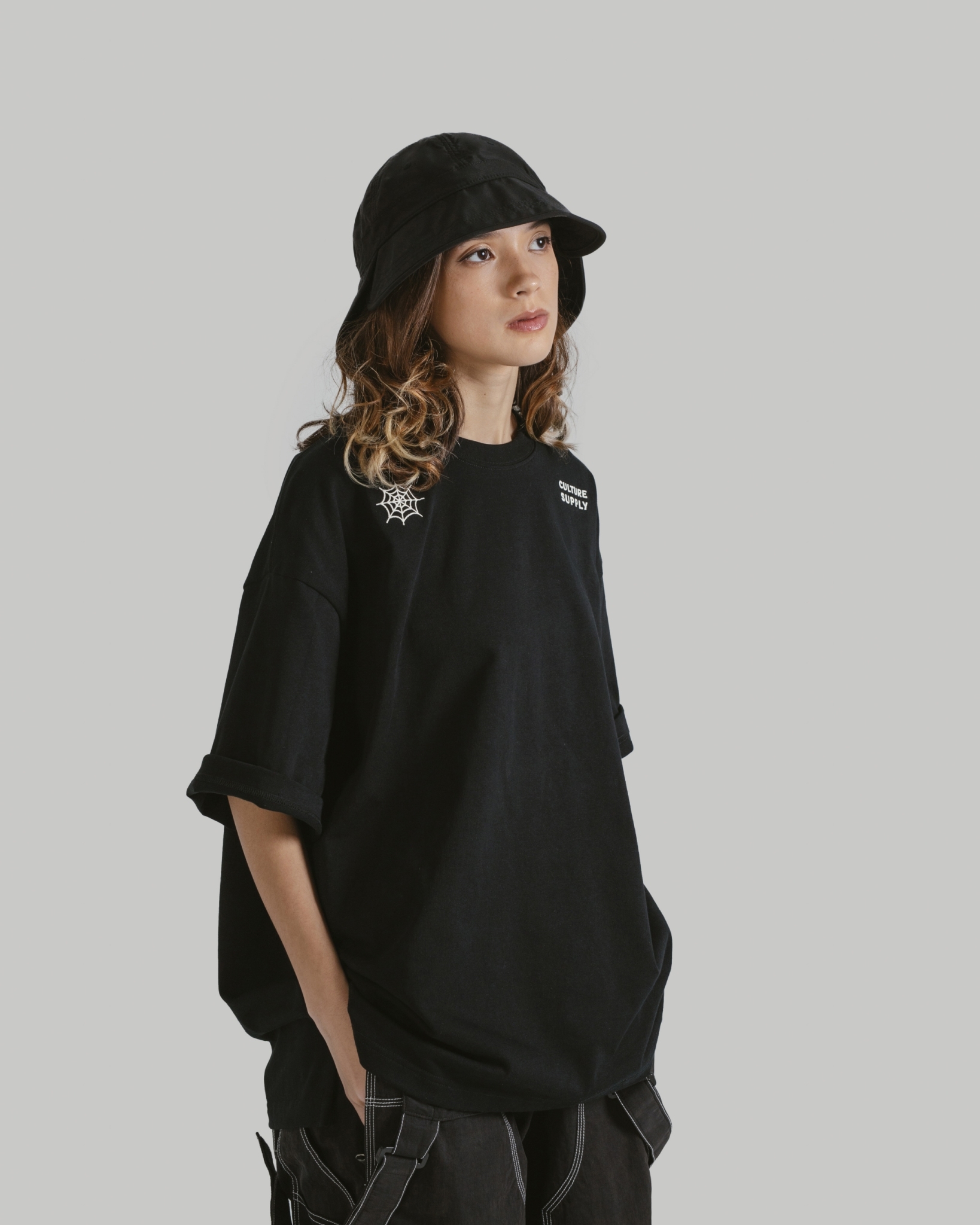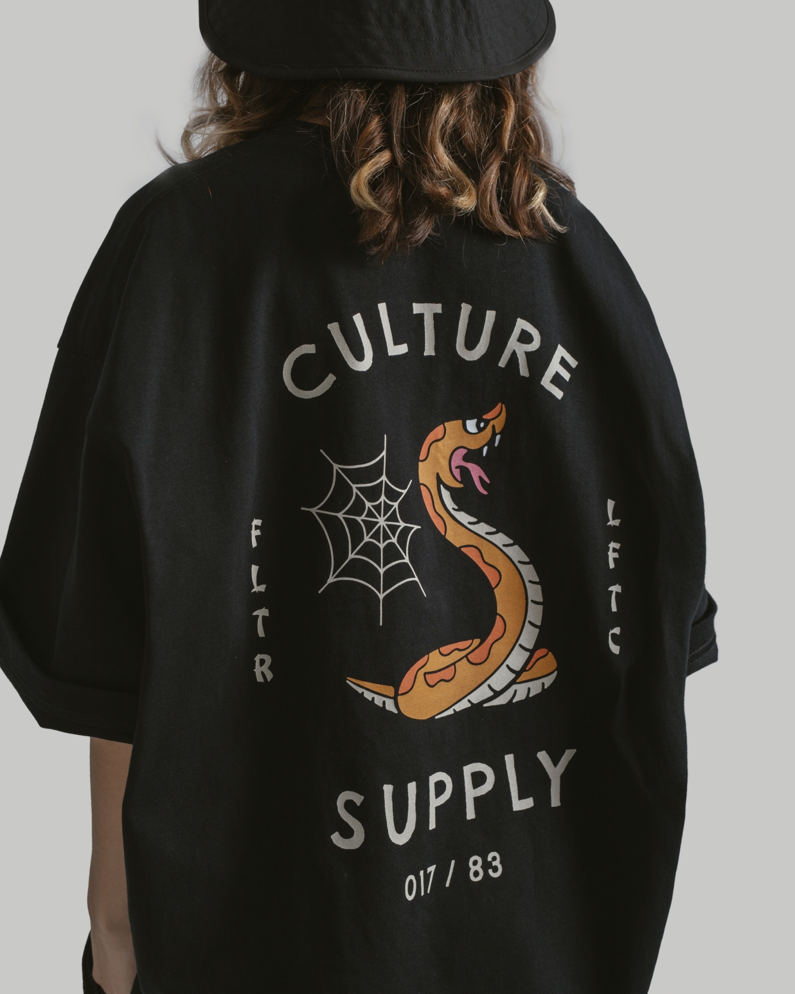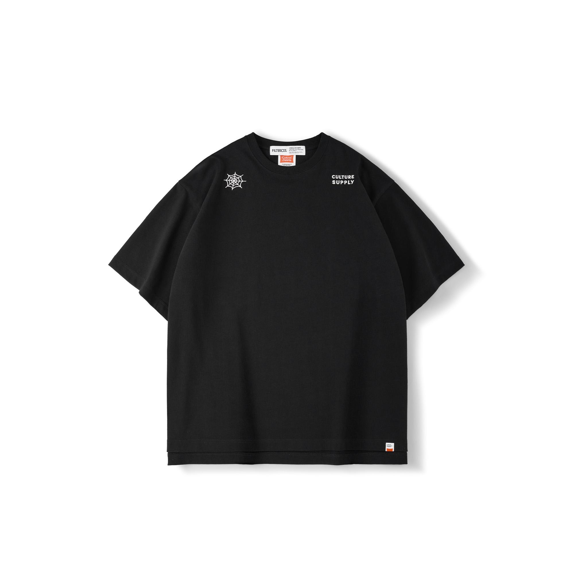 此款短T採用融合日本傳統與美式文化的橫須賀風格呈現,正面採用細緻刺繡入圖,背面印刷以蜘蛛網和手繪字體進行編排,藉此襯托仿軍事感筆觸繪製而成的蛇年圖像。