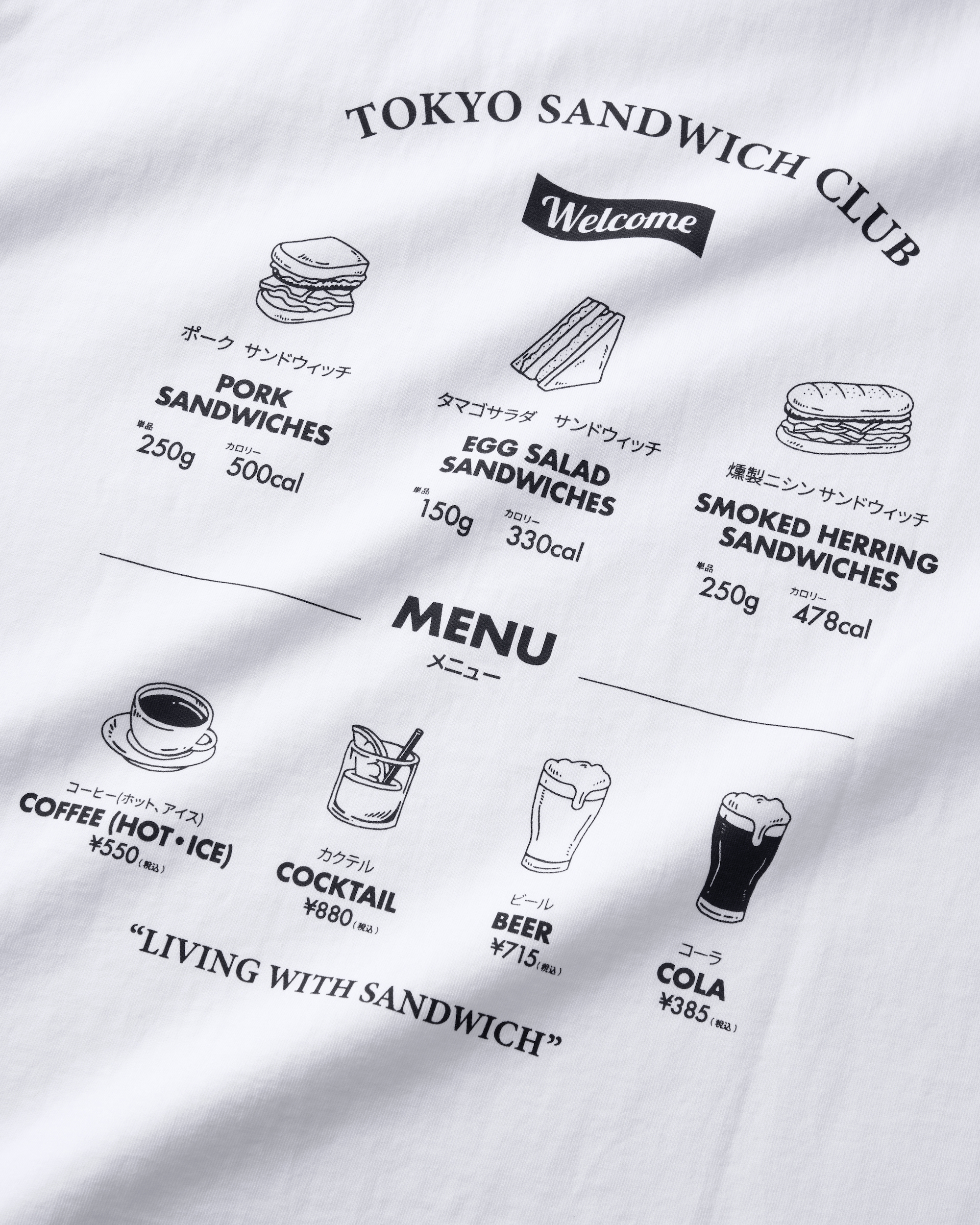 以Tokyo Sandwich Club 品牌經典菜單圖像作為主視覺,嚴選高品質棉料製作,並採用符合東方人身形的微寬鬆版型,整體材質與輪廓於日常生活帶來舒適俐落的穿著體驗。