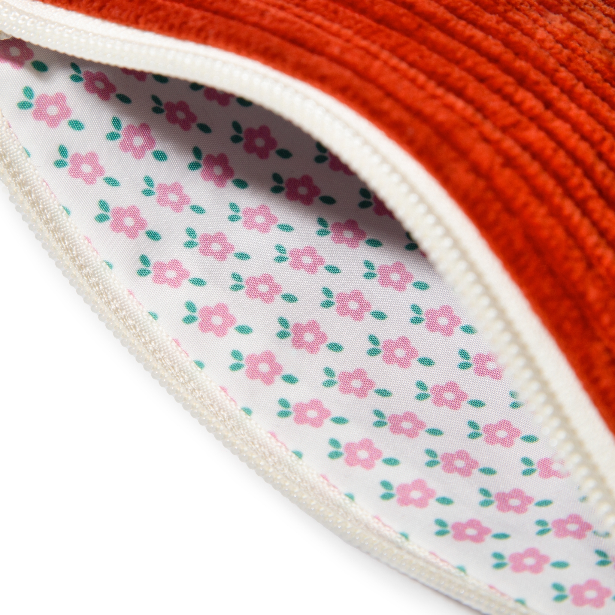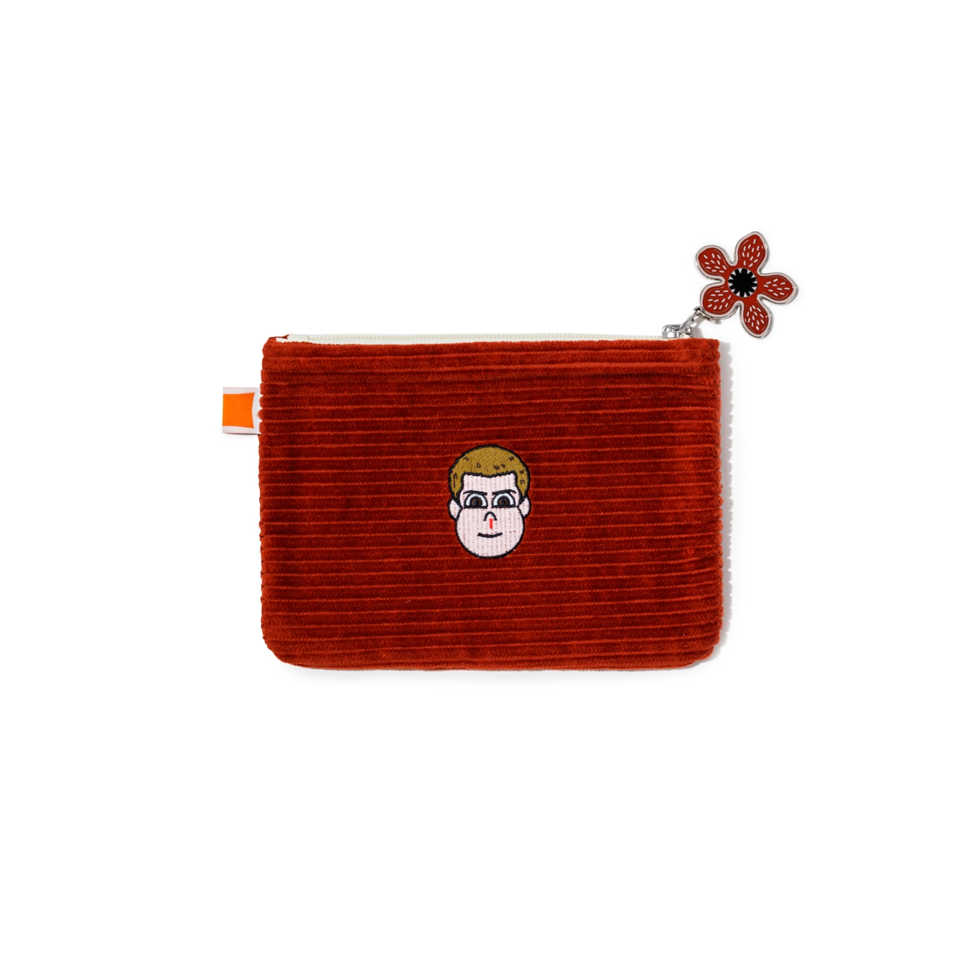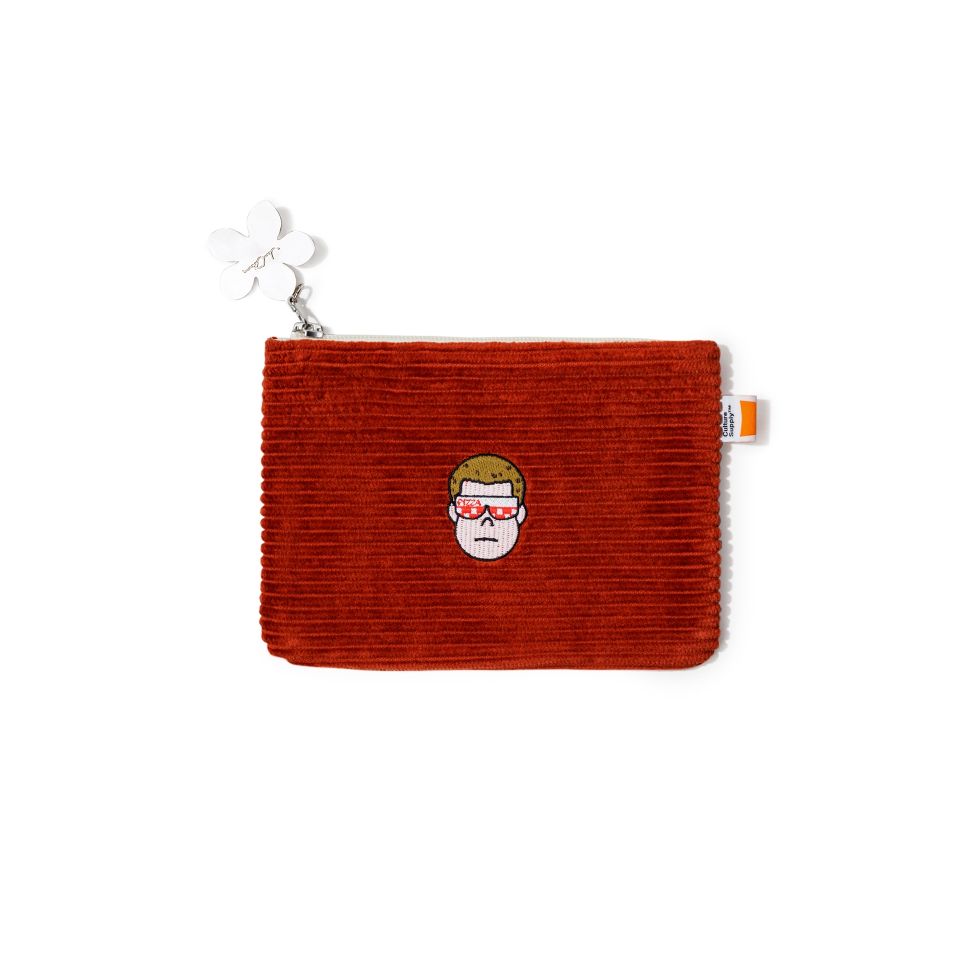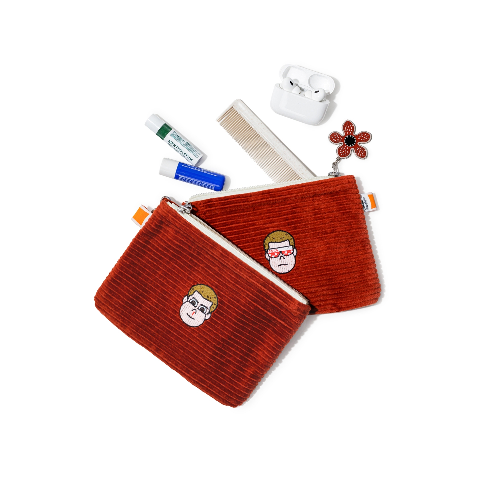 此款隨身小包,巧妙運用多種材質進行縫製,以布紋風格鮮明的燈芯絨面料,搭配電繡與內裡滿版圖像印製,加上精緻的金屬拉鍊飾片,整體呈現滿滿誠意與巧思,於日常便於攜帶且可裝載各式生活小物。
