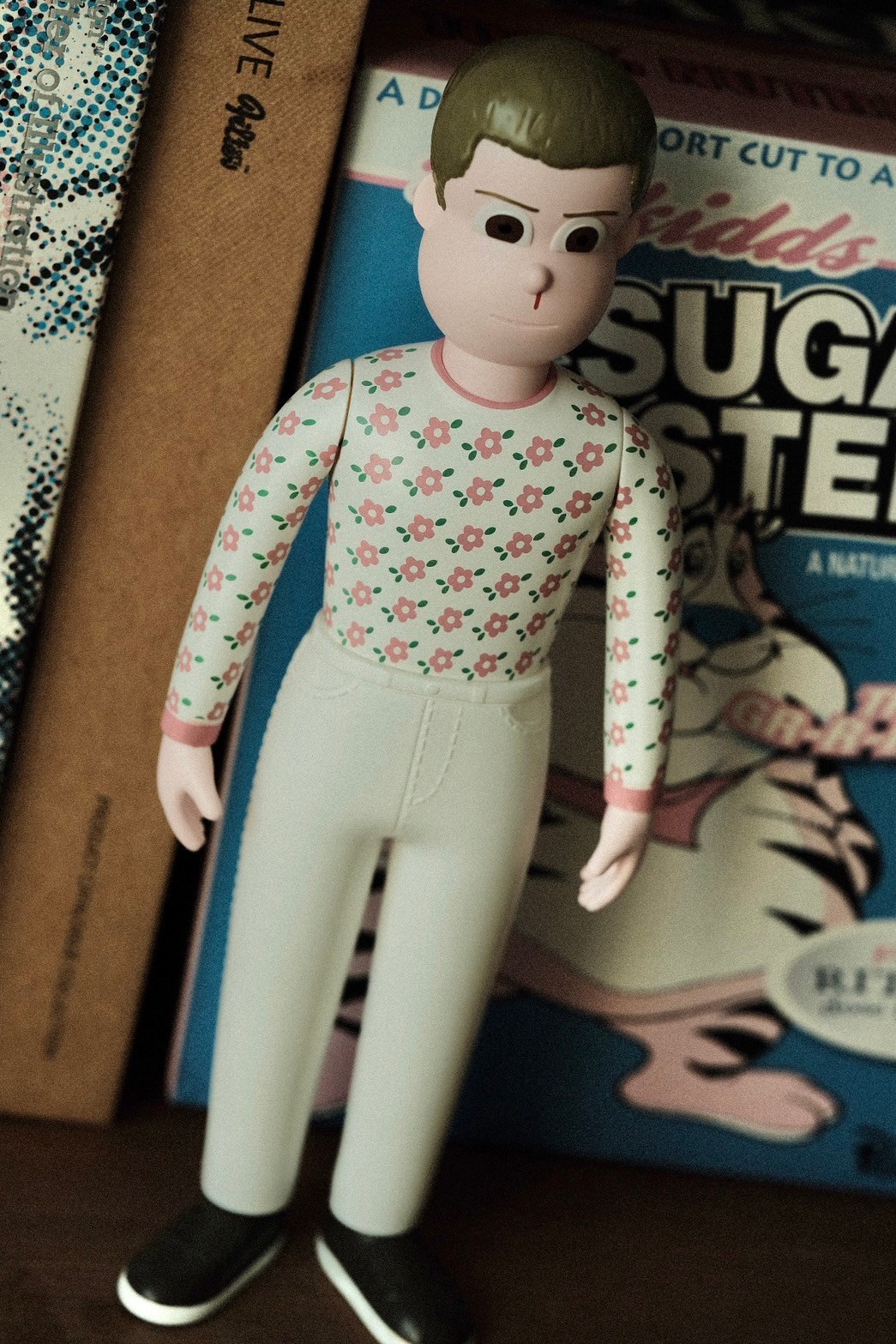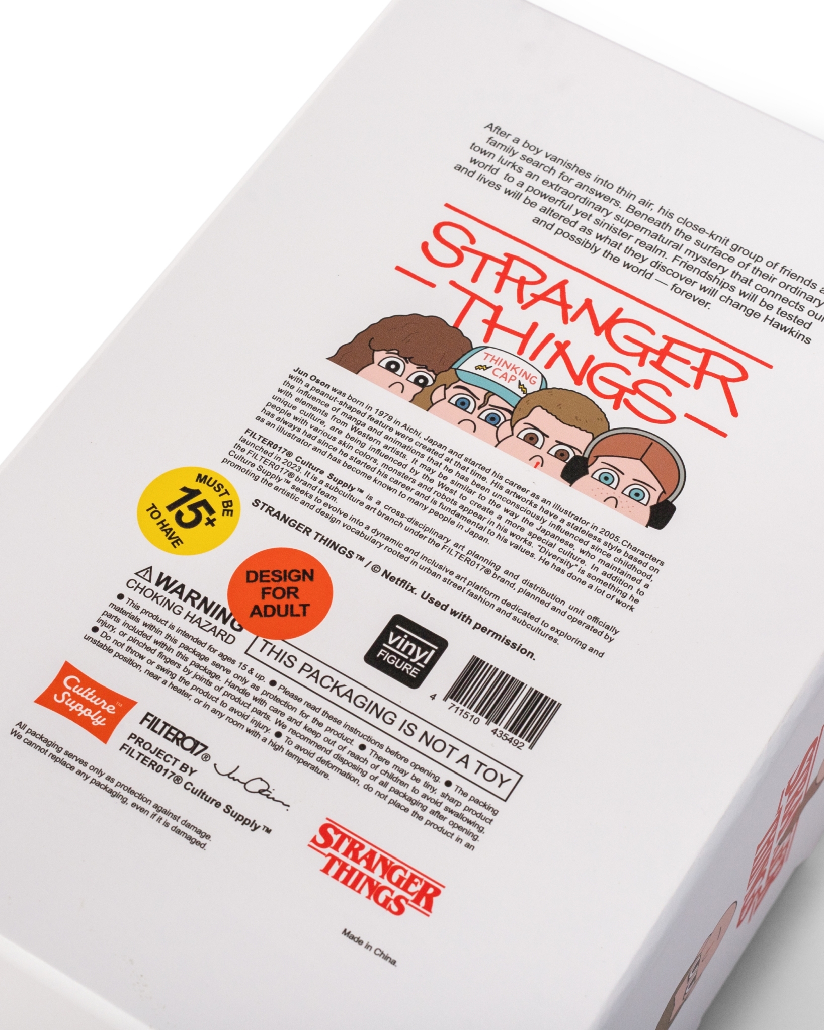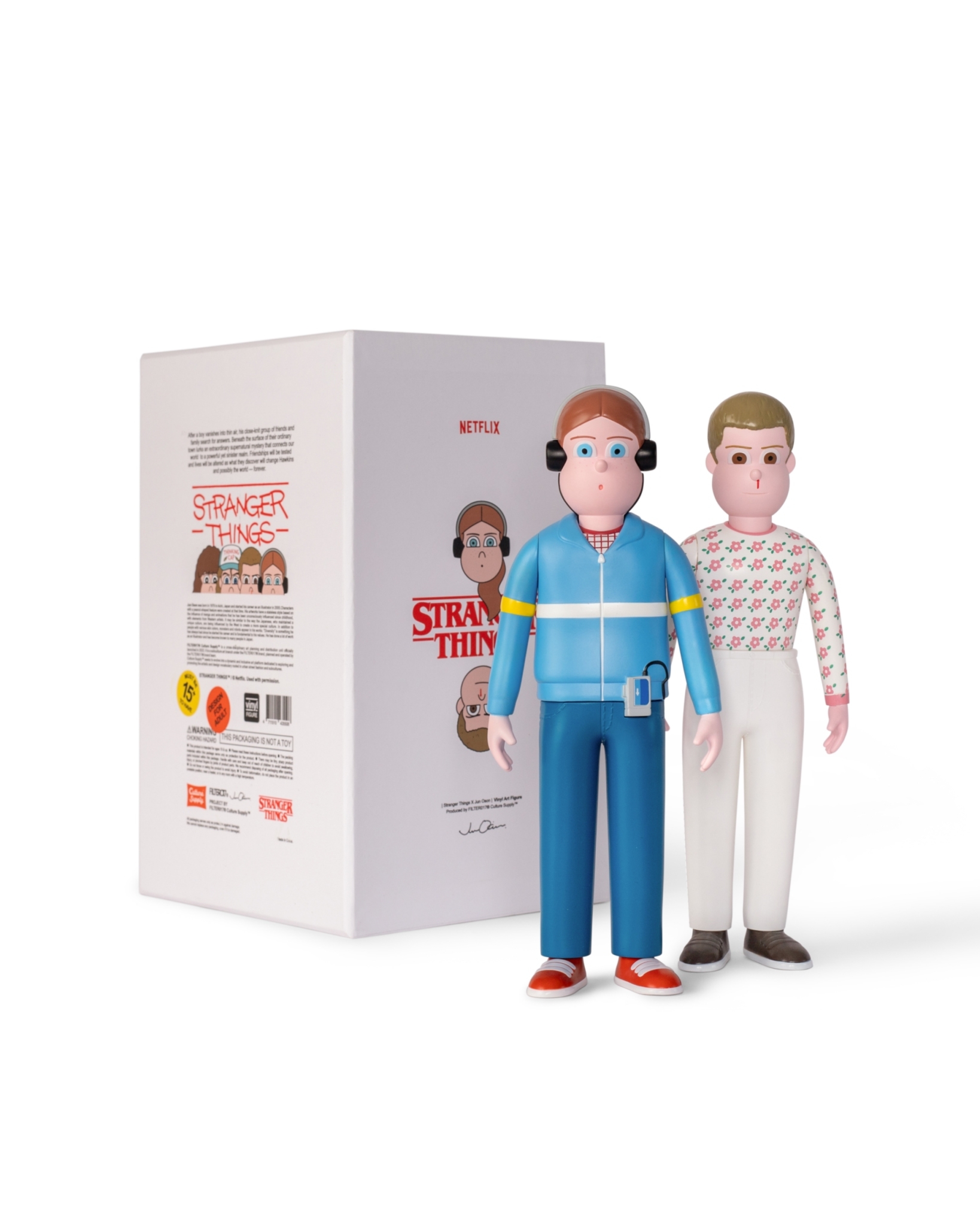 以全球熱播美劇《怪奇物語》第4 季核心角色與劇情主軸“友情”為靈感,融合80 年代美式經典風格與科幻元素,考究原作人物細節人設與造型,邀請日本知名藝術家Jun Oson 合作 ,以其“花生臉型”角色風格進行藝術插畫的轉換,並以PVC搪膠材質,透過複雜程序與製作工法,精緻呈現Jun Oson 所詮釋的立體造型特色,巧妙復刻劇中角色經典的形象。