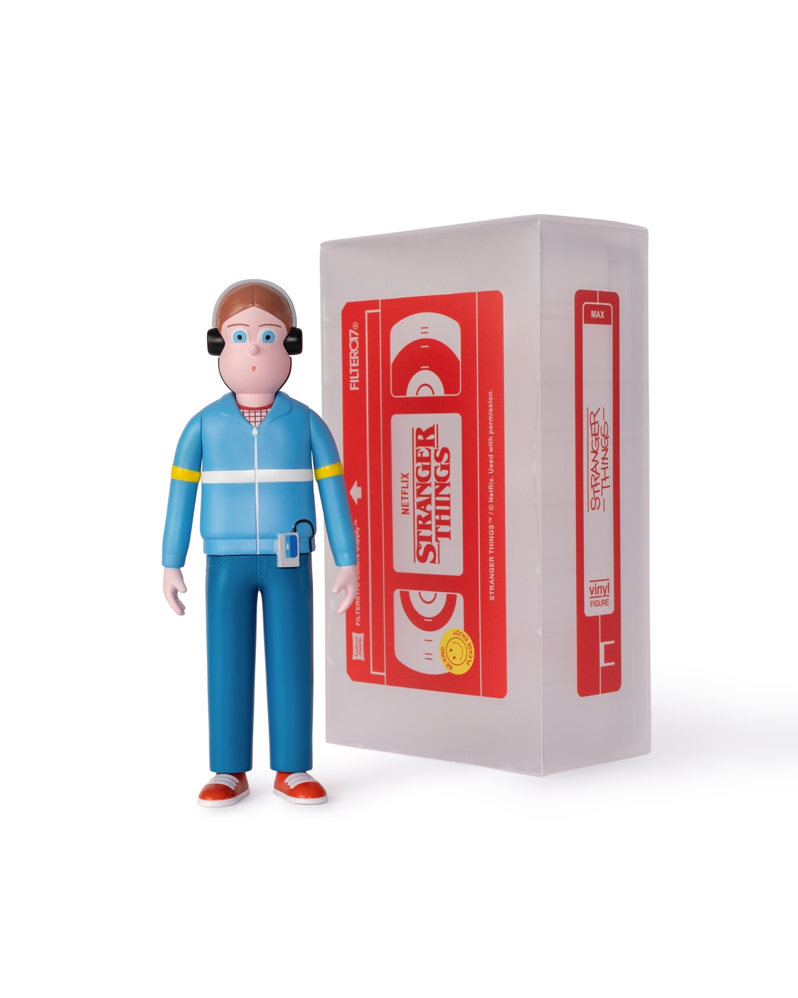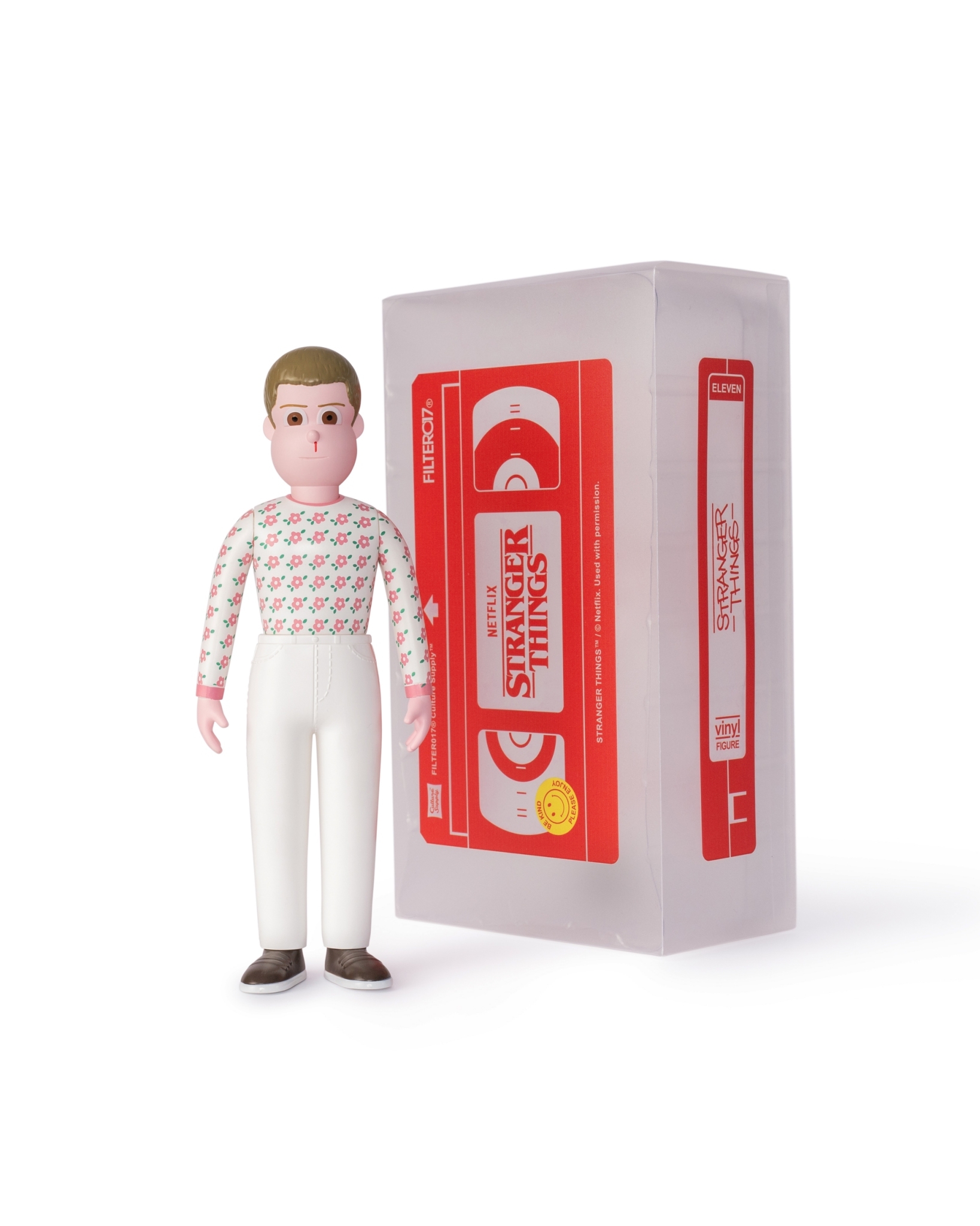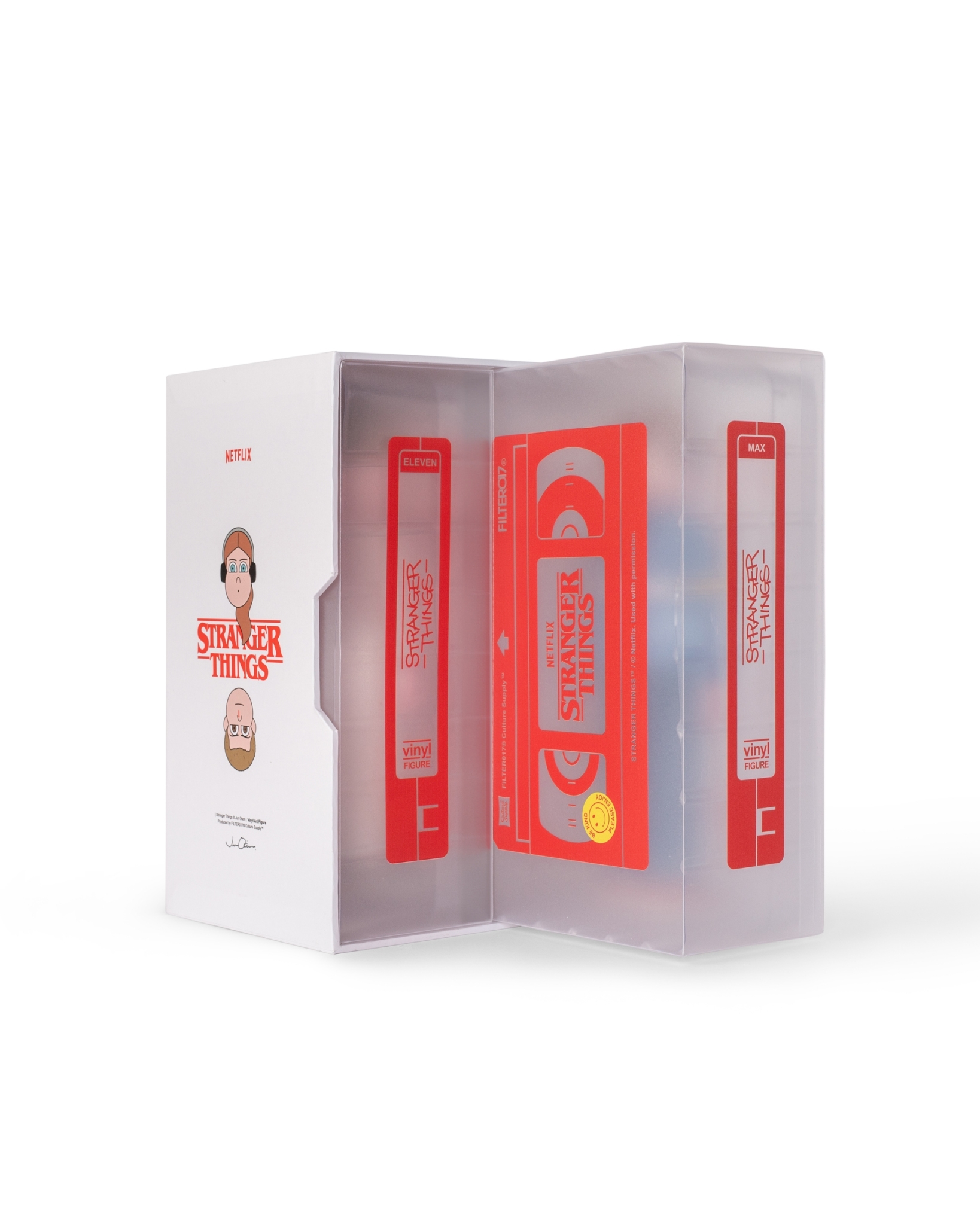 內容包含Eleven 、Max 共2款角色之立體造型收藏軟膠,以80年代"VHS錄影帶"造型概念為精裝外盒設計,透過磨砂霧面的透明PVC包材,將內裝角色的輪廓隱約展現,增添玩味巧思,每只角色造型高度約10英吋,實體手感具有扎實分量,部分零件為可動結構,精緻的塗裝及繁複的圖紋移印工藝,並由台灣知名設計師玩具單位IN TOY 生產技術協力,賦予收藏成品高度完整性,無論是FILTER017® 支持者、藝術設計與復古文化愛好者、《怪奇物語》劇迷,亦或是Jun Oson 藝術收藏家,皆能在此次的藝術軟膠套裝中,感受到飽滿的誠意與細節。