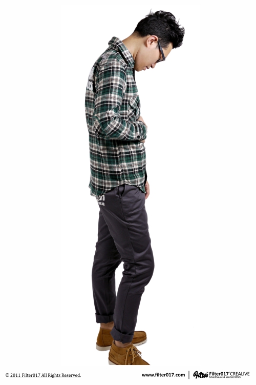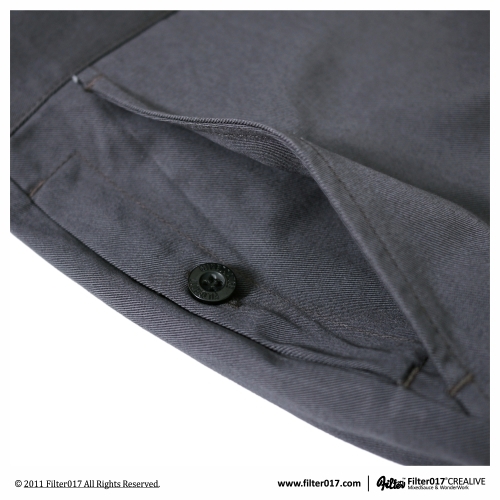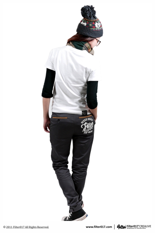 不久前Filter017首次推出的刺繡休閒長褲,合身俐落的剪裁設計廣受好評, 此番特地加碼推出灰色款式,視覺設計上乃延伸於2011夏季推出的刺繡工作短褲, 有別於硬挺精神的工作短褲的是,入秋後長褲的材質上選用了不過於厚重,且舒適柔軟的細棉斜布料, 表面輕磨毛處理使手感更佳舒適,版型設計上則改良了老式西裝休閒褲,以窄版、修身為訴求,呈現秋冬合身的休閒風格。