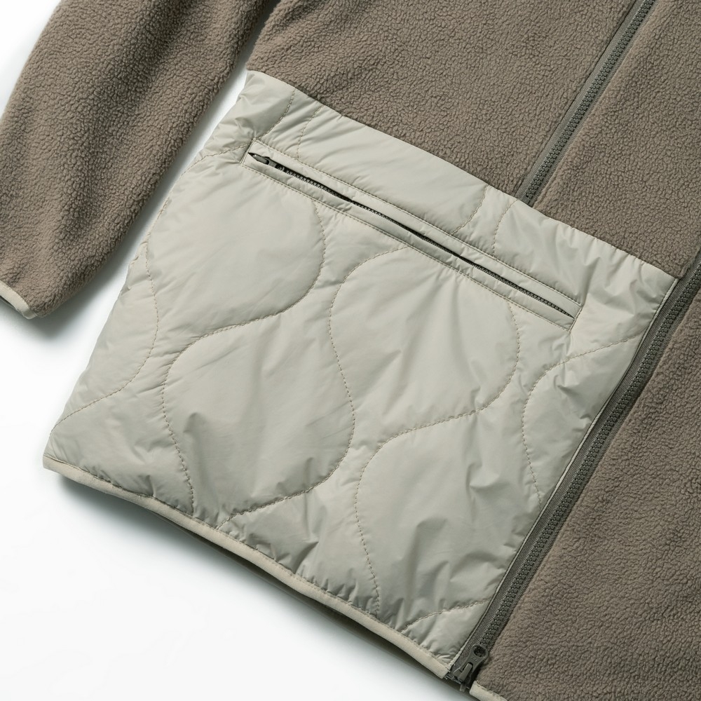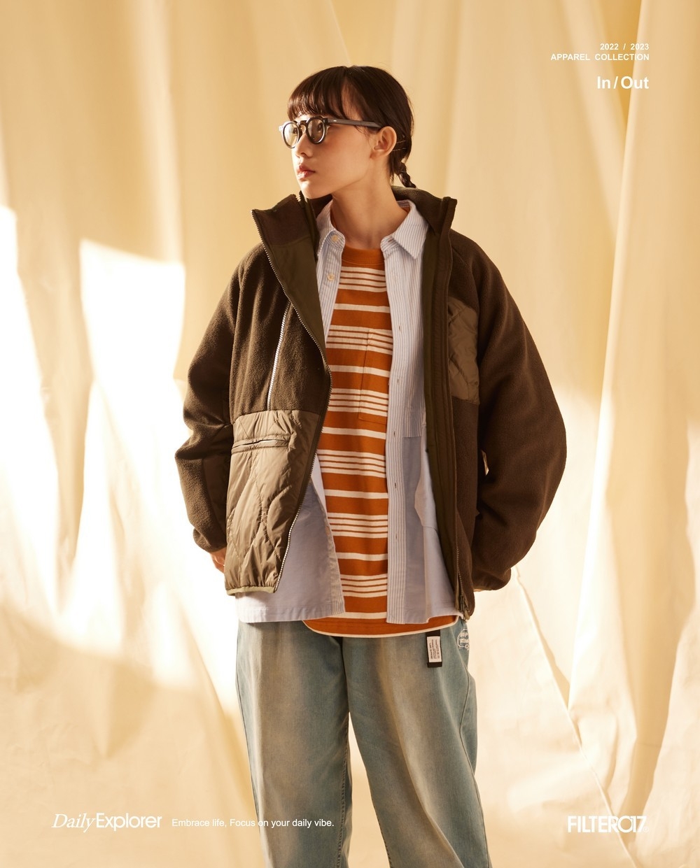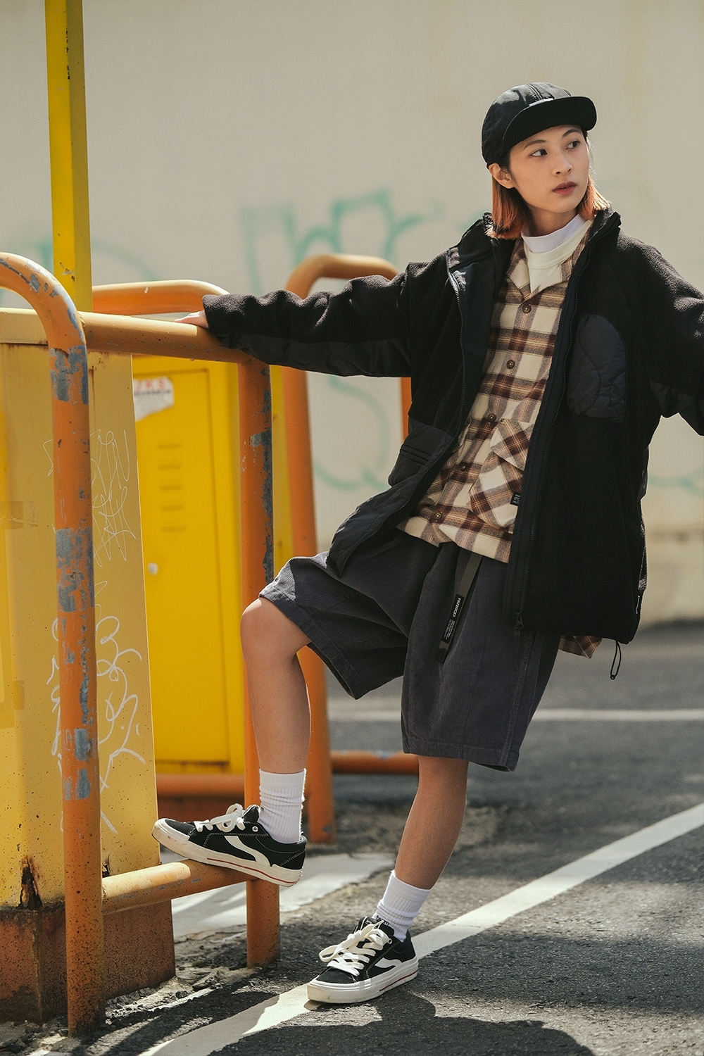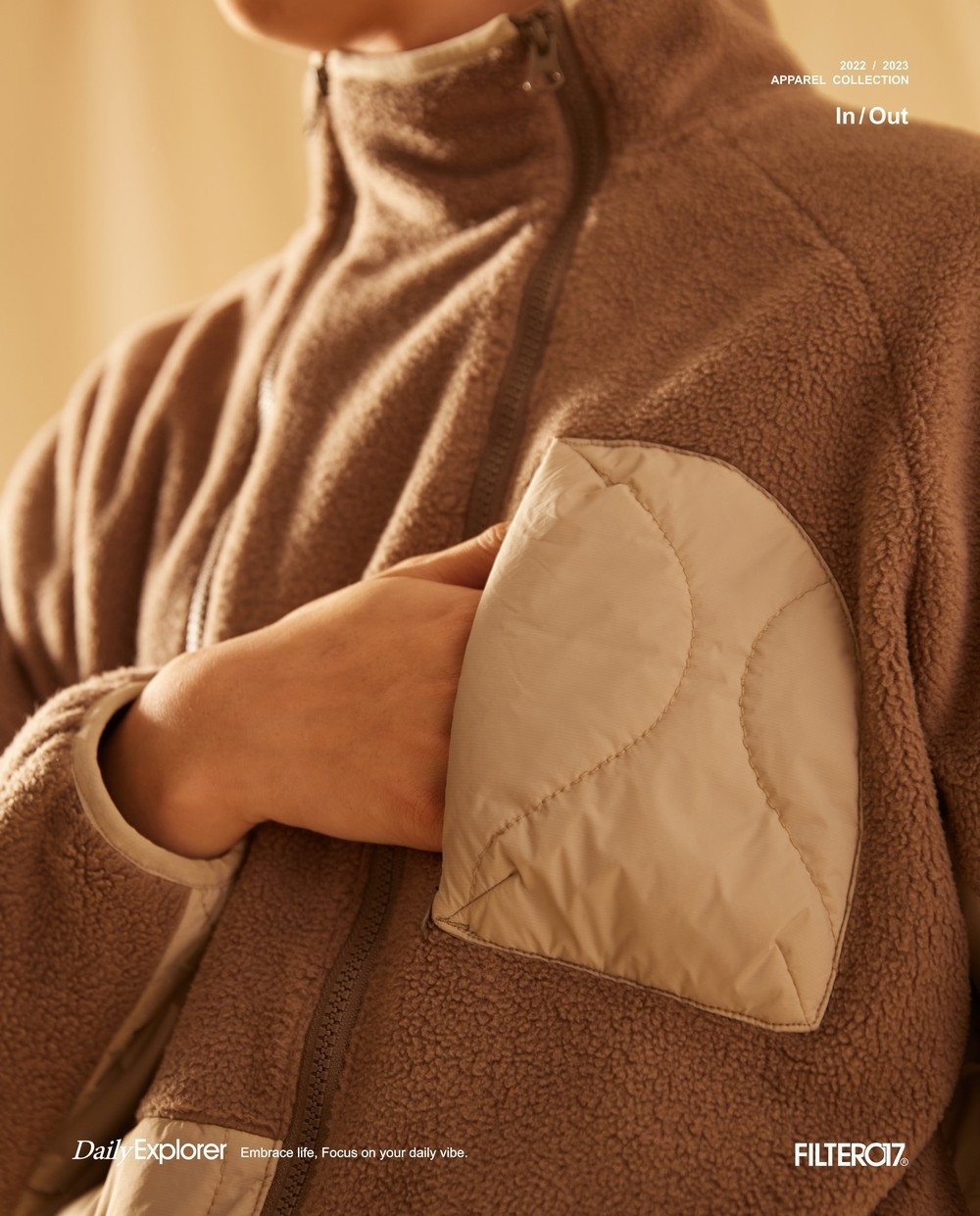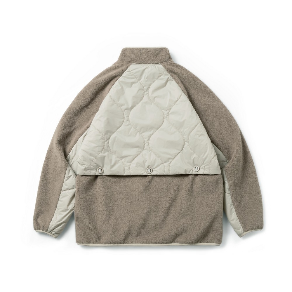 由70-80年代美式復古戶外機能服裝中汲取靈感,將戶外及軍工裝元素拼接混合,巧妙結合兼具保暖度與風格性的搖粒絨面料與衍縫工法,