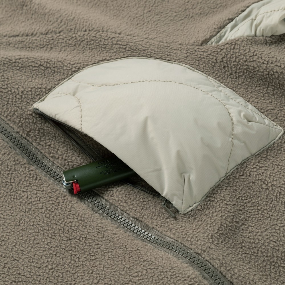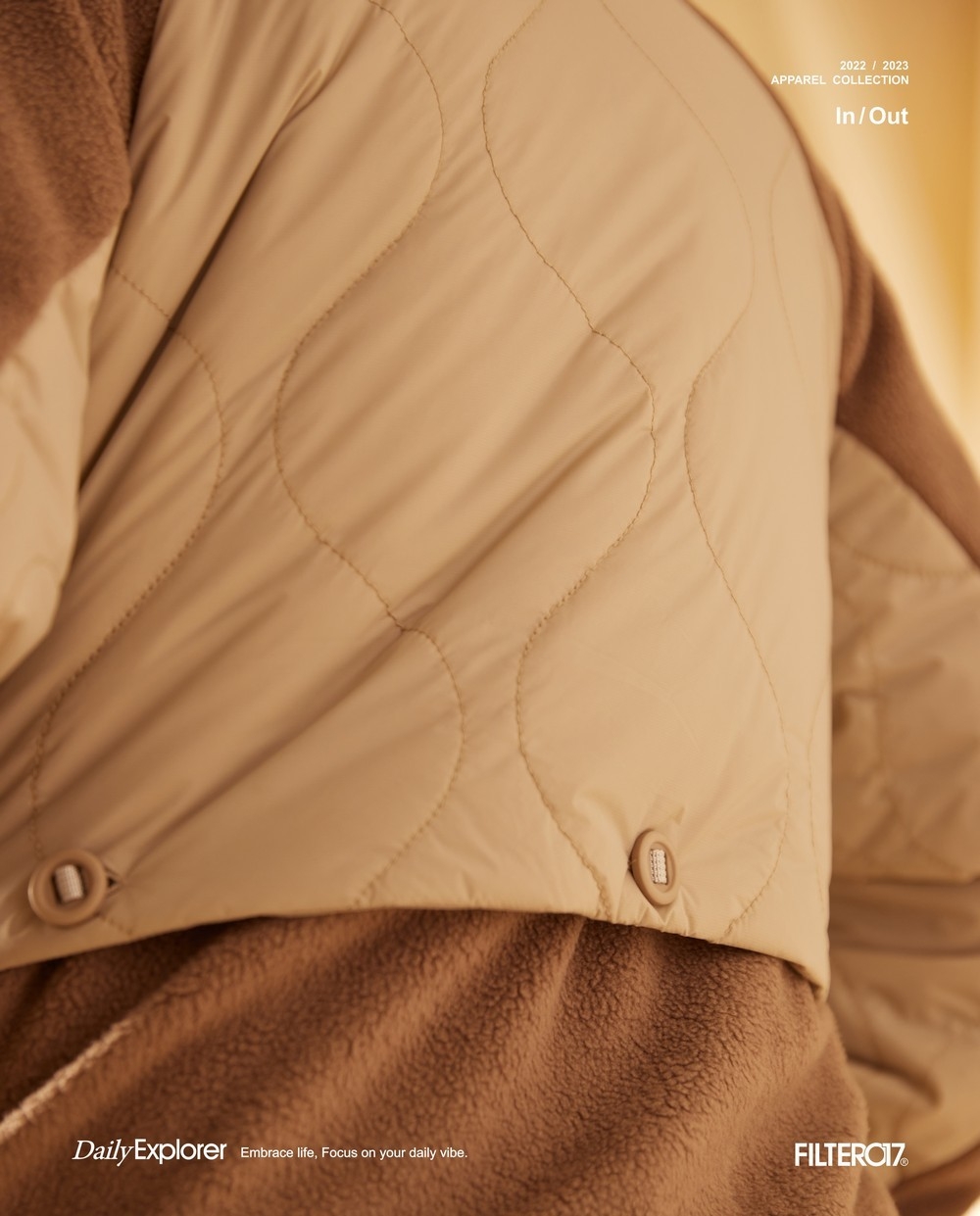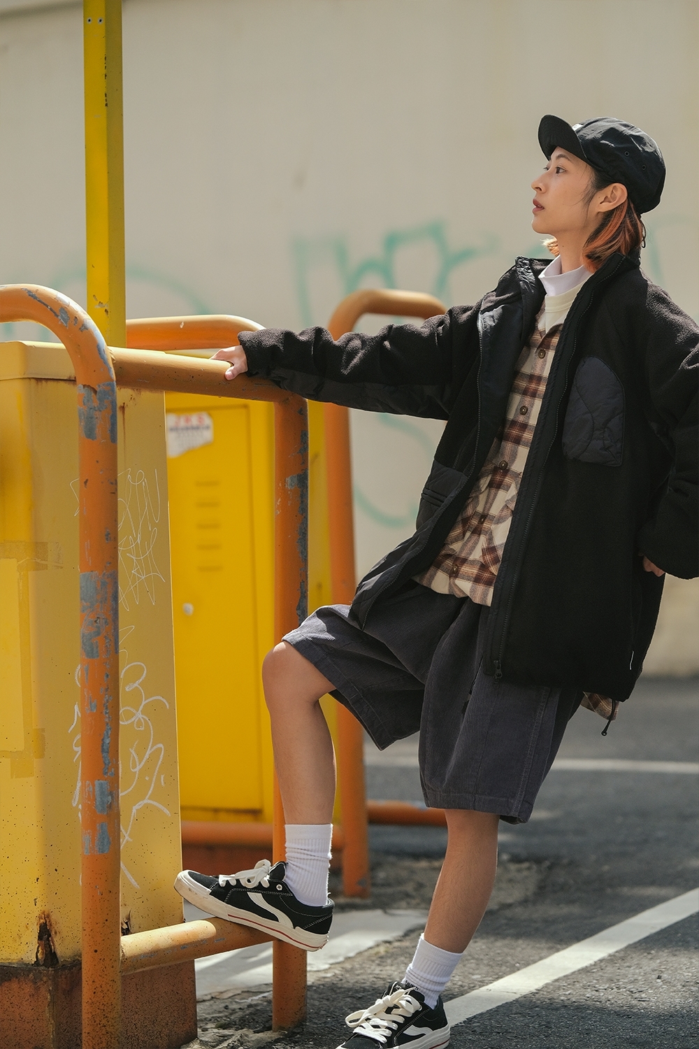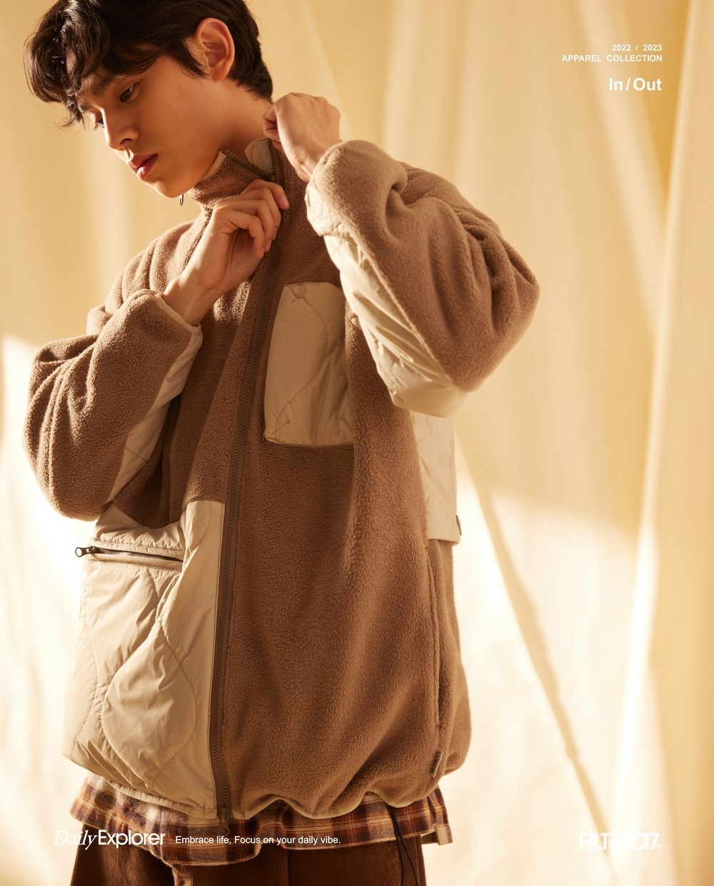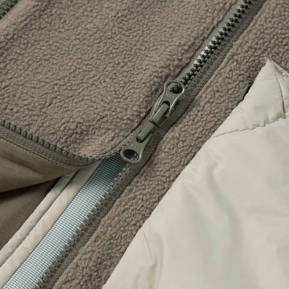 由70-80年代美式復古戶外機能服裝中汲取靈感,將戶外及軍工裝元素拼接混合,巧妙結合兼具保暖度與風格性的搖粒絨面料與衍縫工法,