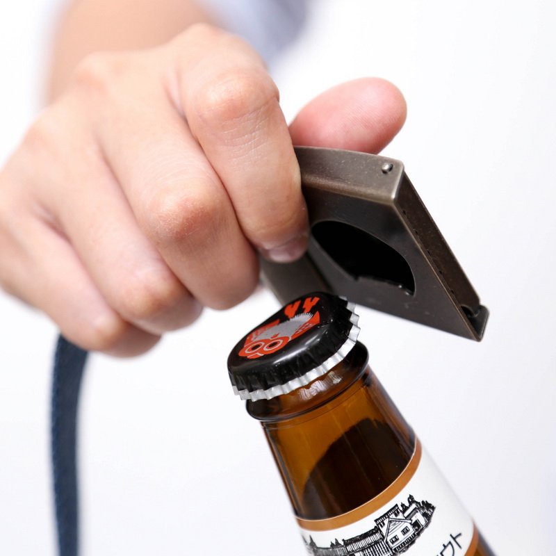 而具開瓶功能的復古金屬扣頭,細緻刻劃Filter017設計字體,