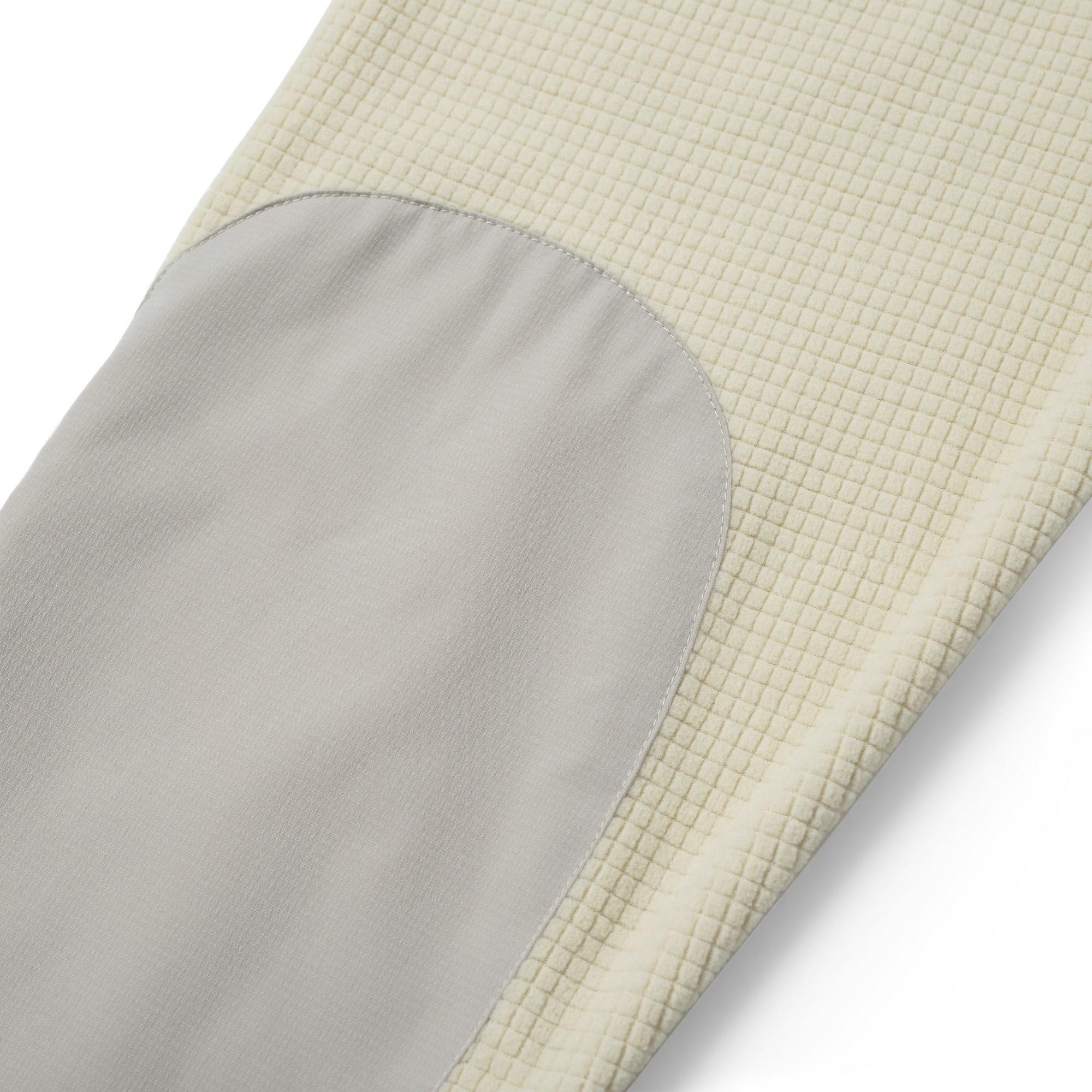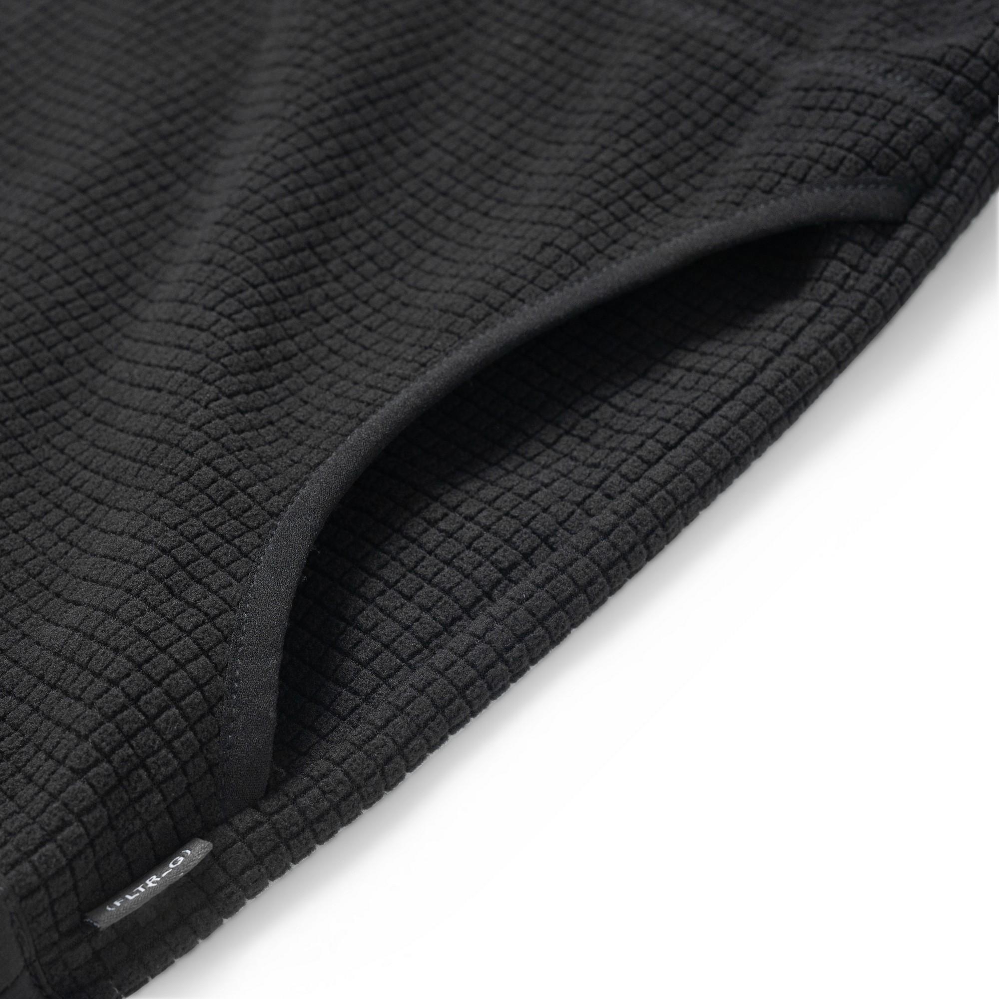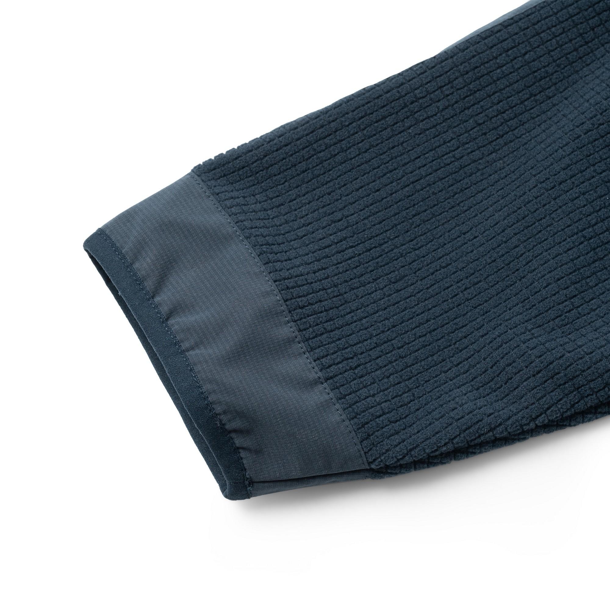 複合立領與半開襟套頭罩衫版型剪裁與異材質拼接設計,下擺抽繩可依照需求調整以利活動便利及阻絕冷空氣進入,衣身兩側暖手插袋設計為冬日增添保暖機能。