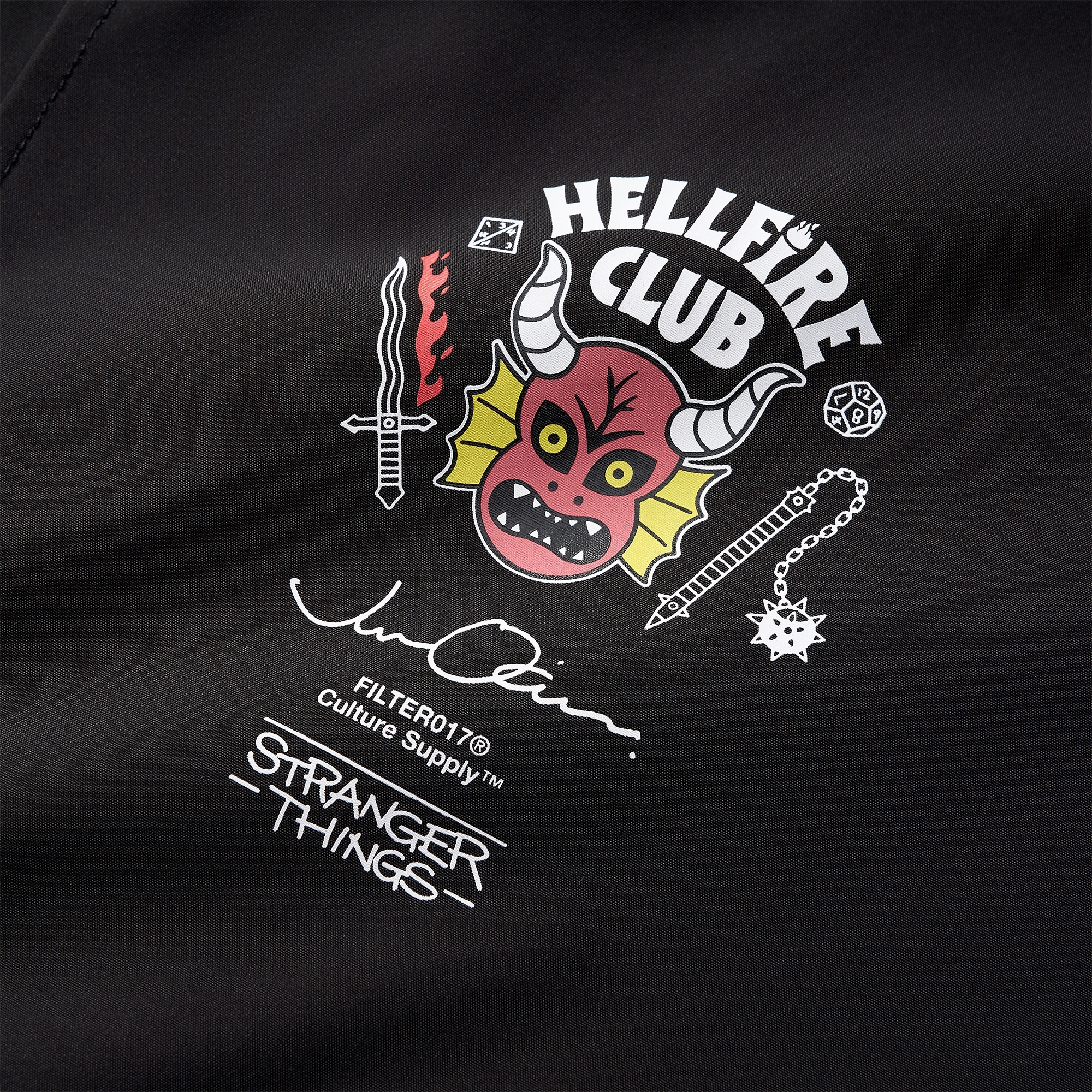 日本當代藝術家Jun Oson 以獨具識別性的插畫風格重新詮釋Stranger Things《 怪奇物語》 劇中Hellfire Club 經典LOGO 圖像,透過FILTER017® 擅長的元素混合語彙延伸創意視覺與商品設計。