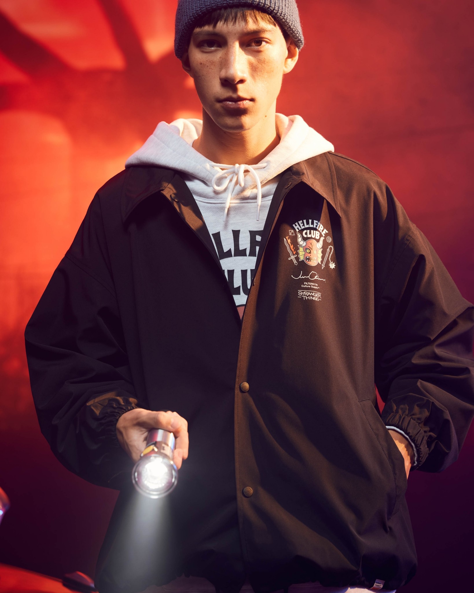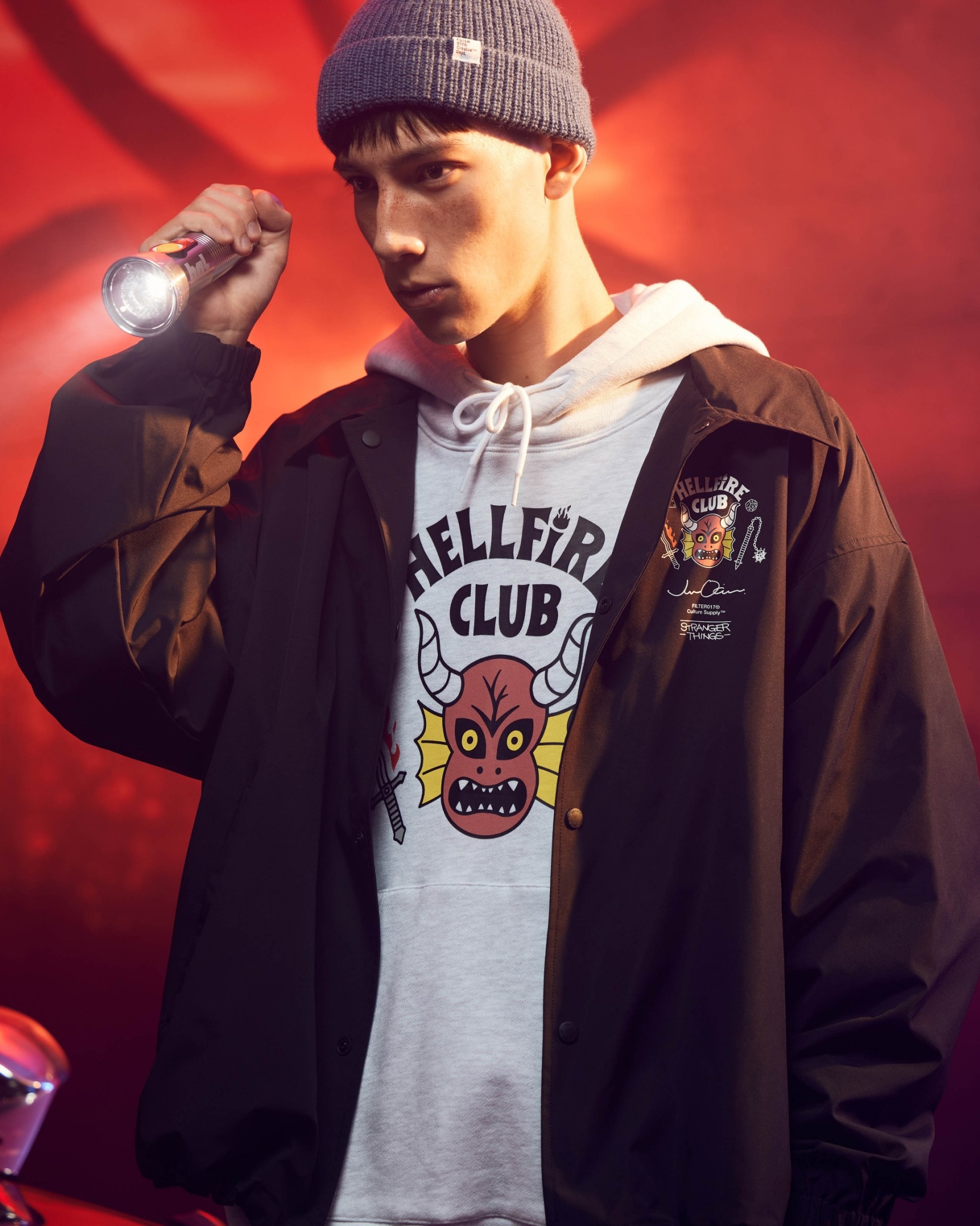此企劃以全球熱播美劇《怪奇物語》第4 季核心角色與劇情主軸“友情”為靈感,融合80 年代美式經典風格與科幻元素,邀請日本知名藝術家Jun Oson 合作 ,以其“花生臉型”角色風格進行轉化,並透過FILTER017® 擅長的元素混合語彙加以設計整合,跨界影劇、時尚、潮流、當代藝術與次文化領域,複合而成創意大膽且層次豐富的內容。無論是FILTER017® 支持者、藝術設計或復古文化愛好者、《怪奇物語》劇迷,亦或是Jun Oson 藝術收藏家,都能在本次企劃中發掘創意巧思,衍生內容涵蓋服飾、藝術收藏、配件與周邊單品,皆可感受到飽滿的誠意與細節。