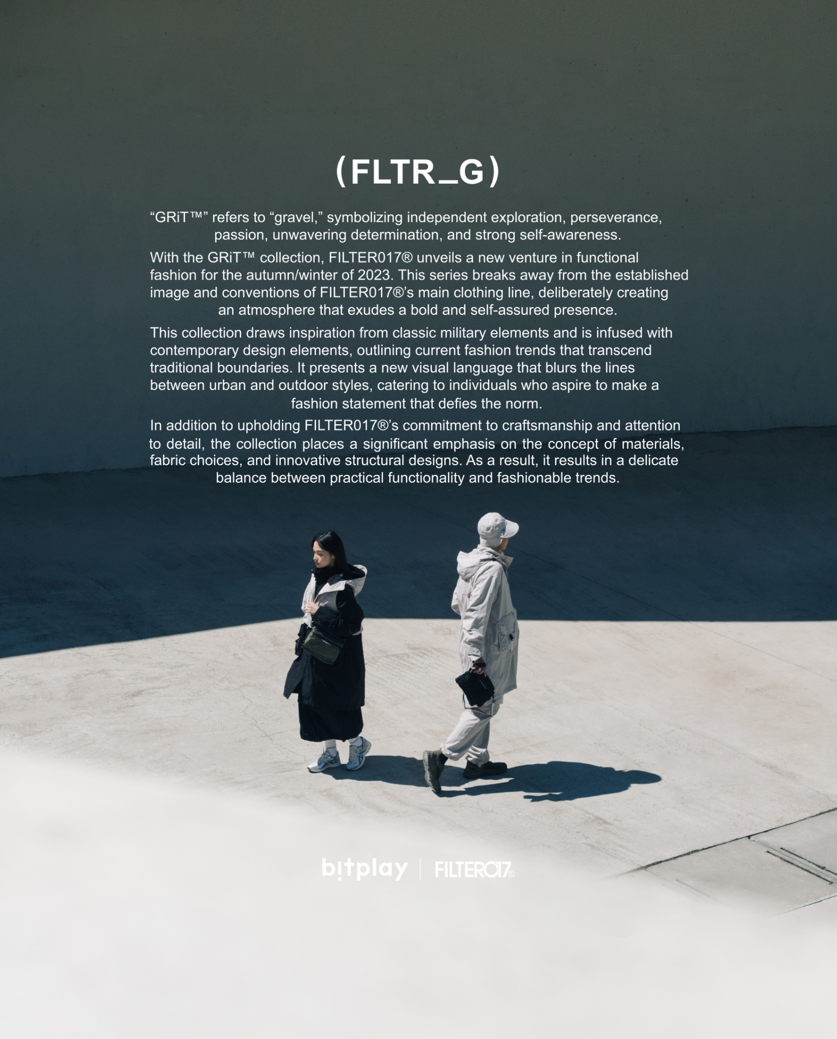 以GRiT™ 為命名破題,FILTER017® 於2023秋冬之際推出機能概念服飾企劃,於系列形象與單品型態上之演繹,大膽跳脫FILTER017® 在服飾本線上原有的輪廓及思維,欲刻意營造與定調於品牌過去少見的高冷孤傲氣息氛圍。