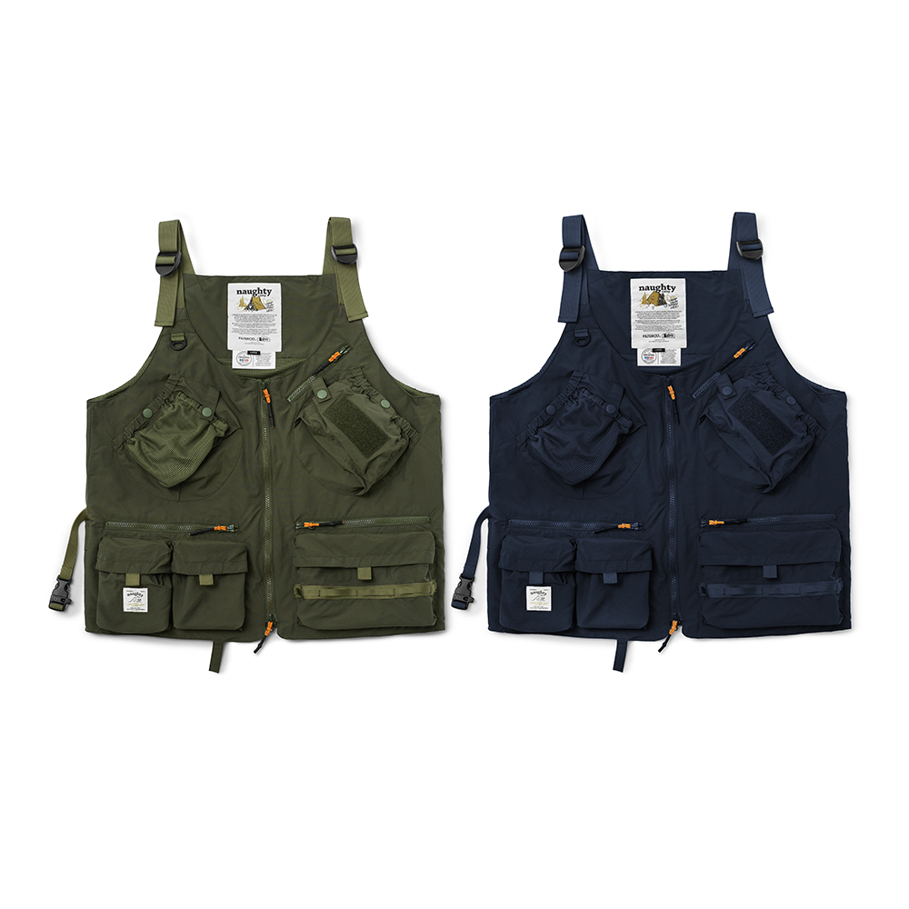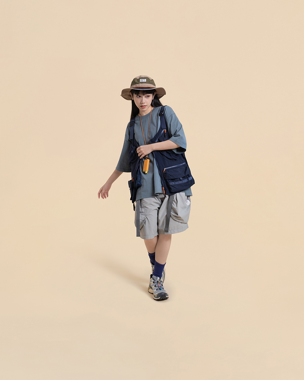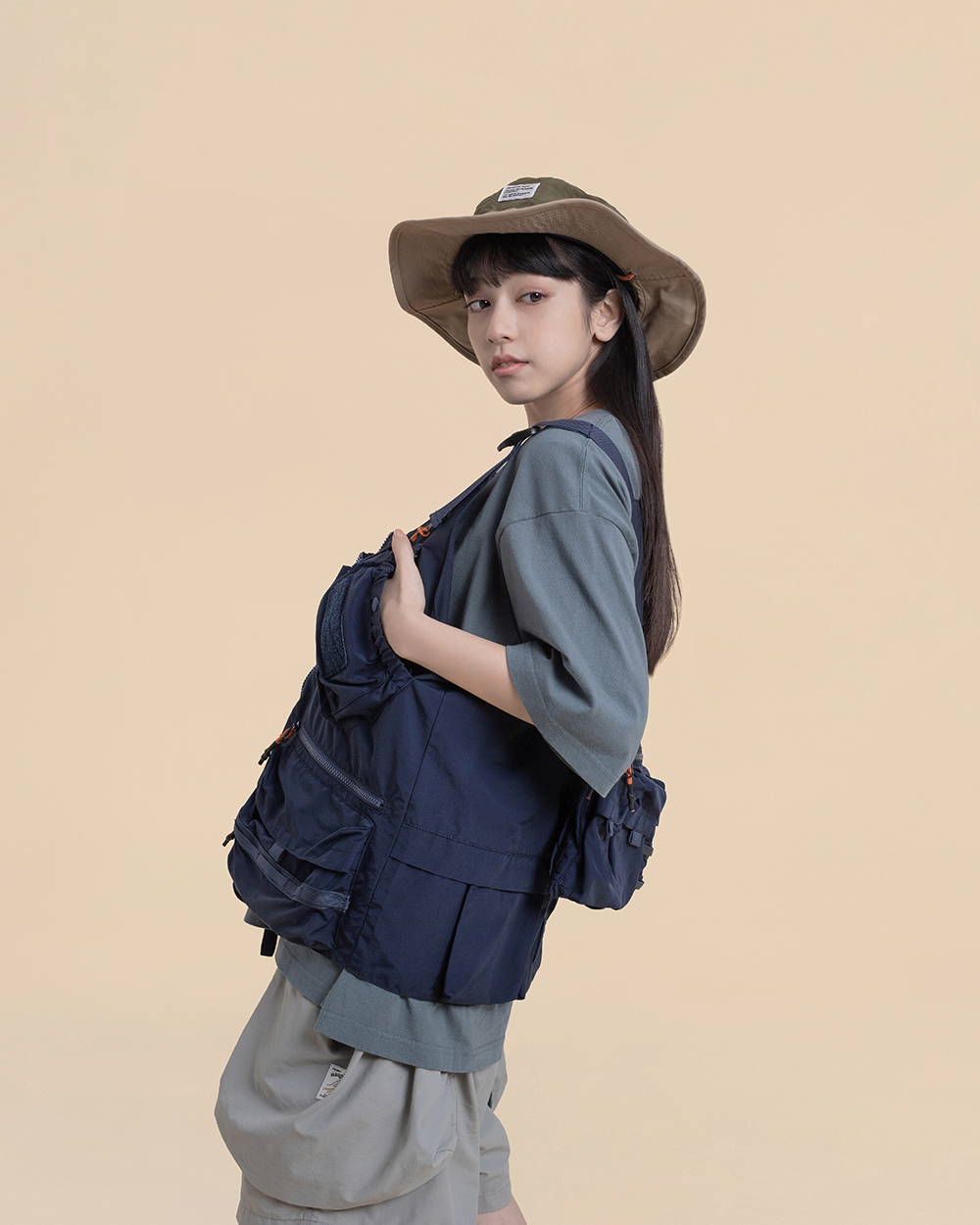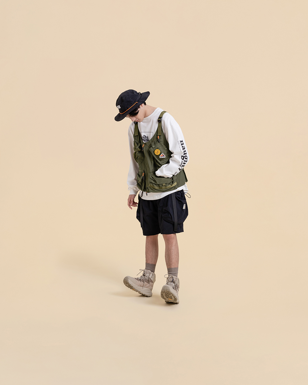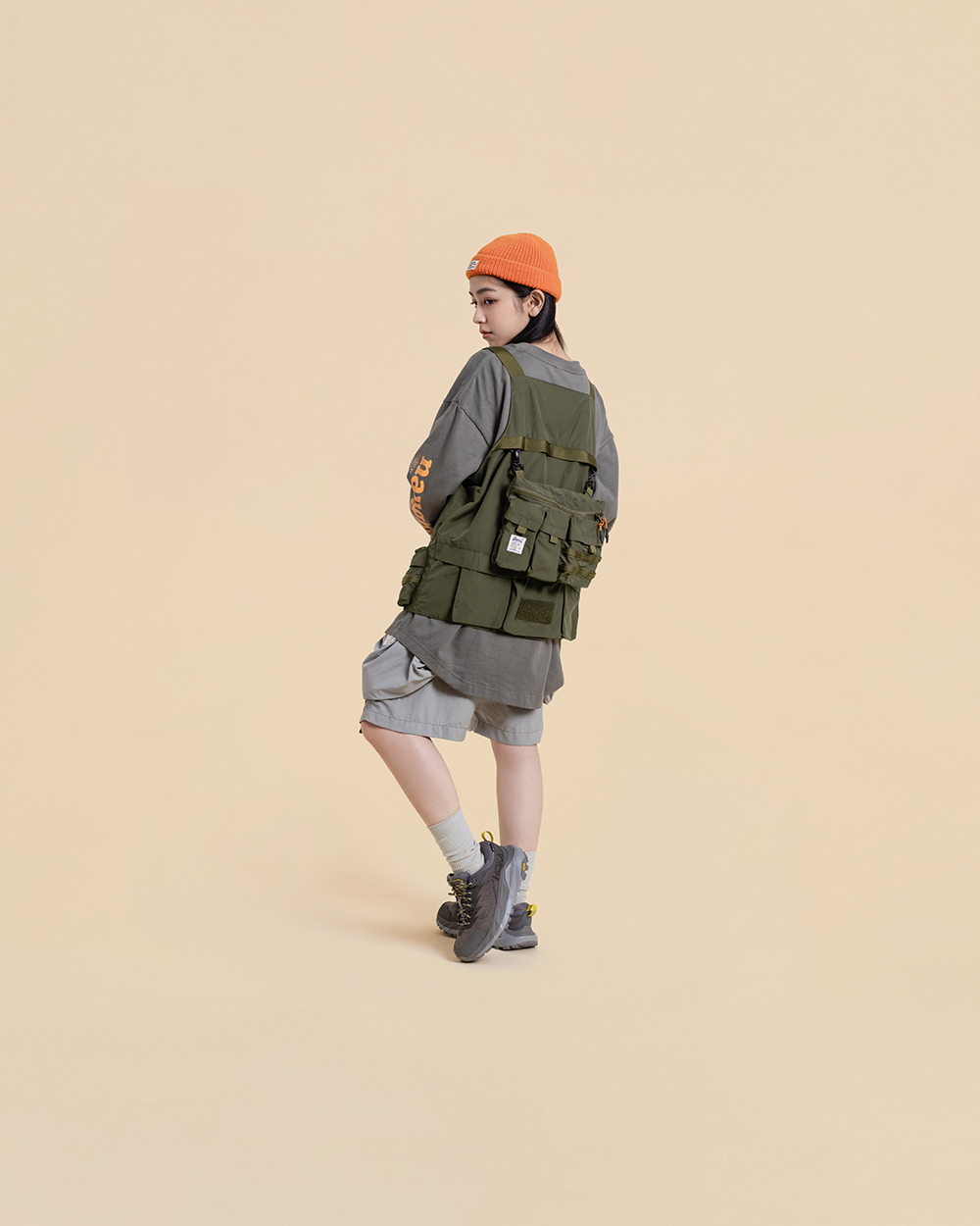 此外,背心背面的扣環上亦能加掛NAUGHTY CAMP戰術機能小包或是grn outdoor品牌TEBURA包款,增強背心於戶外著用時的機能與便利性。藉由高度裝載機能性,釋放拎著大包小包的雙手,盡情享受與人在山野之間活動的美景和樂趣,真正達到「手ぶら(空手)」設計理念。