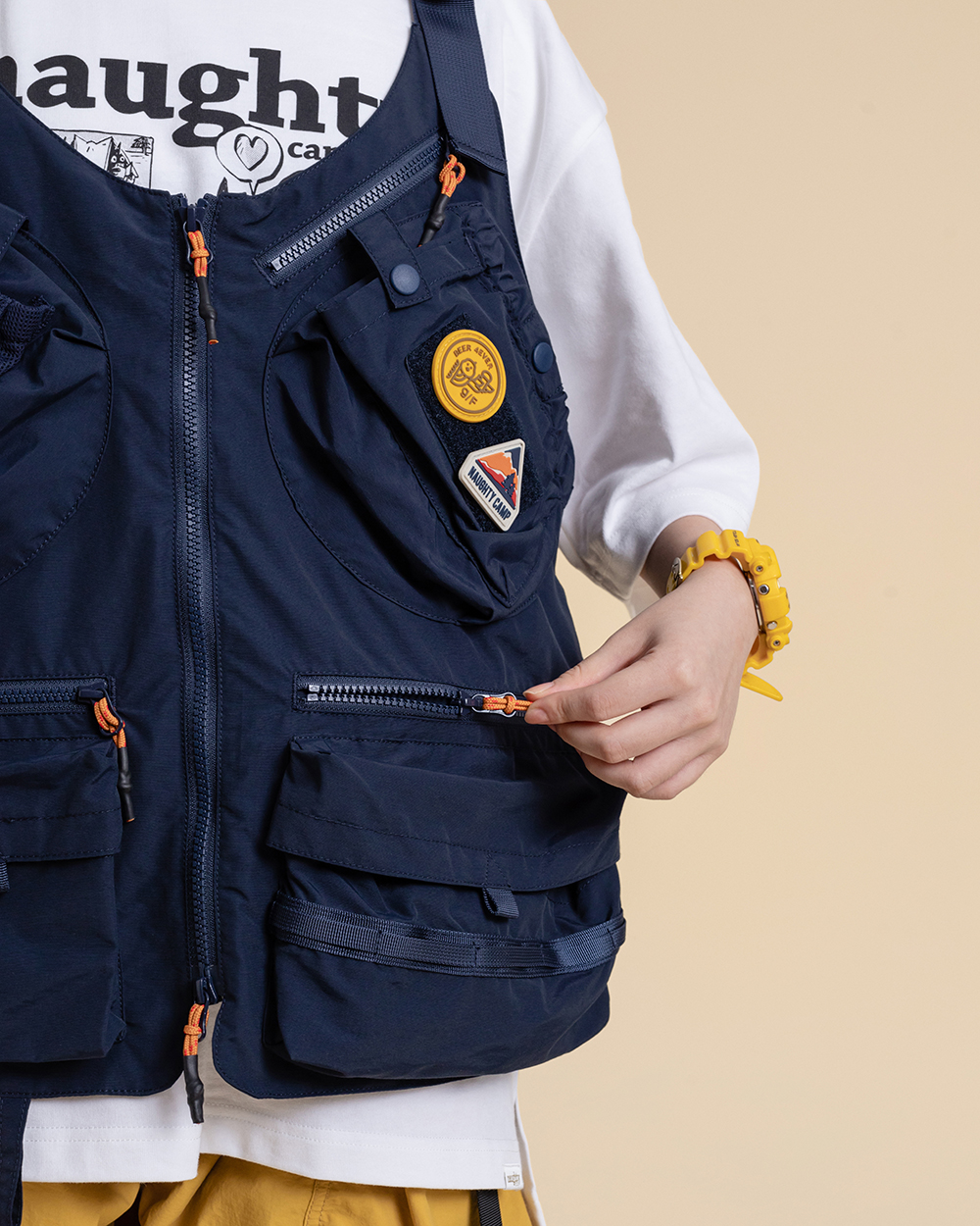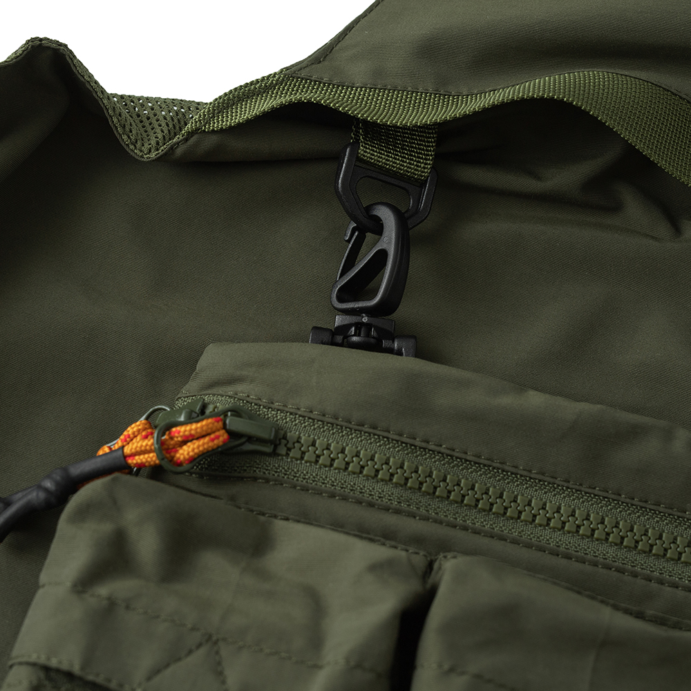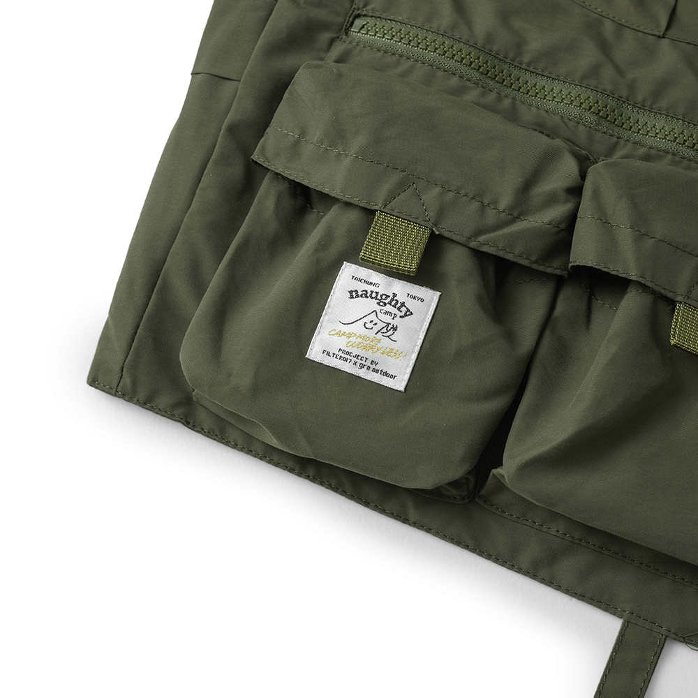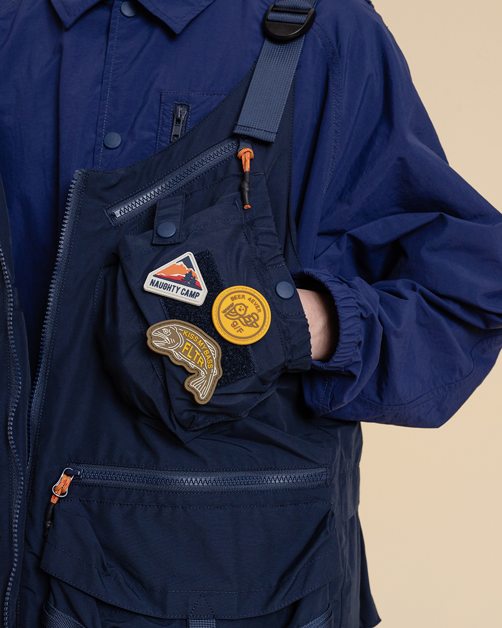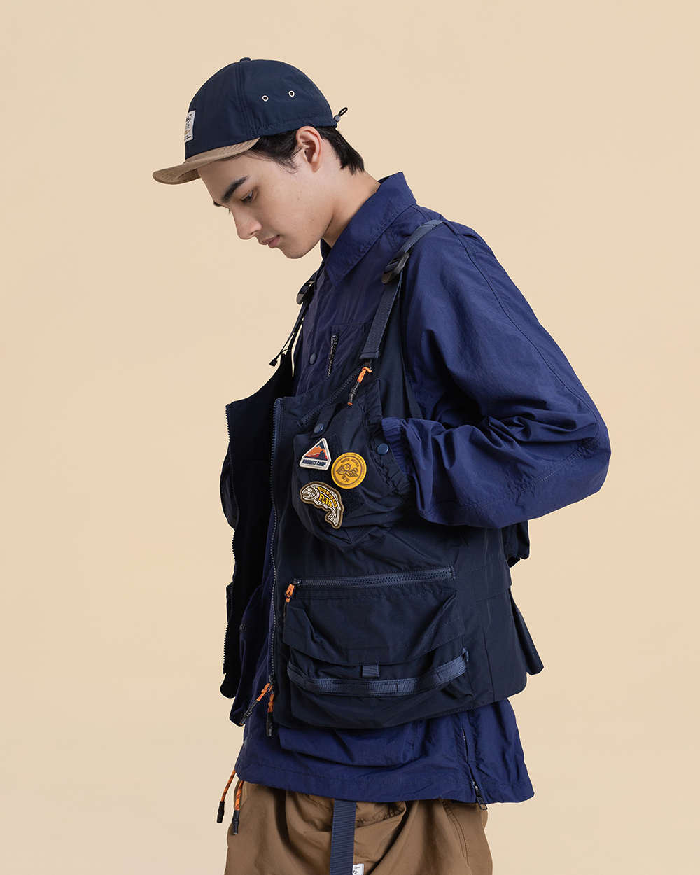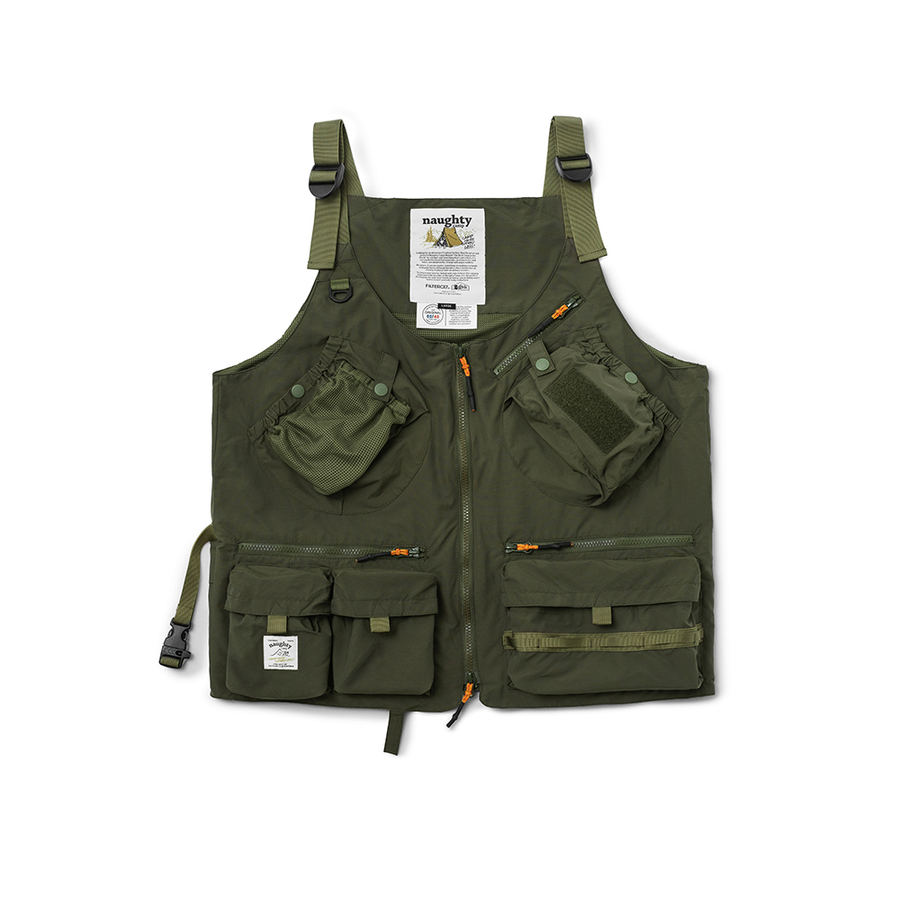 此外,背心背面的扣環上亦能加掛NAUGHTY CAMP戰術機能小包或是grn outdoor品牌TEBURA包款,增強背心於戶外著用時的機能與便利性。藉由高度裝載機能性,釋放拎著大包小包的雙手,盡情享受與人在山野之間活動的美景和樂趣,真正達到「手ぶら(空手)」設計理念。