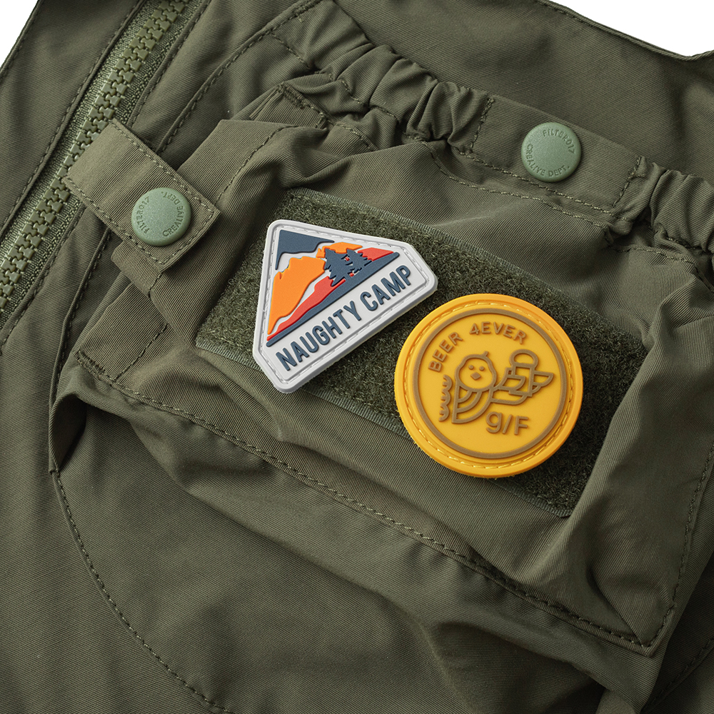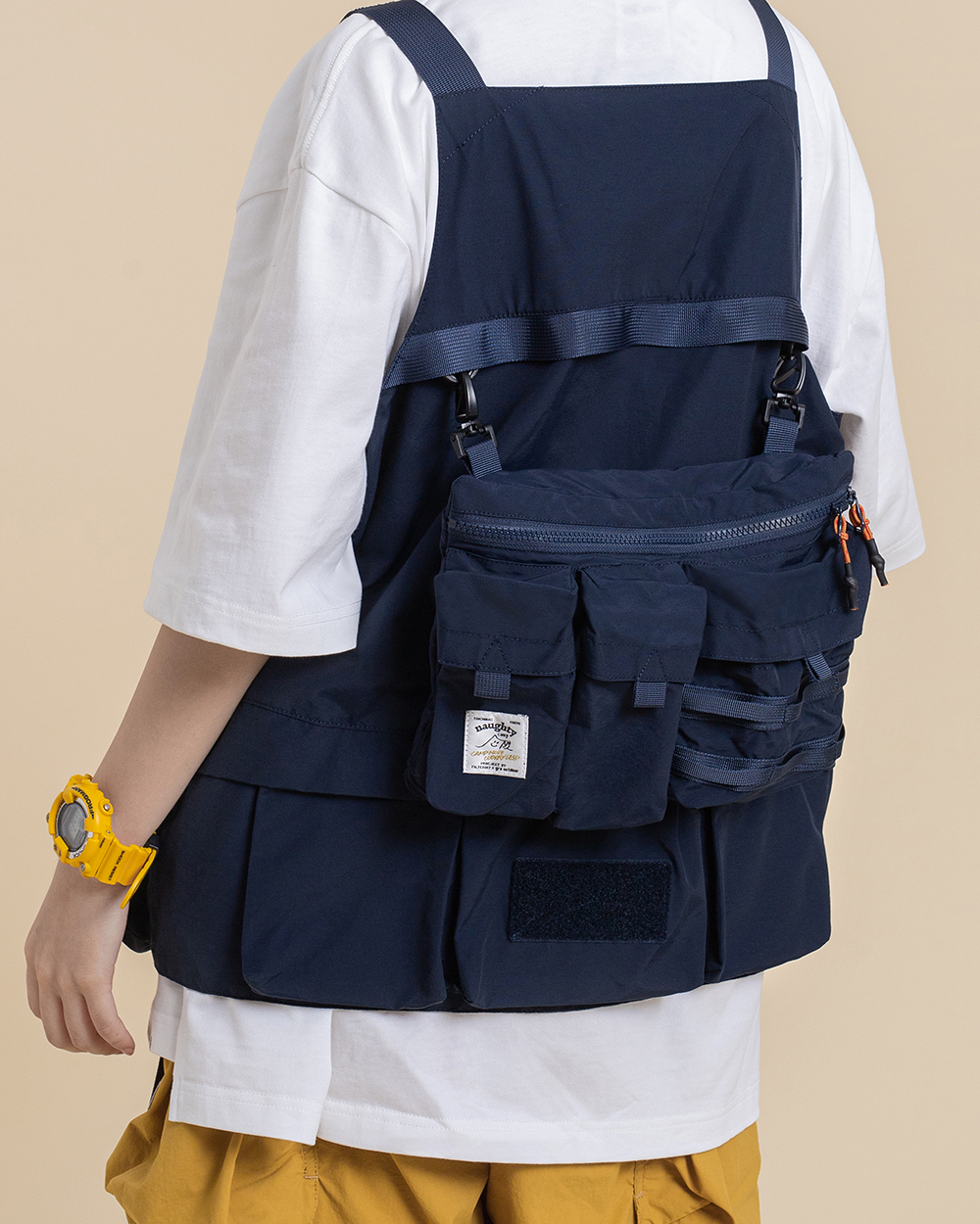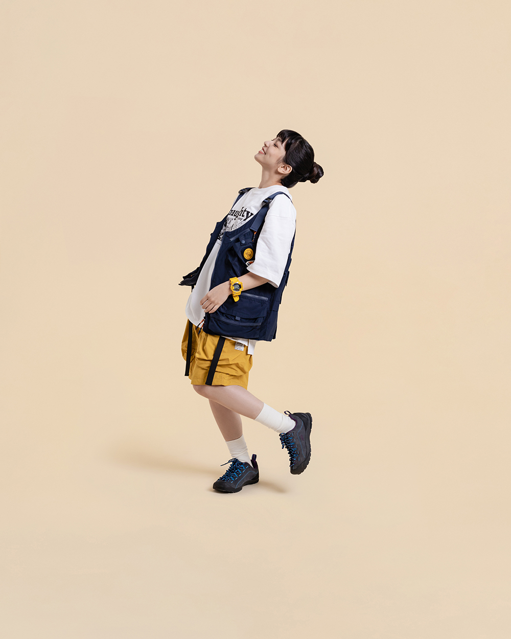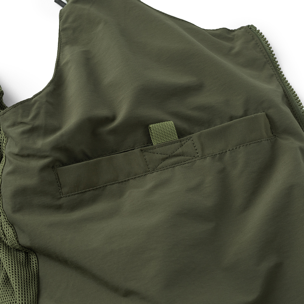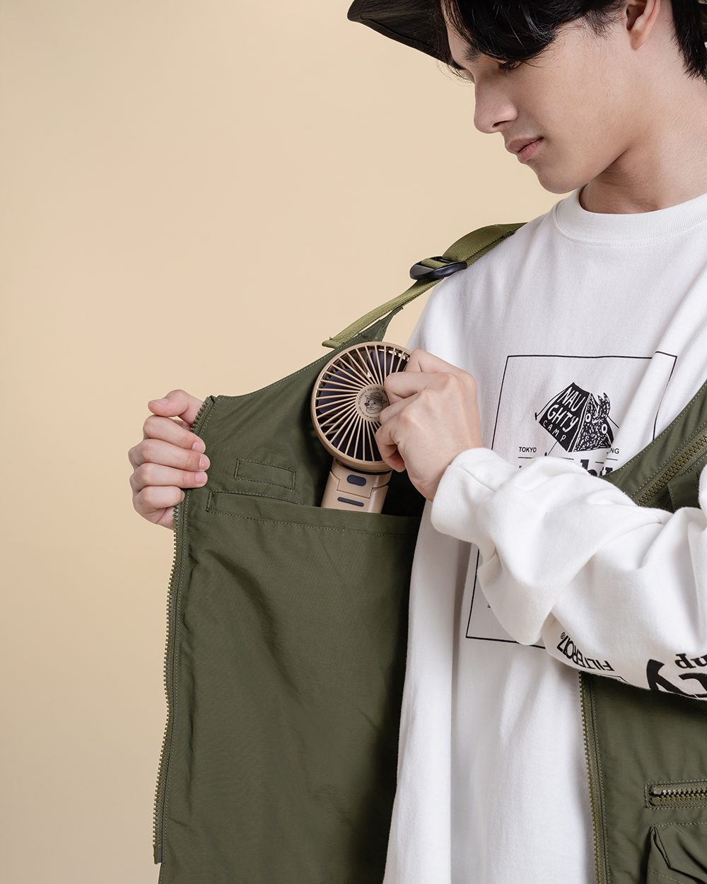 此外,背心背面的扣環上亦能加掛NAUGHTY CAMP戰術機能小包或是grn outdoor品牌TEBURA包款,增強背心於戶外著用時的機能與便利性。藉由高度裝載機能性,釋放拎著大包小包的雙手,盡情享受與人在山野之間活動的美景和樂趣,真正達到「手ぶら(空手)」設計理念。
