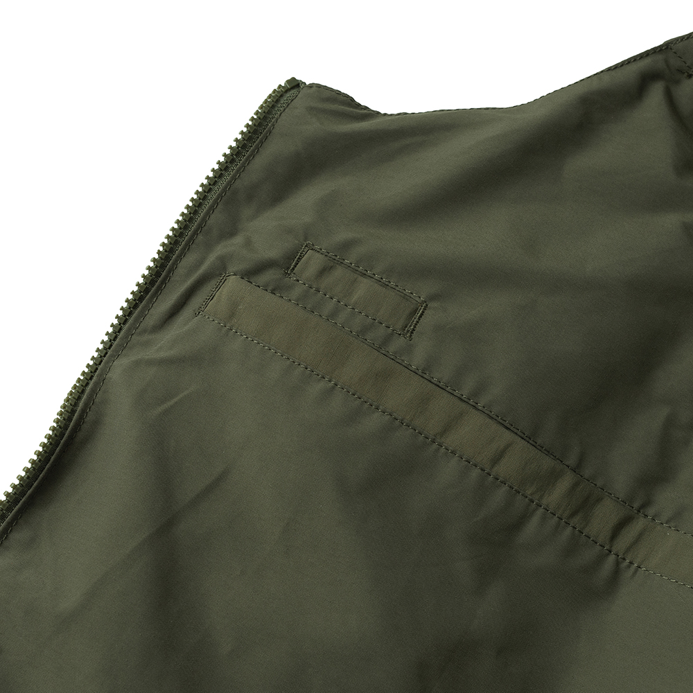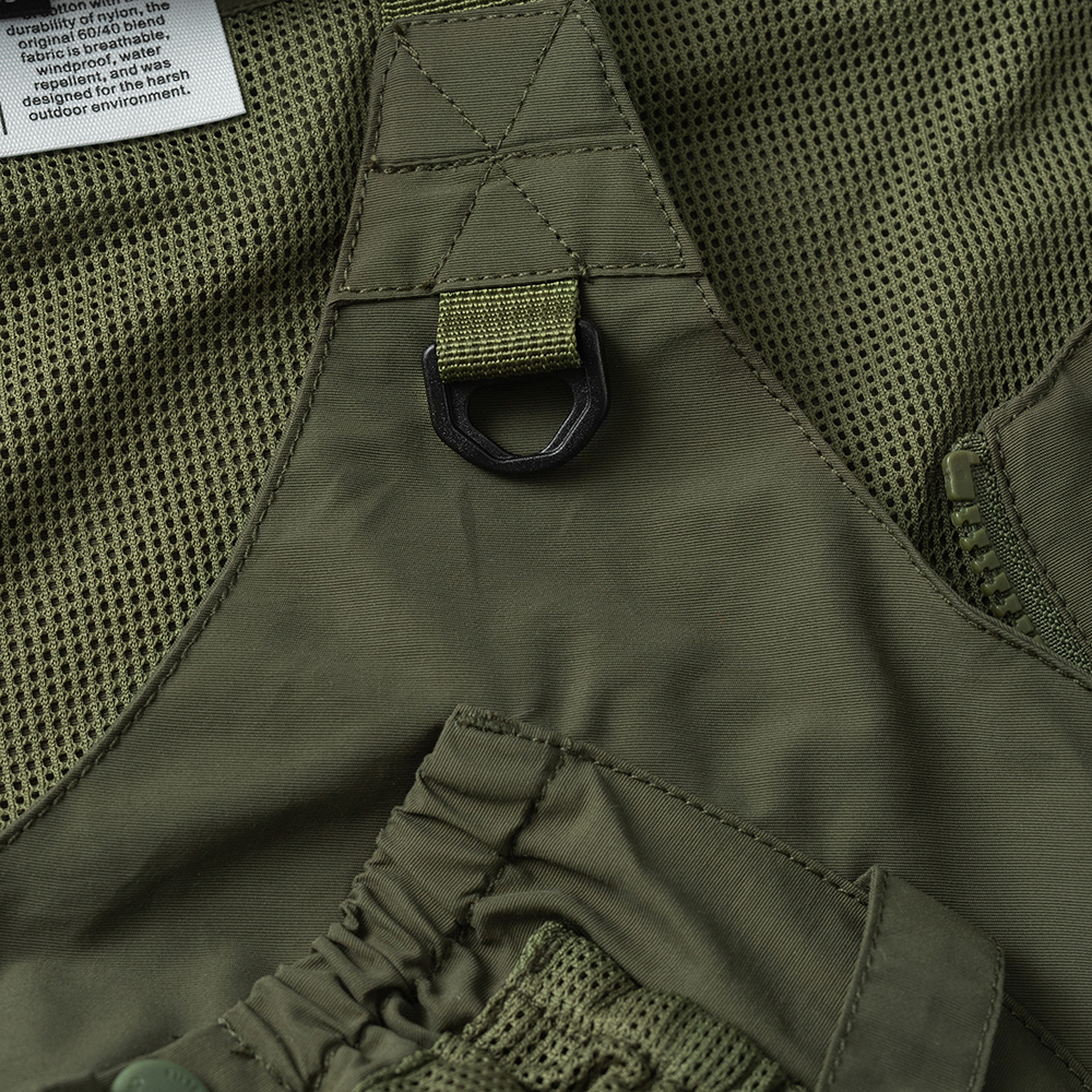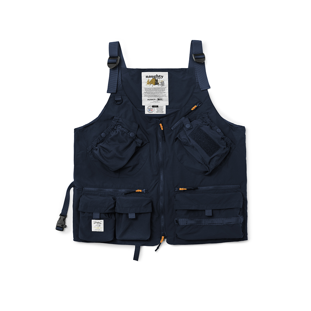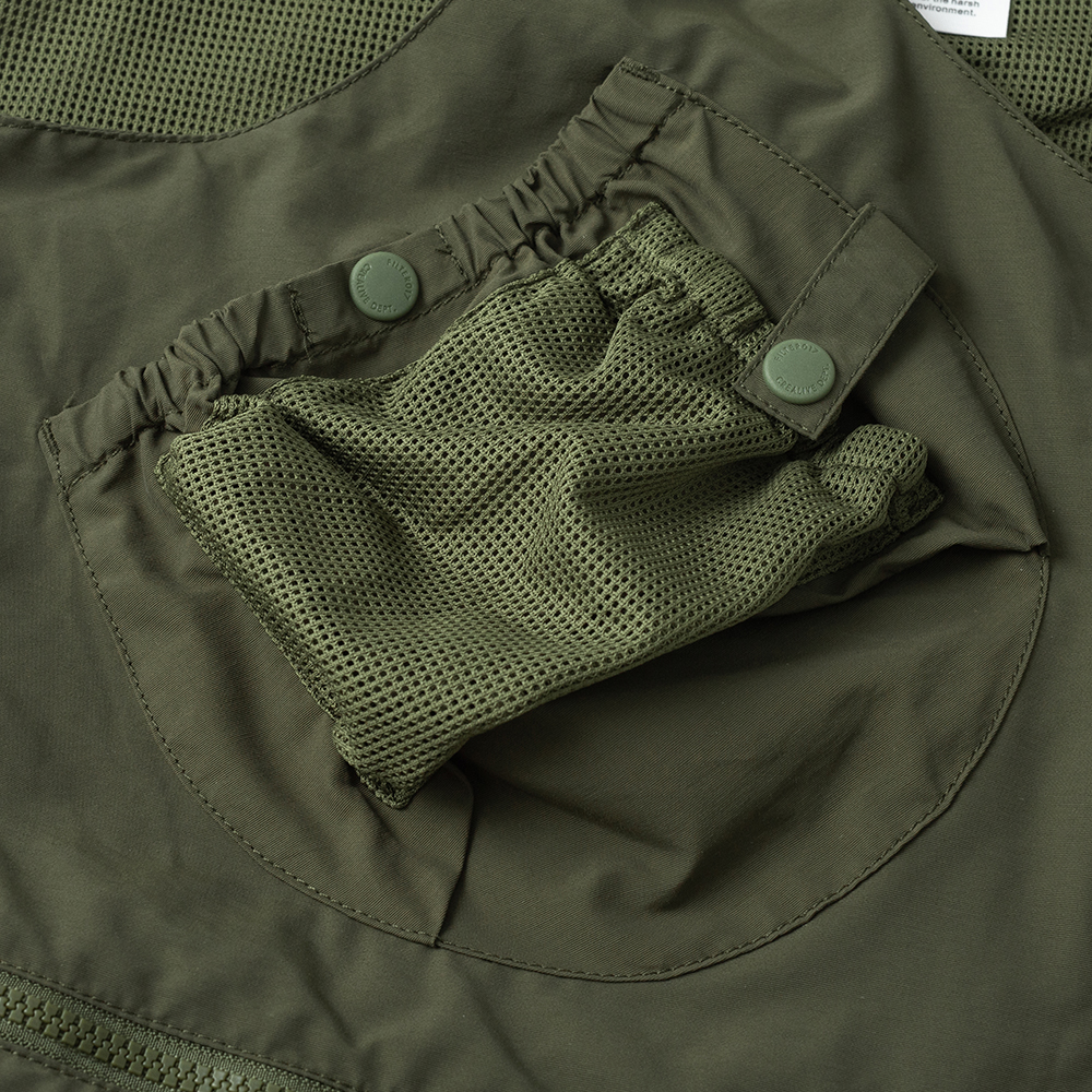 以grn outdoor品牌的定番人氣背心款式 - 「TEBURA VEST」作為藍本,以grn outdoor自行開發、復刻考究70年代戶外機能風格的「64混紡面料(Rokuyon Kurosu)」 製作,