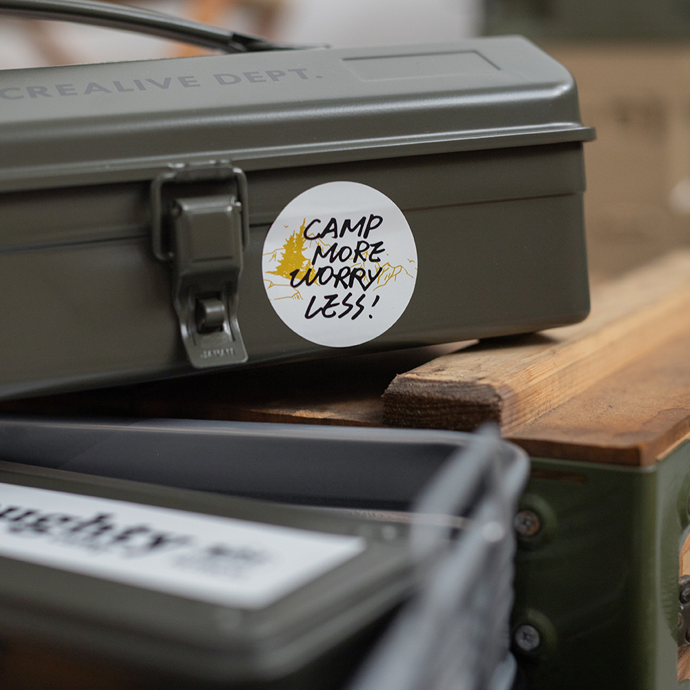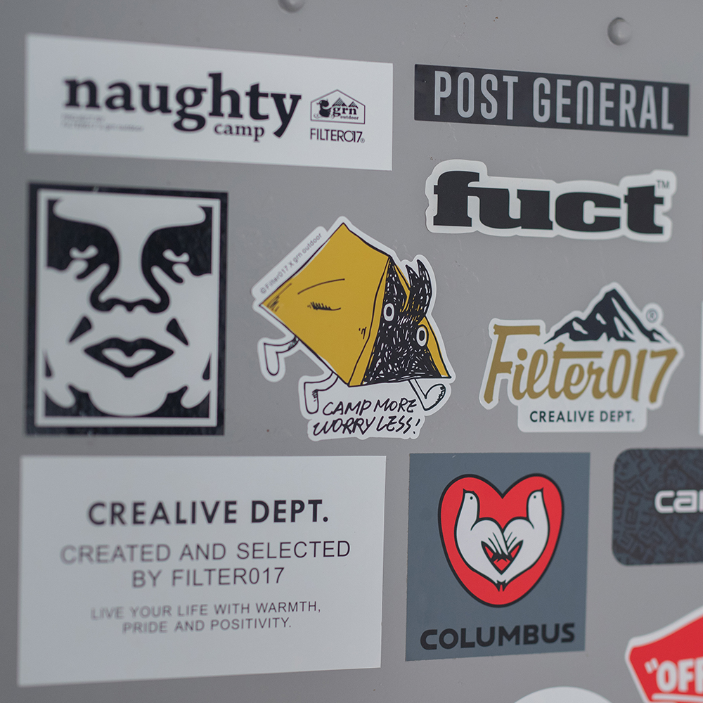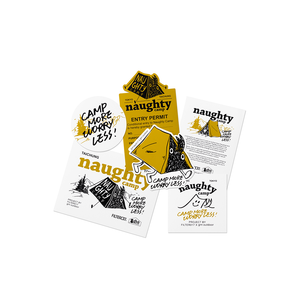 以自然戶外元素作為設計發想,結合雙方品牌及NAUGHTY CAMP支線概念及意象所設計的聯名圖像,利用網版印刷方式呈現於高品質之 PVC 材質貼紙中,與一般貼紙相較更為防水、抗撕、耐用、不殘膠且抗 UV 不易褪色,為INOUT質感生活增添亮眼點綴。