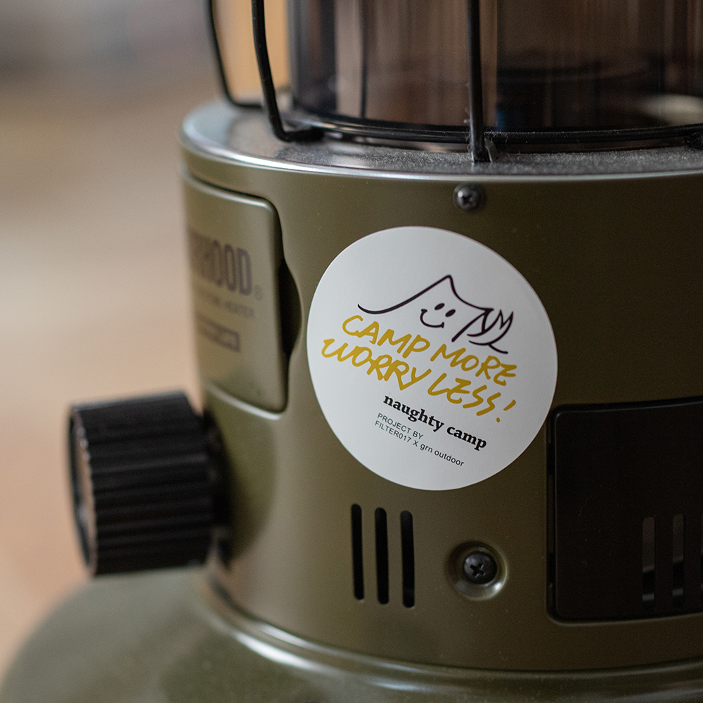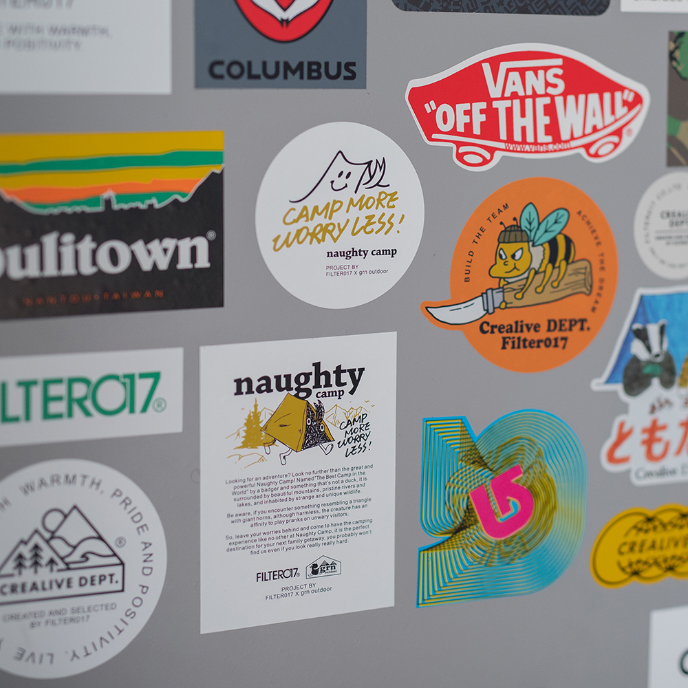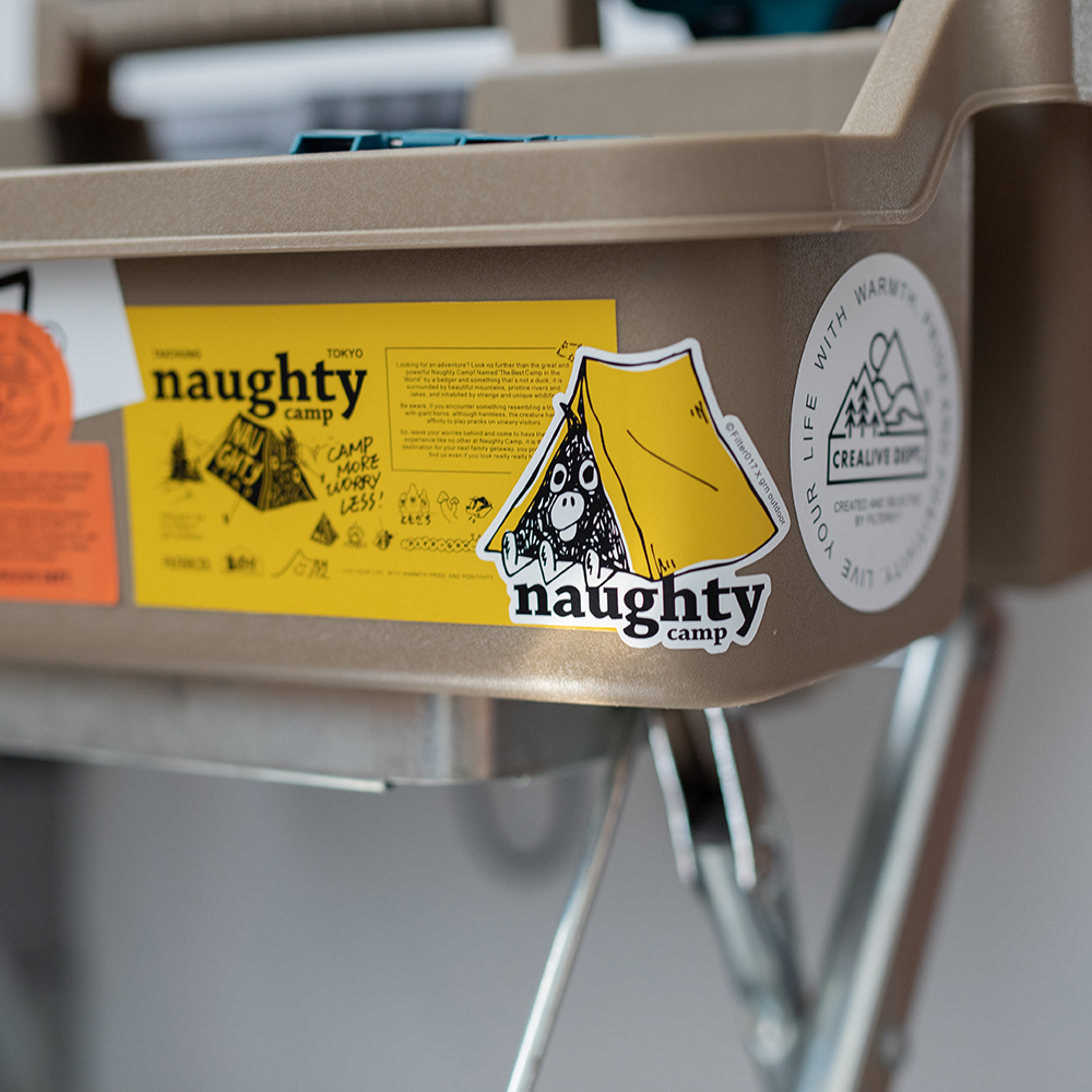 以自然戶外元素作為設計發想,結合雙方品牌及NAUGHTY CAMP支線概念及意象所設計的聯名圖像,利用網版印刷方式呈現於高品質之 PVC 材質貼紙中,與一般貼紙相較更為防水、抗撕、耐用、不殘膠且抗 UV 不易褪色,為INOUT質感生活增添亮眼點綴。