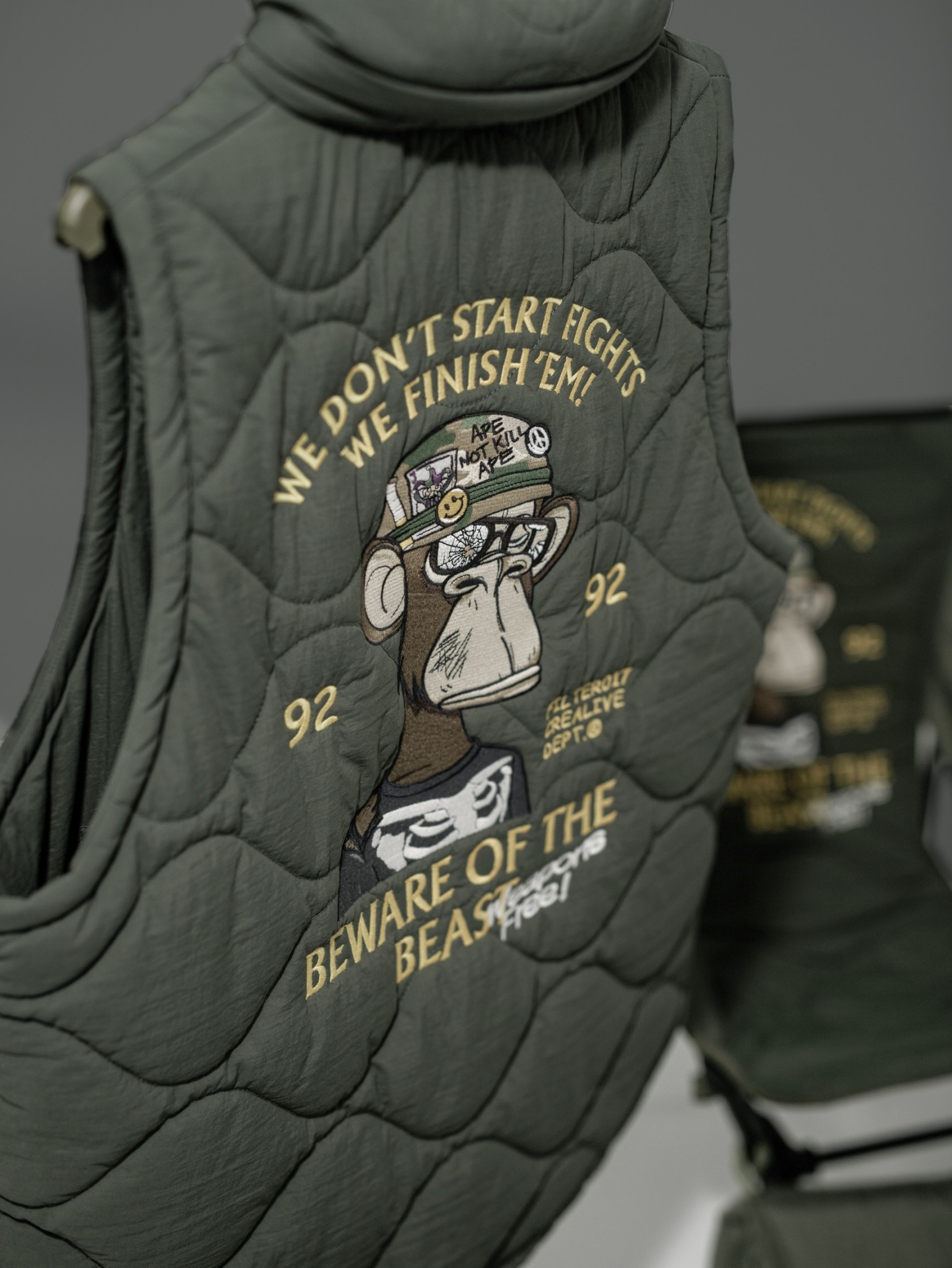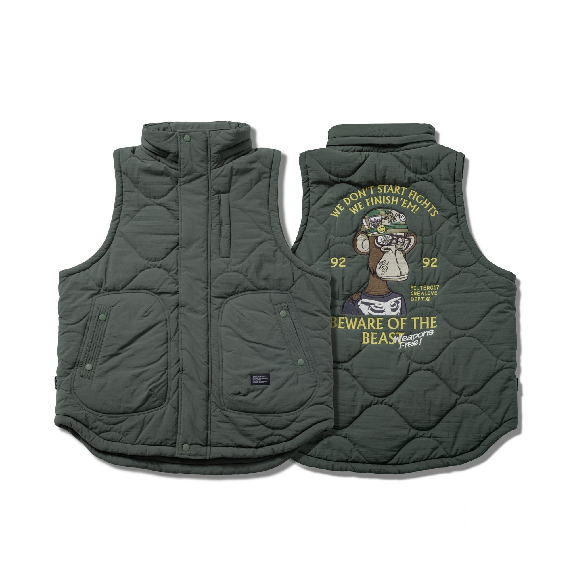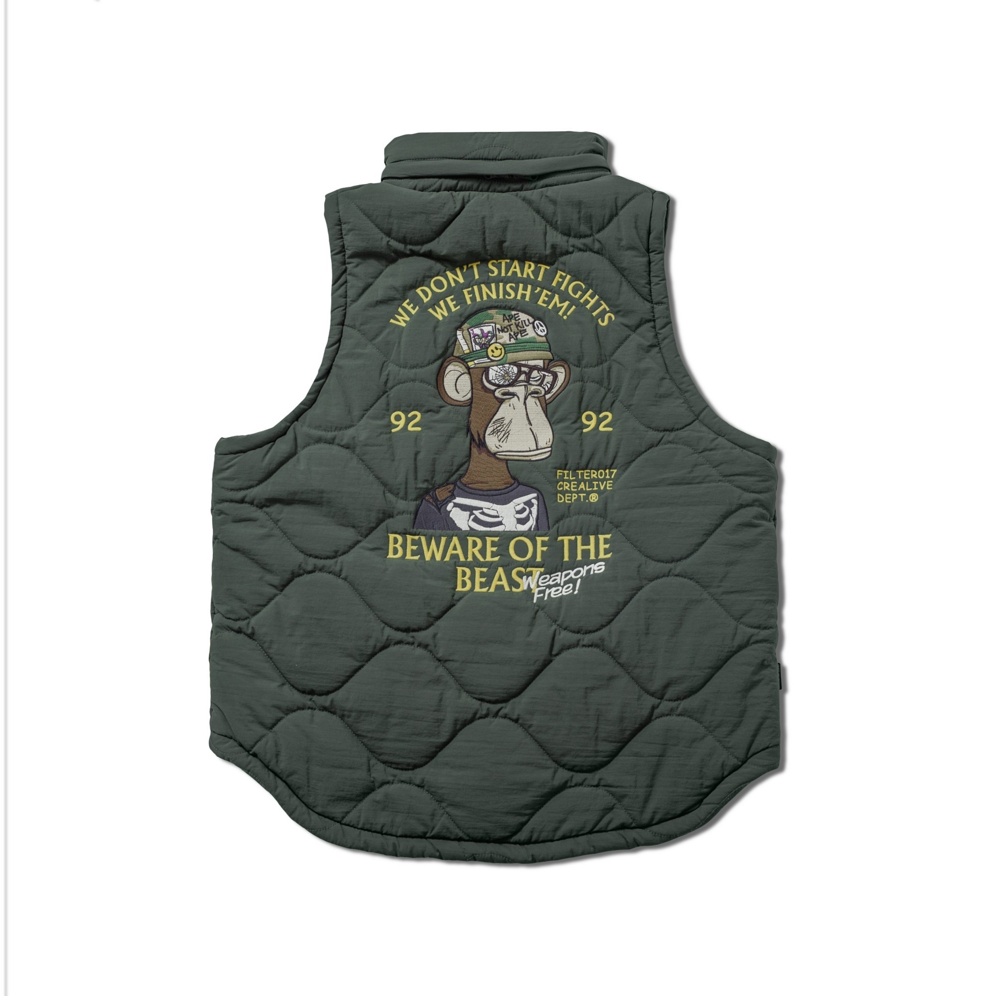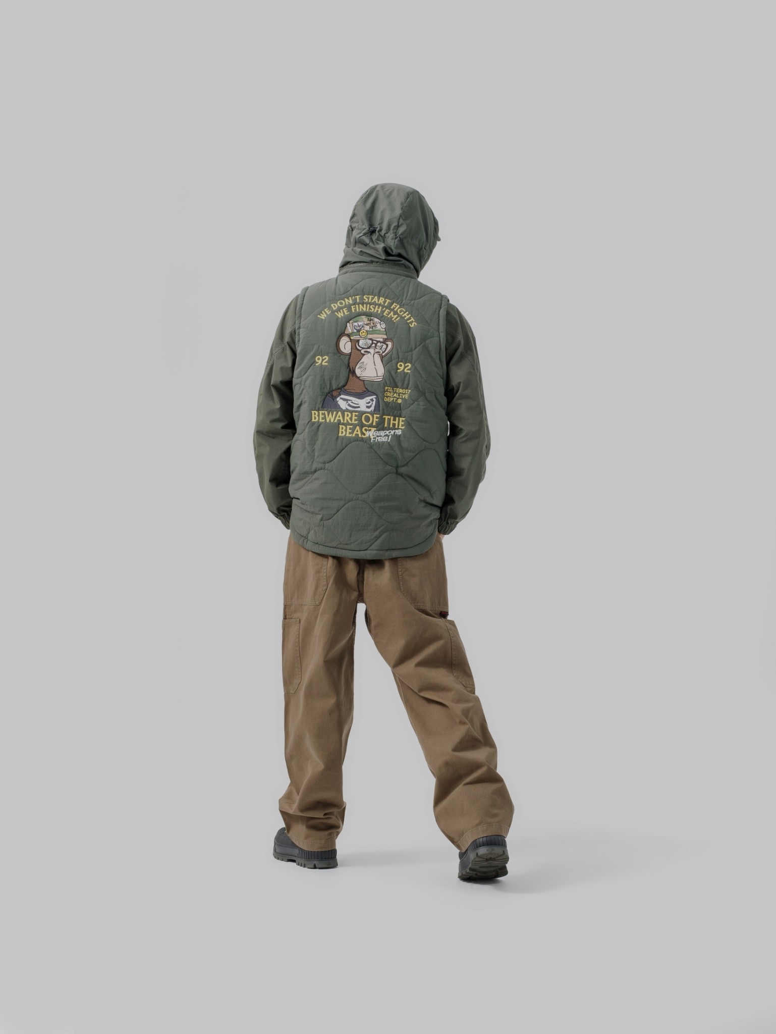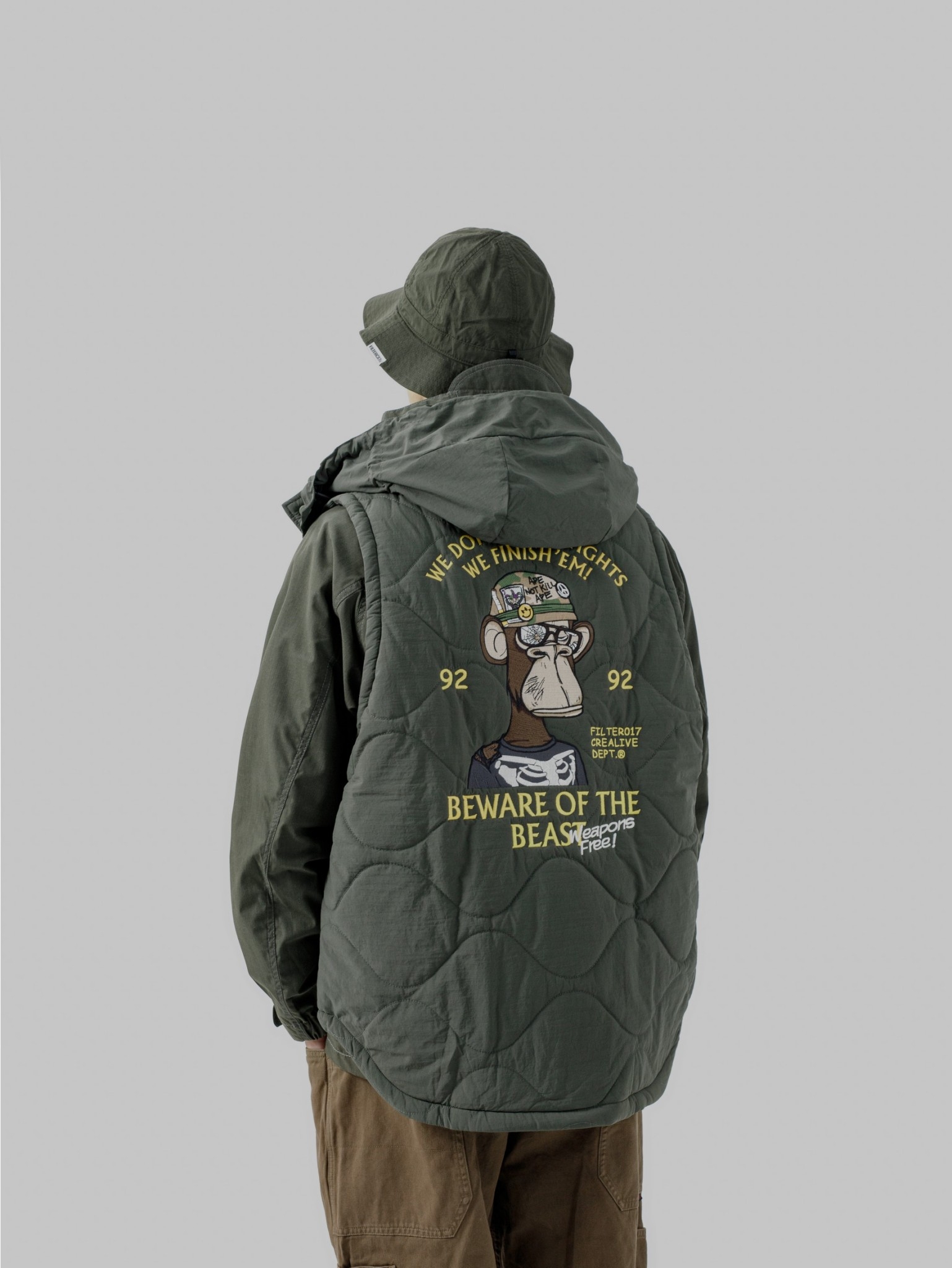 此款構築於保暖與層次造型之間的重點單品,以DARK FOREST 無聊猿圖像與意涵轉化為鮮明的軍事風格,採用細緻飽滿的大面積刺繡工藝,玩味出極具特色的主題輪廓,整體呈現帶有FILTER017® 品牌獨到詮釋的視覺語彙。