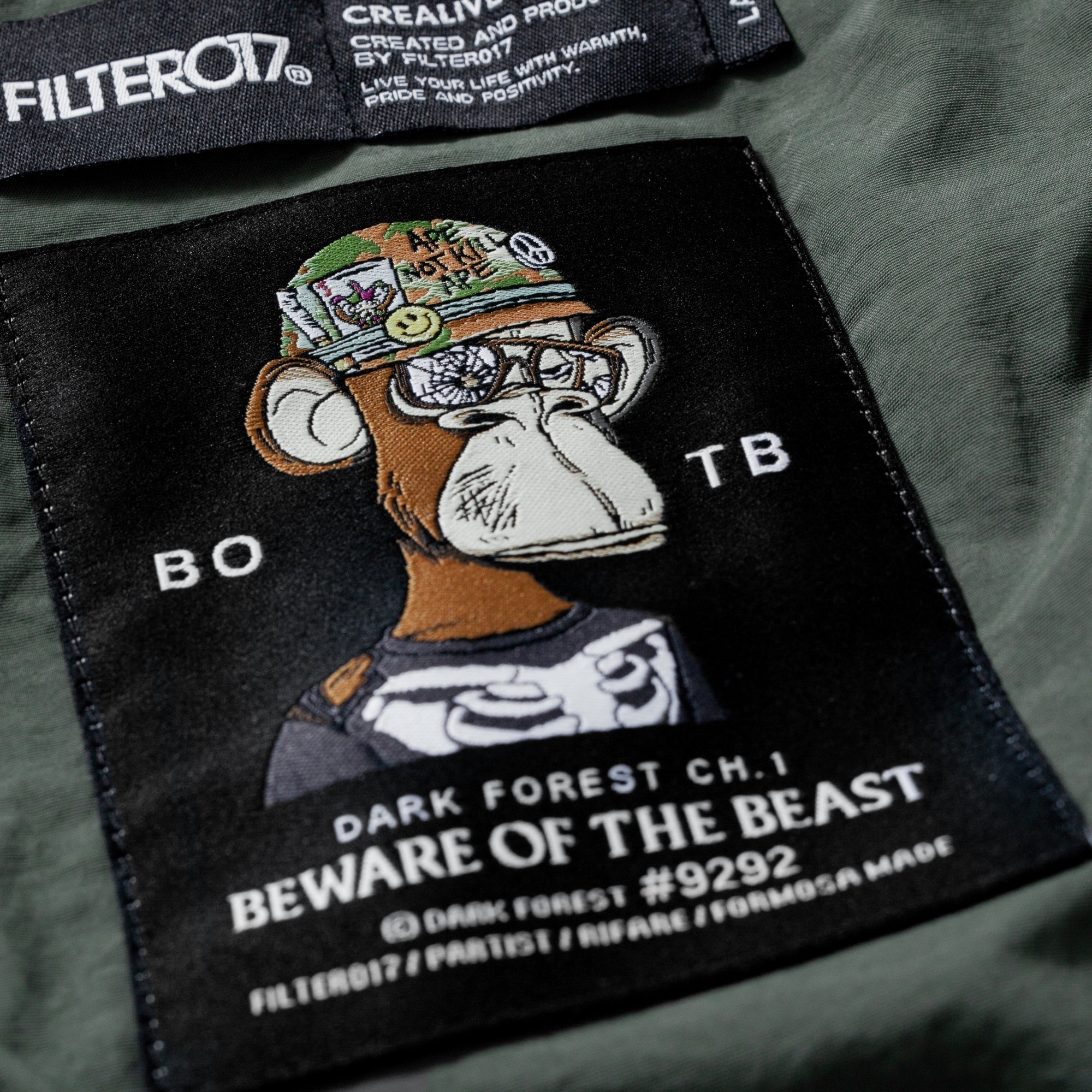 由BAYC #9292 持有者與Bayc Made By Apes 國際官方正版IP授權,FILTER017® 受邀參與由寶島製造(@formosamade )與Bored Ape Yacht Club(BAYC @boredapeyachtclub )#9292 專案團隊聯合發起的Phygital Street Fashion Web3 IP延伸項目《黑暗森林DARK FOREST》,