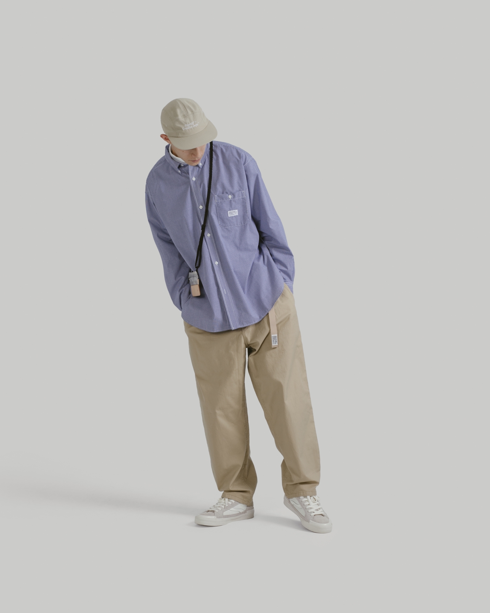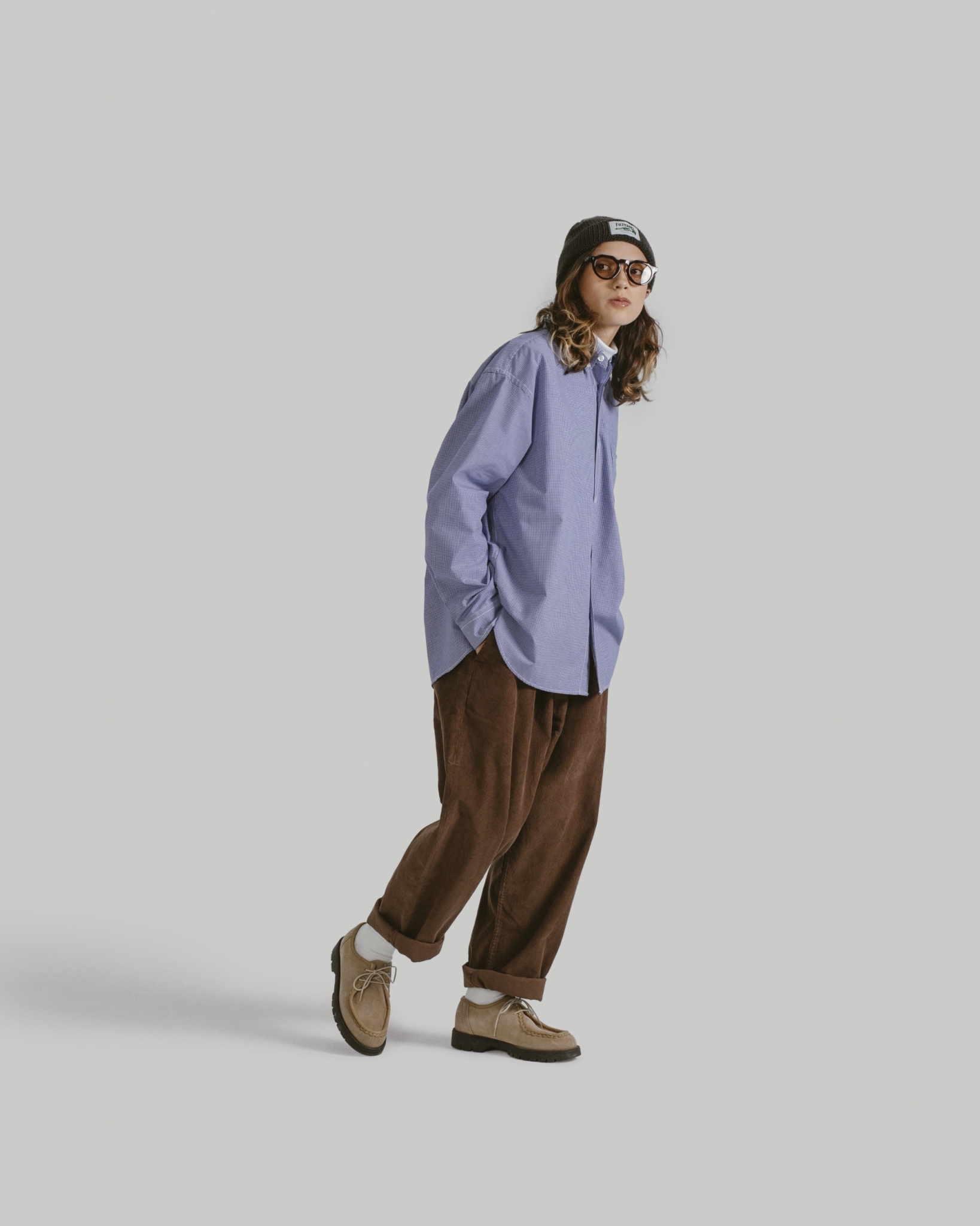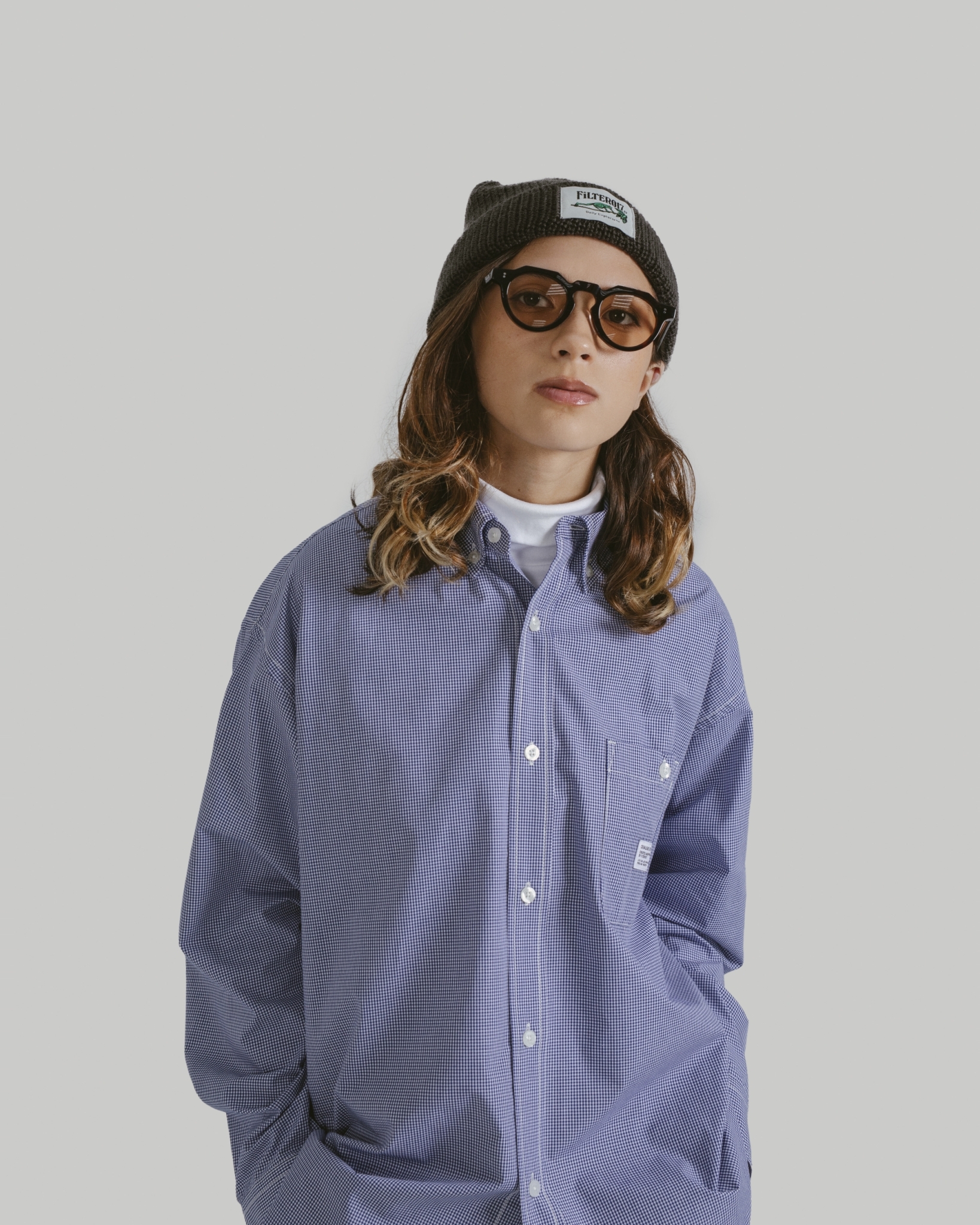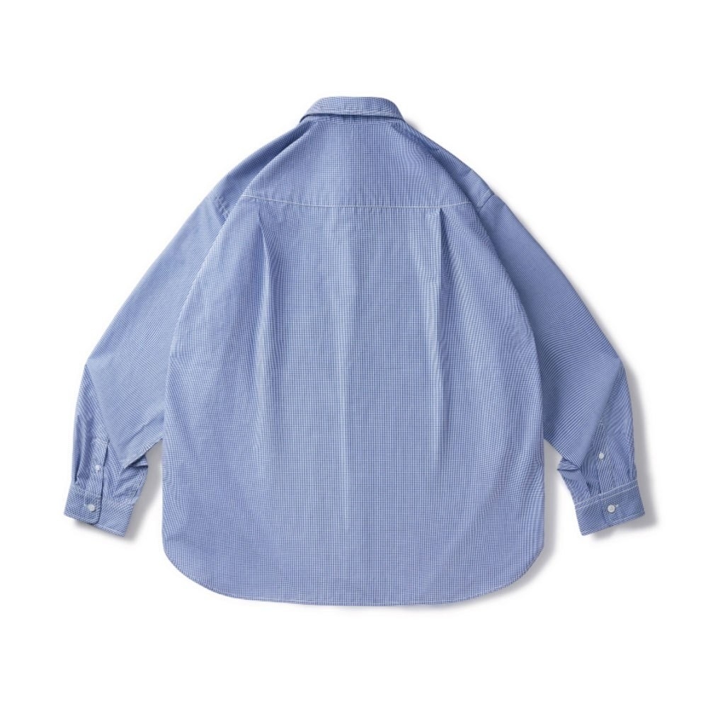 "Gingham"此種格紋源起於17世紀,以兩色線紗經由經、緯交織後呈現中間色調,為規律的三色格紋排列。此款襯衫以寬版輪廓版型為基礎,前短後長的下擺於兩側開衩以三角裁片加固,加上左右肩胛處以活折剪裁,增添行動時的延展空間使之更加舒適,並特選質感極佳的混紡面料與訂製鈕扣製作,為日常穿搭輕鬆營造豐富層次感。