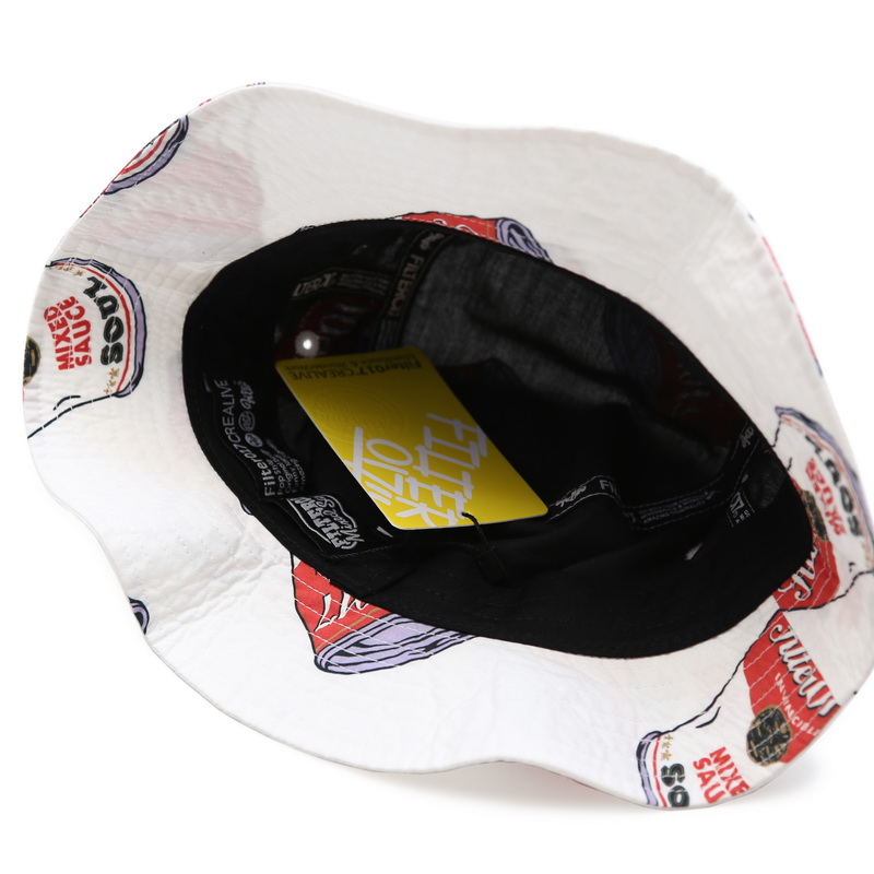 滿版的湯罐印花圖像,搭配上剪裁俐落的漁夫帽版型,