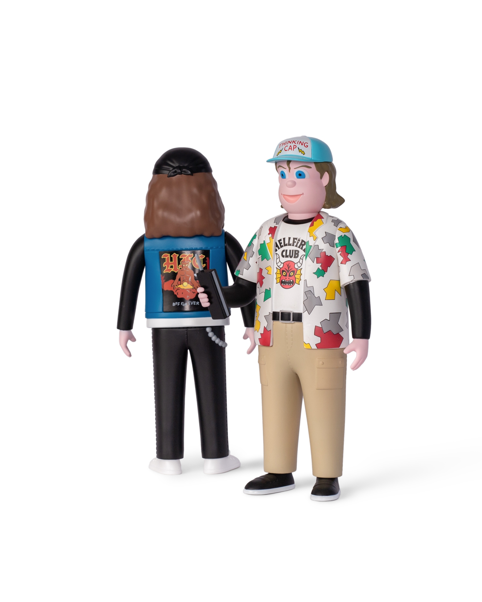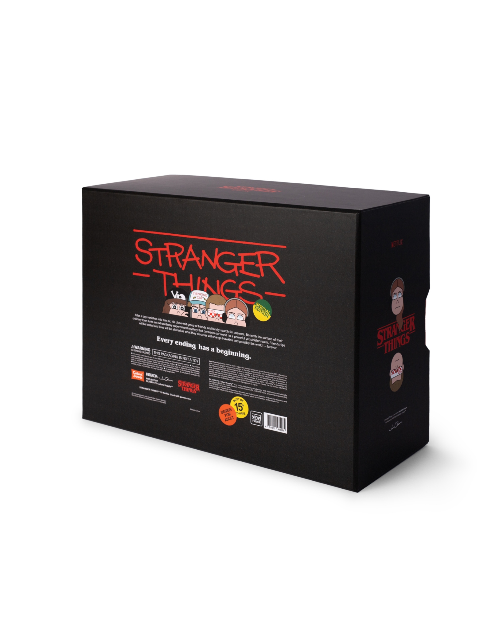 以全球熱播美劇《怪奇物語》第4 季核心角色與劇情主軸“友情”為靈感,融合80 年代美式經典風格與科幻元素,考究原作人物細節人設與造型,邀請日本知名藝術家Jun Oson 合作 ,以其“花生臉型”角色風格進行藝術插畫的轉換,並以PVC搪膠材質,透過複雜程序與製作工法,精緻呈現Jun Oson 所詮釋的立體造型特色,巧妙復刻劇中角色經典的形象。