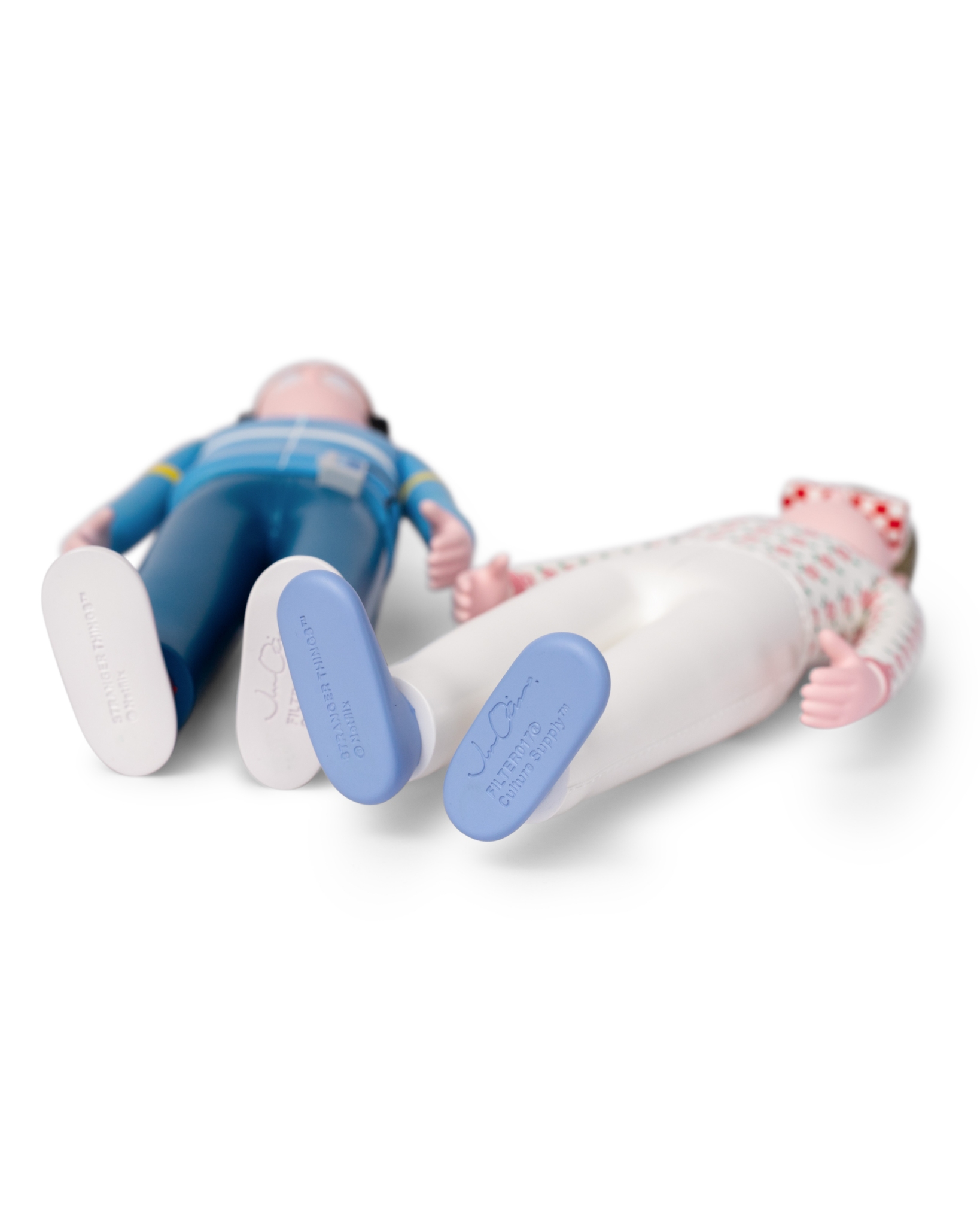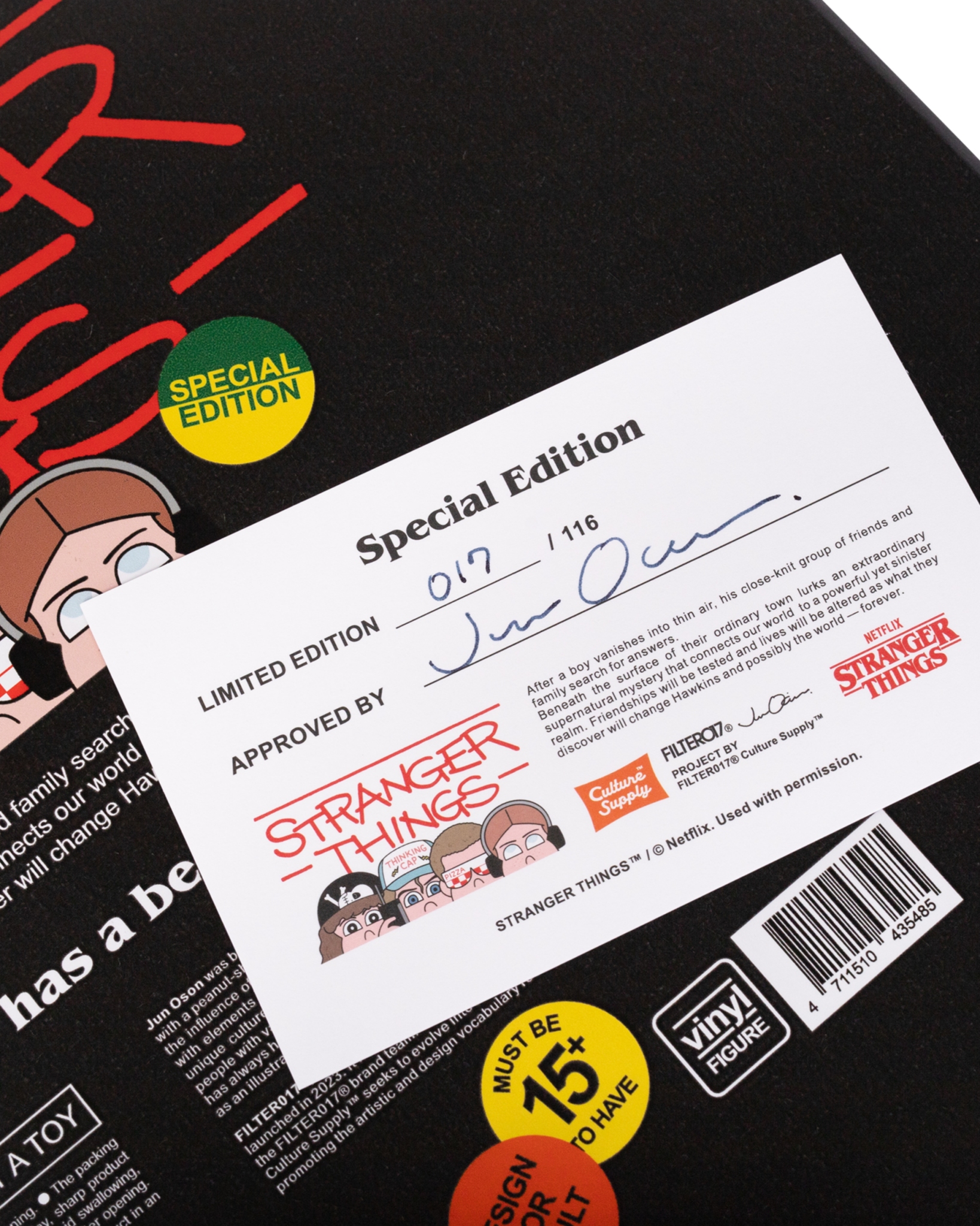 此次發行「海外限量特別版套組」全球限量僅116 套。在造型與細節之處,與經典版有著玩味巧妙的不同,更顯收藏價值。台灣將與日本、香港同步販售,台灣少量釋出,數量有限售完為止,永不再版。一套四入,內容包含,戴著特製Pizza眼罩,進入Max精神世界的Eleven、困在顛倒世界藉由音樂激勵奮力逃出的Max、在顛倒世界展現勇氣無所畏懼的Eddie,及樂觀正向積極聯絡隊友的Dustin,共4款劇中特殊場景時的角色之立體造型收藏軟膠,每套內附藝術家Jun Oson 親筆簽名限量證書卡。將FILTER017® 擅長的元素混合語彙延伸創意,以80年代"VHS錄影帶"造型概念為精裝外盒設計,透過磨砂霧面的透明PVC包材,使內裝角色的輪廓隱約展現,增添玩味巧思,每只角色造型高度約10英吋,實體手感具有扎實分量,部分零件為可動結構,精緻的塗裝及繁複的圖紋移印工藝,並由台灣知名設計師玩具單位INTOY 生產技術協力,賦予收藏成品高度完整性,無論是FILTER017® 支持者、藝術設計與復古文化愛好者、《怪奇物語》劇迷,亦或是Jun Oson 藝術收藏家,皆能在此次的藝術軟膠套裝中,感受到飽滿的誠意與細節。
