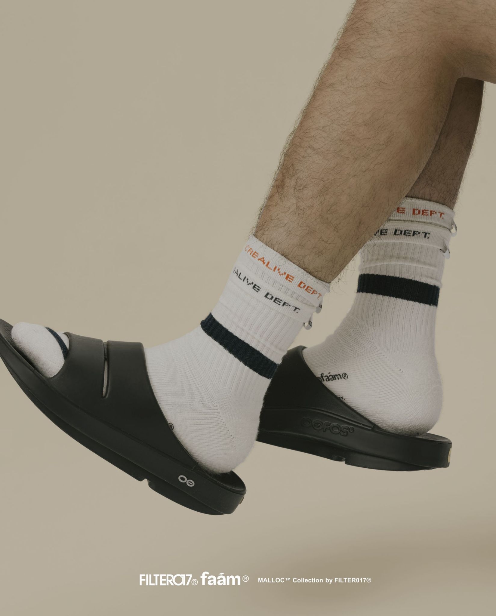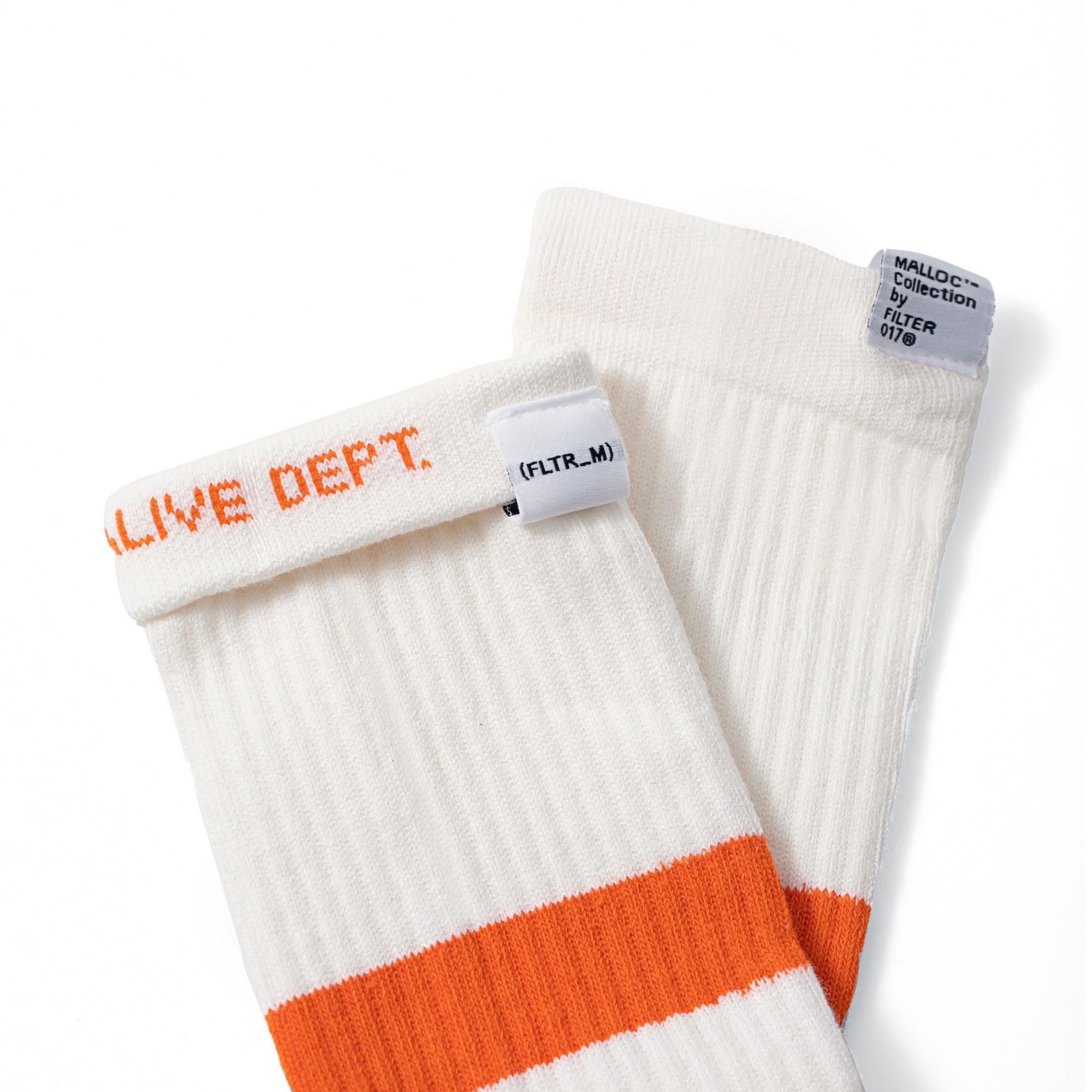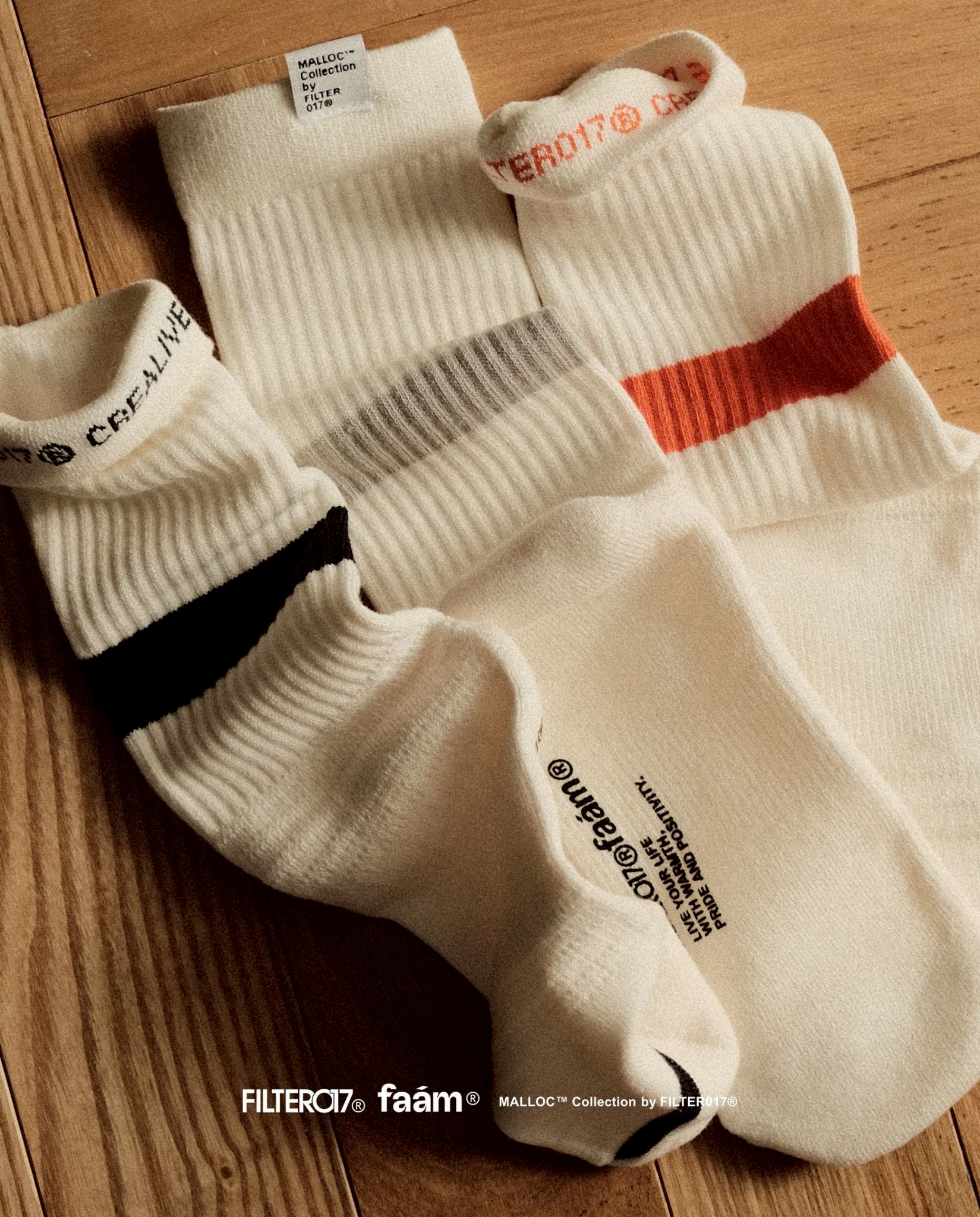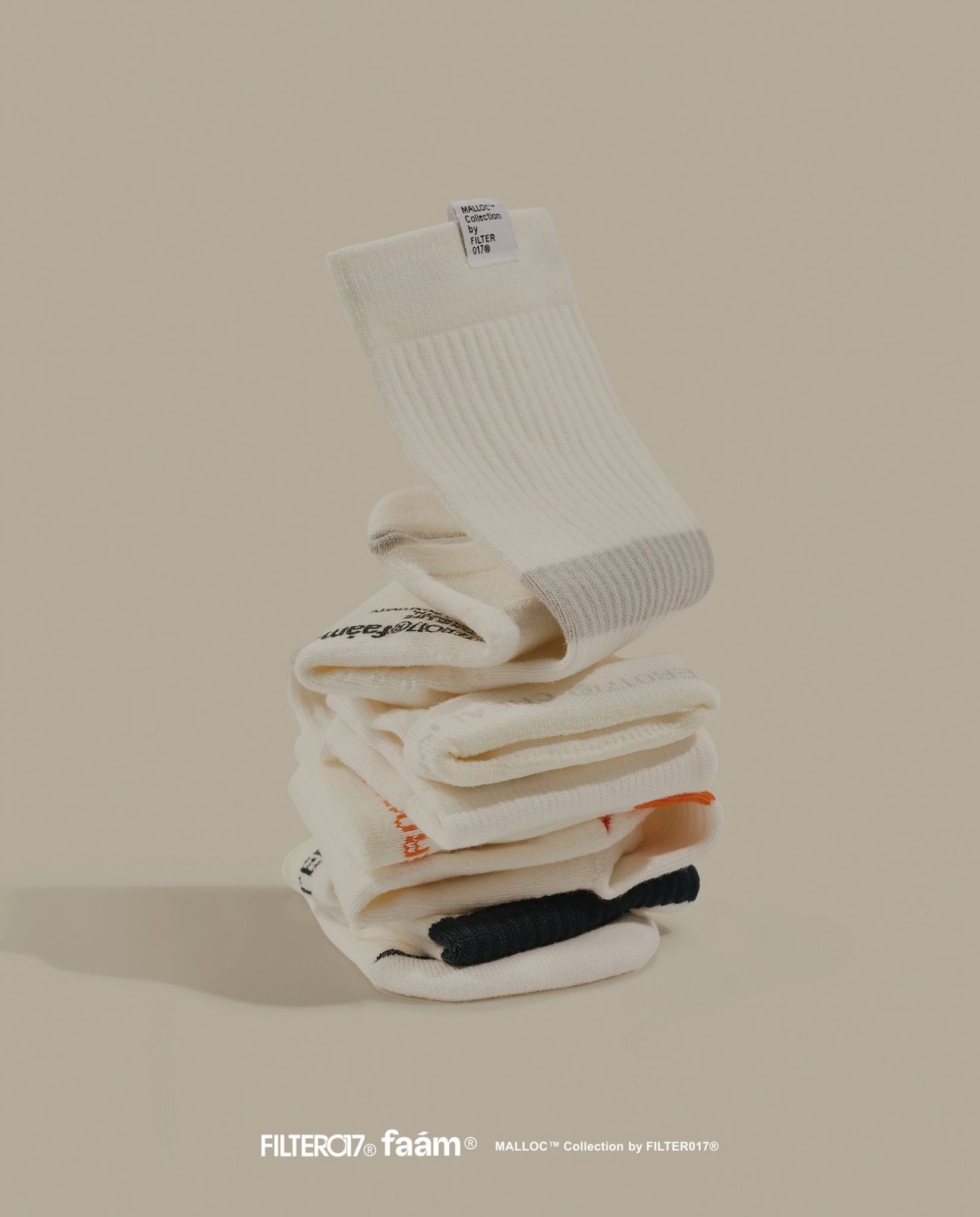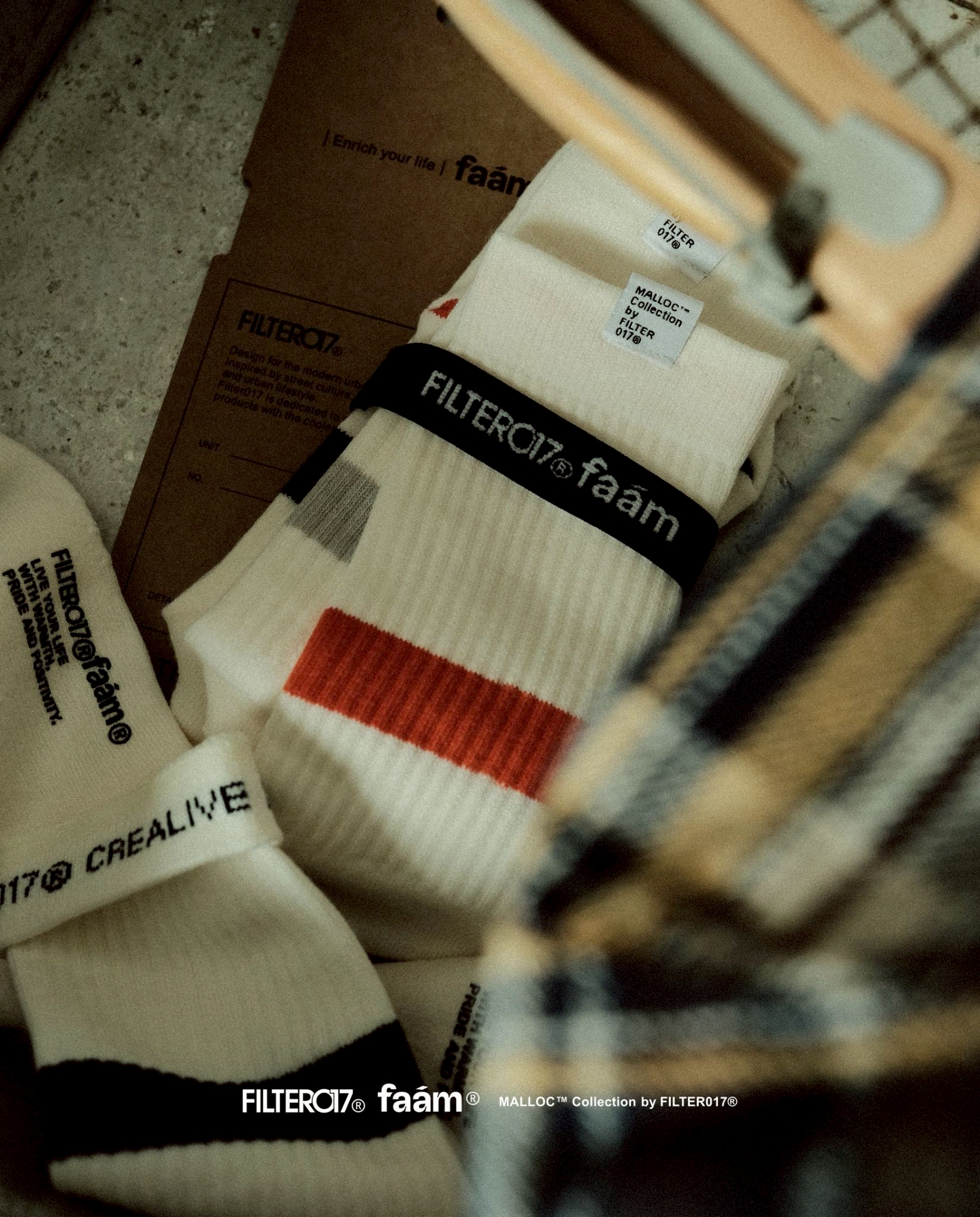 本次復刻新作用選用象牙白作為襪身本體,以MALLOC™ 織標及襪底印刷詮釋聯名細節,襪管內側提花FILTER017® 品牌字樣,著用時可反摺增加外觀搭配上的視覺靈活性。