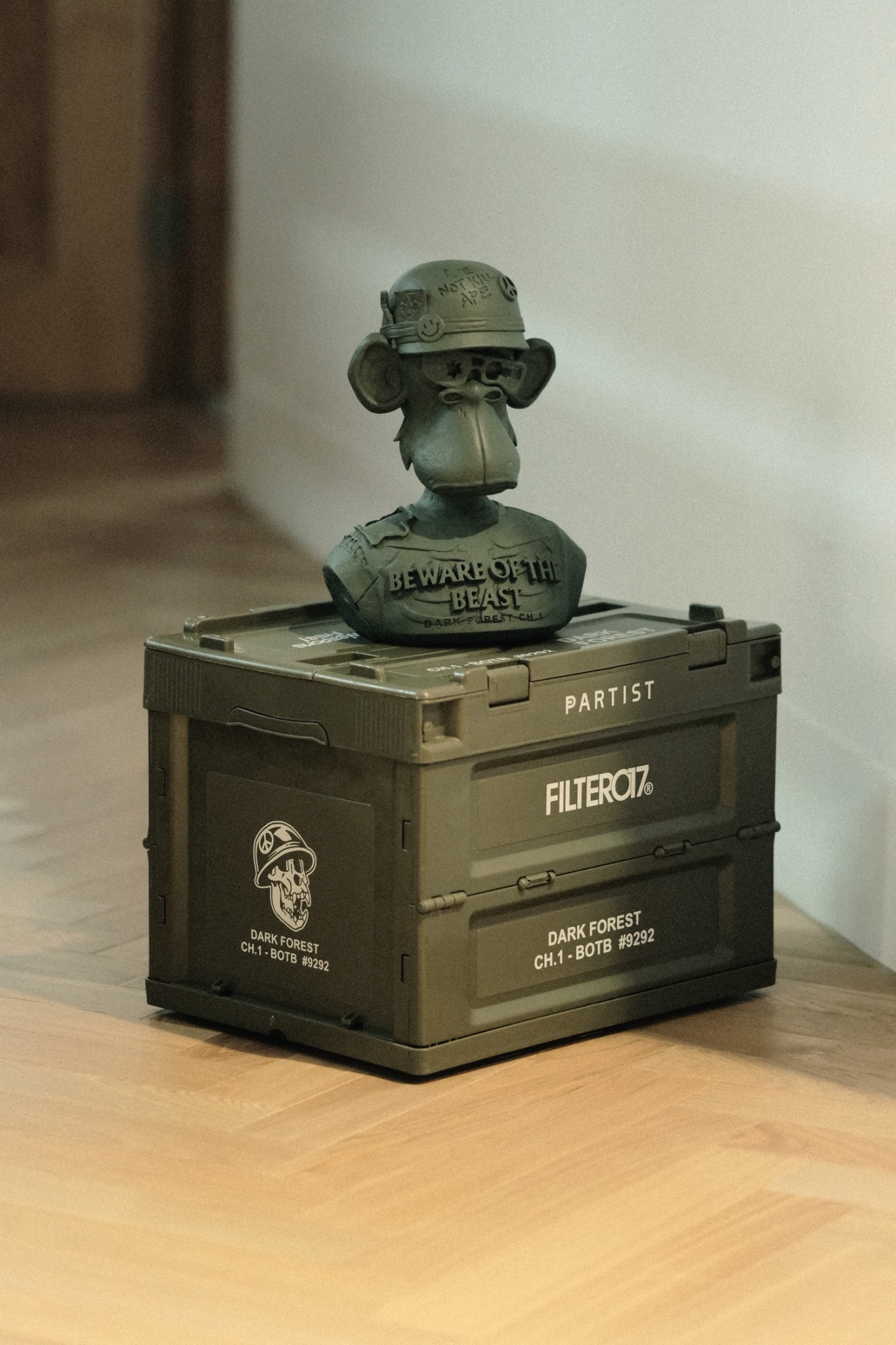 本軍箱精裝限定版附加以FILTER017® 品牌28L戰術收納箱裝載包裝無聊猿搪膠戰爭胸像本體。胸像本體高約11英吋,巨大厚實的分量質感,適合作為空間擺件,特別委託台灣知名設計師玩具單位IN TOY ( @intoyinc2020 ) 技術協力,以藝術收藏為製作標準的限量誠意之作,為本系列最具代表性單品。