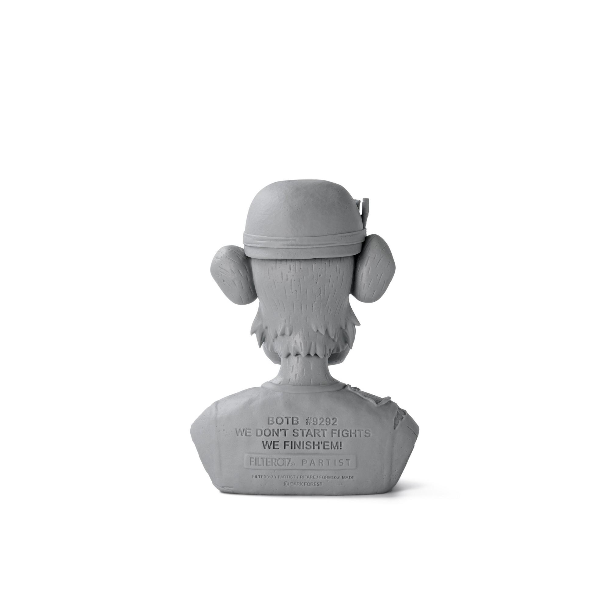 完美3D立體化還原呈現主題角色之無聊猿造型,考究經典戰爭紀念胸像形式,以PVC搪膠模擬混泥土灌漿雕塑材質,細膩仿真的碎石裂痕與氣孔,真實還原歷經戰事與歲月洗禮的斑駁痕跡,前後胸身刻劃硬朗俐落的英文字樣更加提點出本次主題核心與視覺重點。