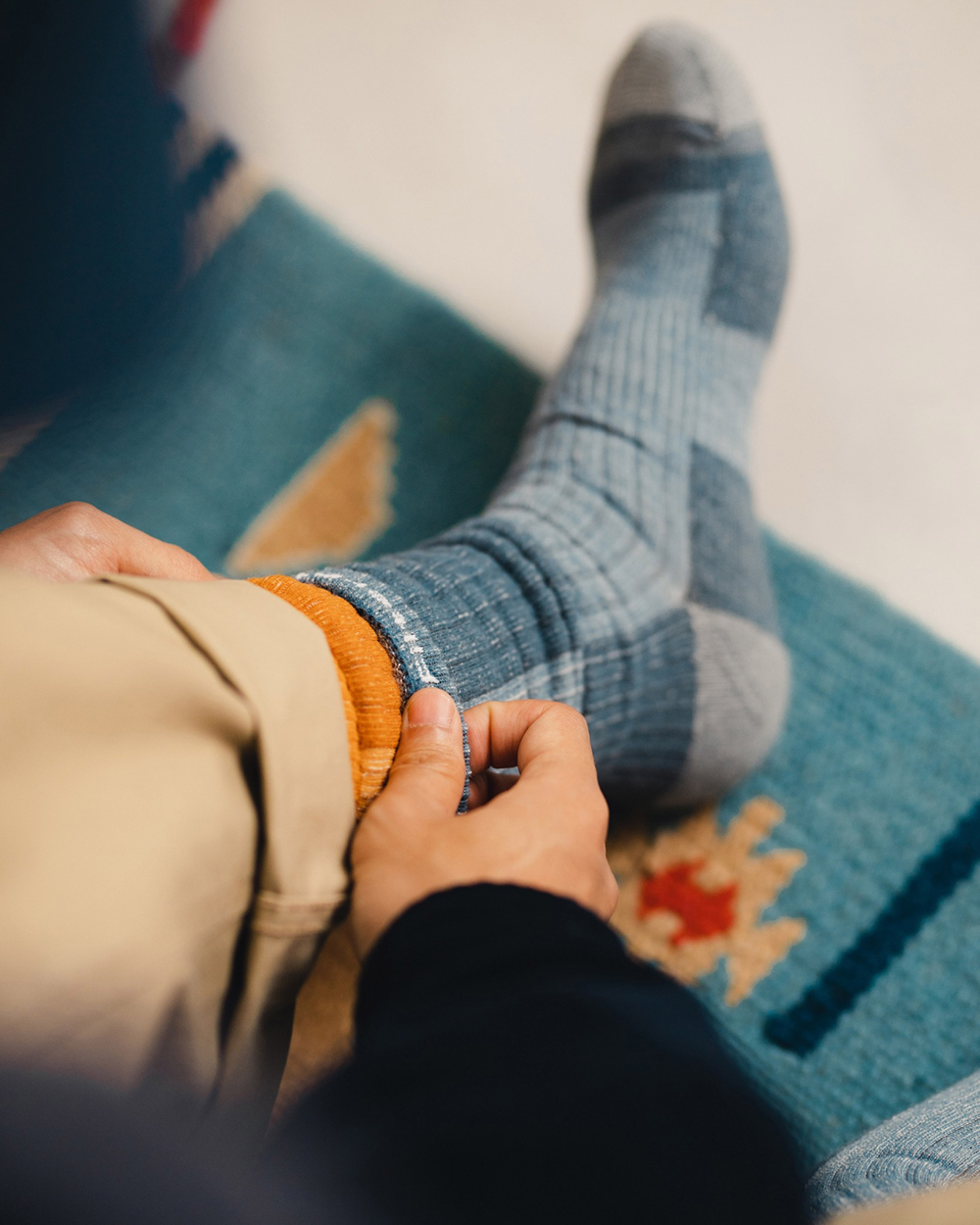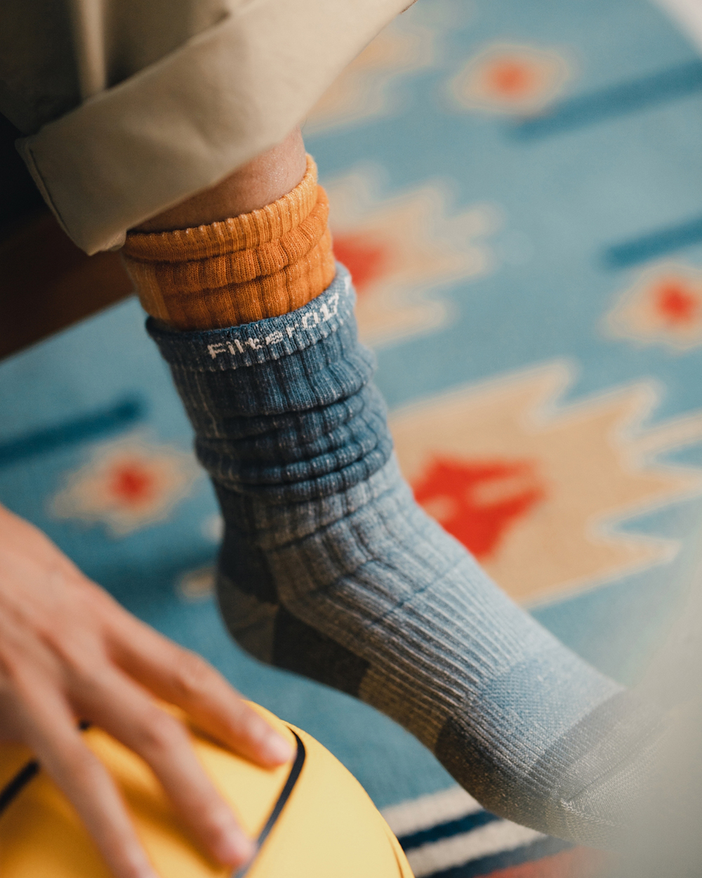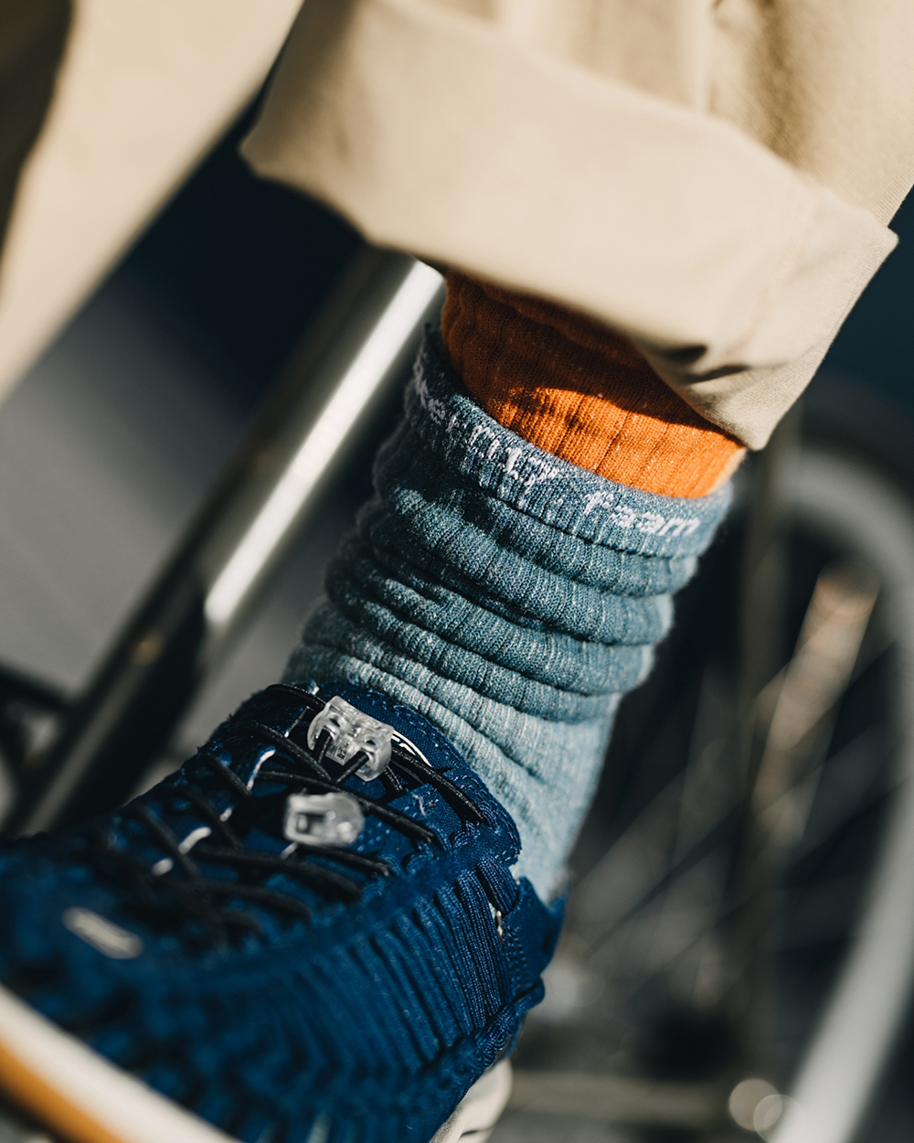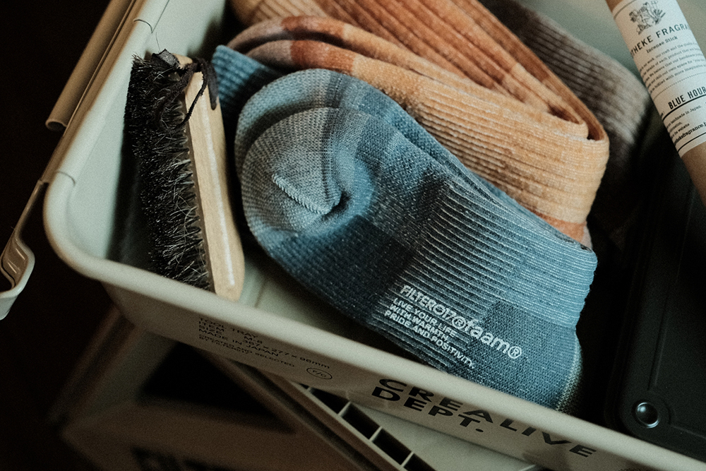 視覺設計呈現靈感源於洗鍊舊化的丹寧面料,陳藉由羊毛胚紗色及織品結構,營造出水洗落色的氛圍,並於襪身加入色塊拼接,使襪身表面富有古布拼接的輪廓與視覺,充分詮釋演繹出Filter017® 於復古流行與戶外休閒的品牌軸向。