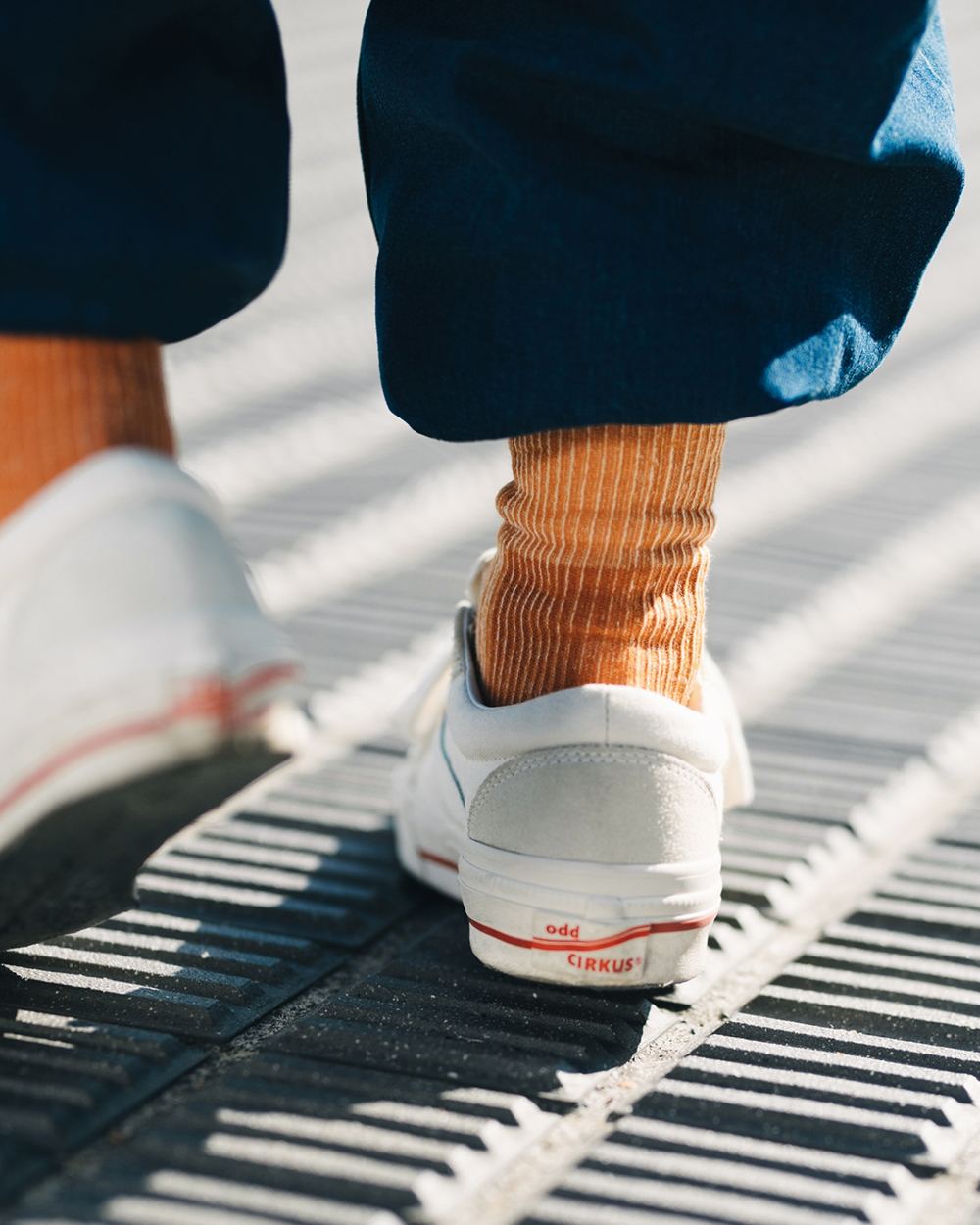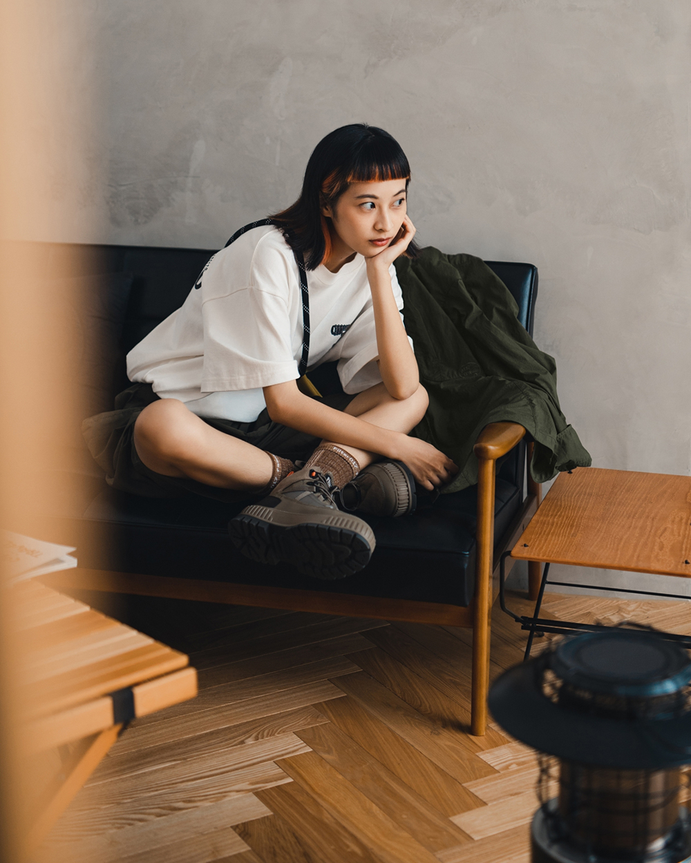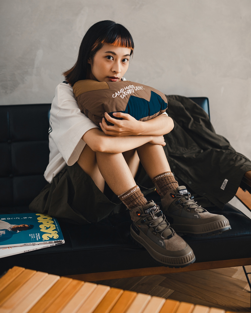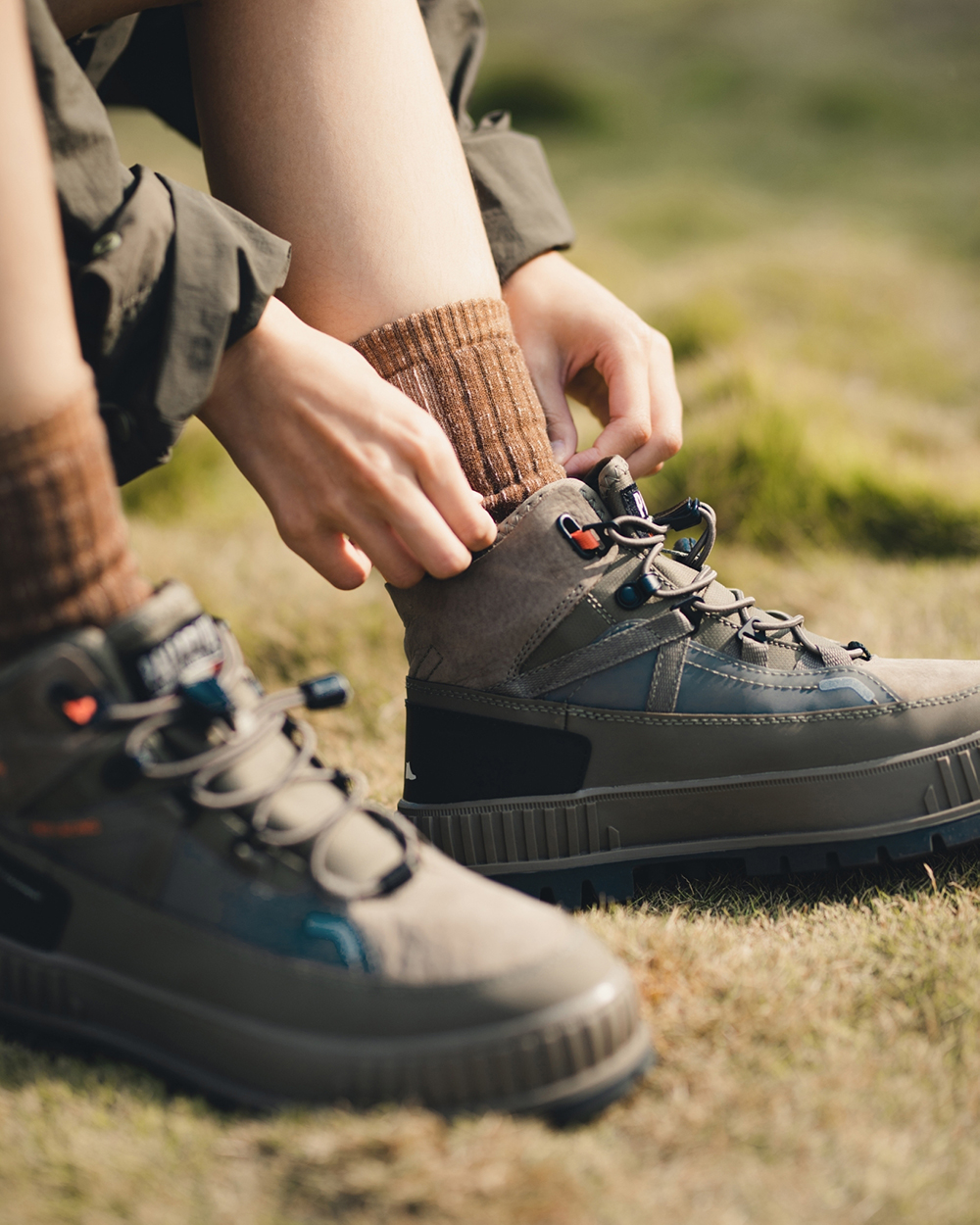 視覺設計呈現靈感源於洗鍊舊化的丹寧面料,陳藉由羊毛胚紗色及織品結構,營造出水洗落色的氛圍,並於襪身加入色塊拼接,使襪身表面富有古布拼接的輪廓與視覺,充分詮釋演繹出Filter017® 於復古流行與戶外休閒的品牌軸向。