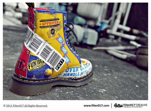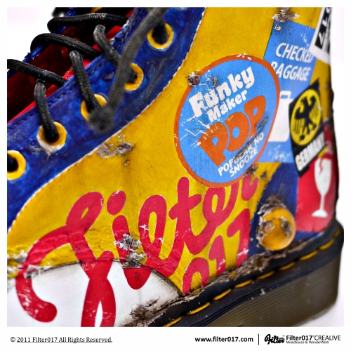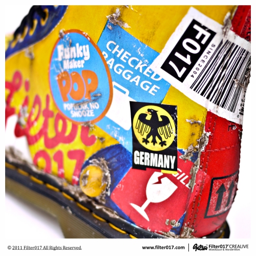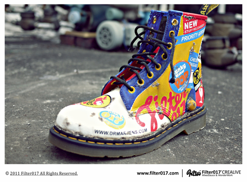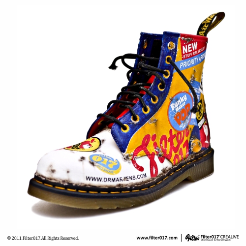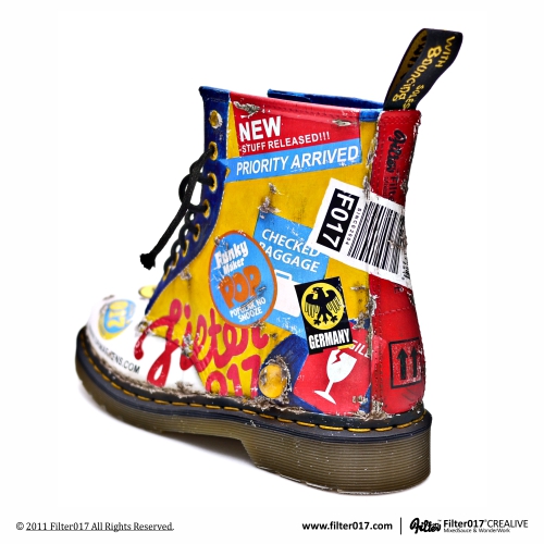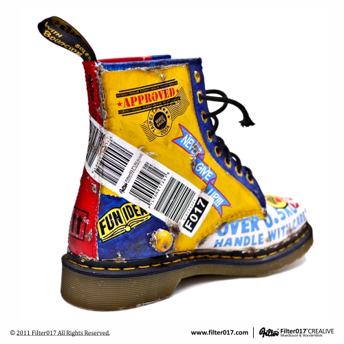 Dr. Martens 一般總是脫離不了英式搖滾與龐克機車等文化的既定印象,但是此次改裝創作Filter017透過一貫復古美式的視覺和配色,將主題設定為"行李箱"的概念,主軸上除想要呈現一只"托運老皮箱"的感覺,因此融入了不少貼紙與標籤元素,配色方面也結合了美式復古以及英國代表色,透過豐富的圖像與鮮豔的色彩,把英國工藝與美式視覺加以混合,呈現出這款命名為"POPPER'S BAGGAGE"的概念創作鞋。